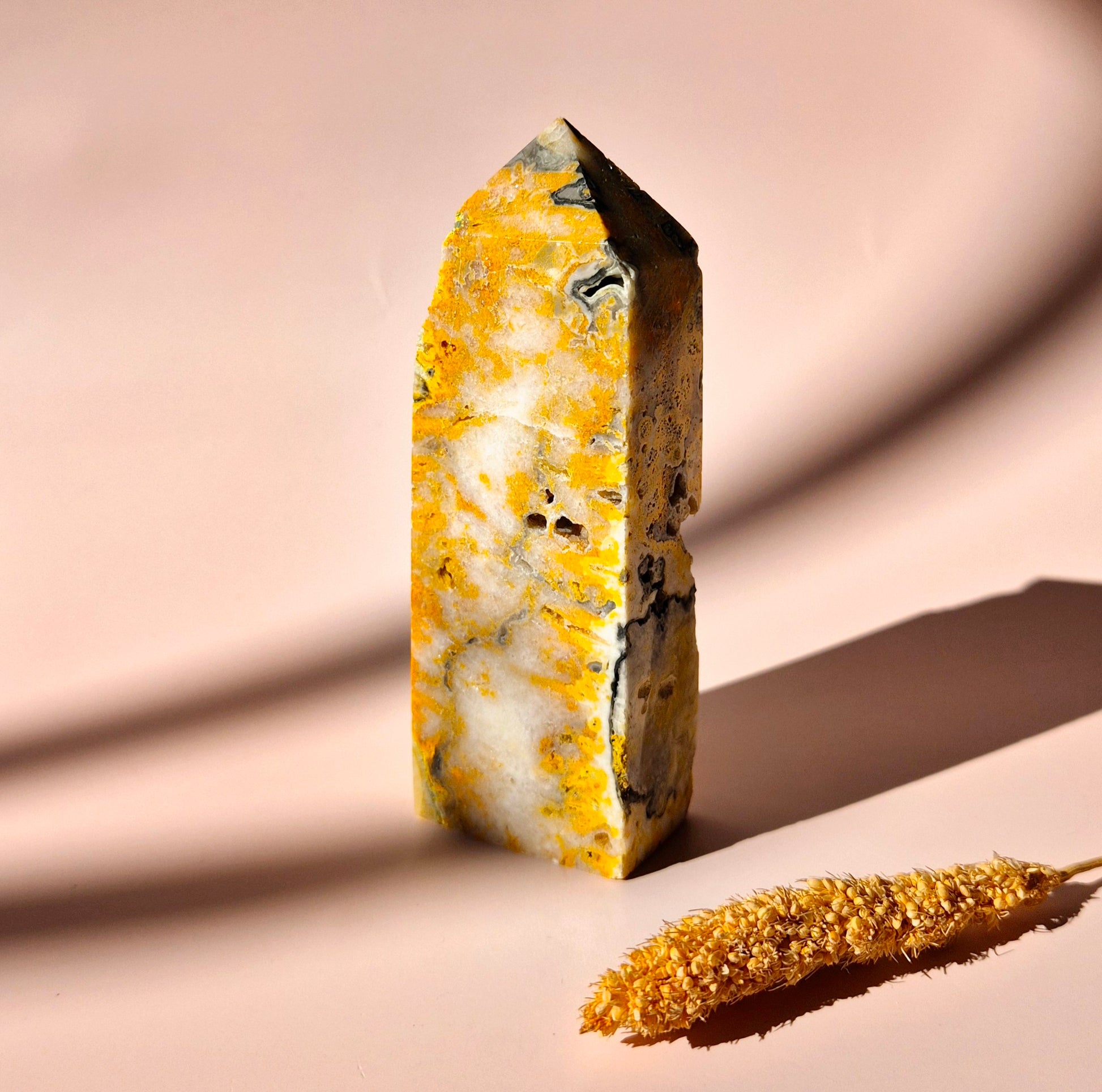 Verleihen Sie Ihrem Raum Energie mit der lebendigen Schönheit des Bumble Bee Jasper Tower. Bekannt für seine kräftigen gelben und orangefarbenen Bänder, fördert dieser einzigartige Stein Kreativität, Mut und Selbstvertrauen.