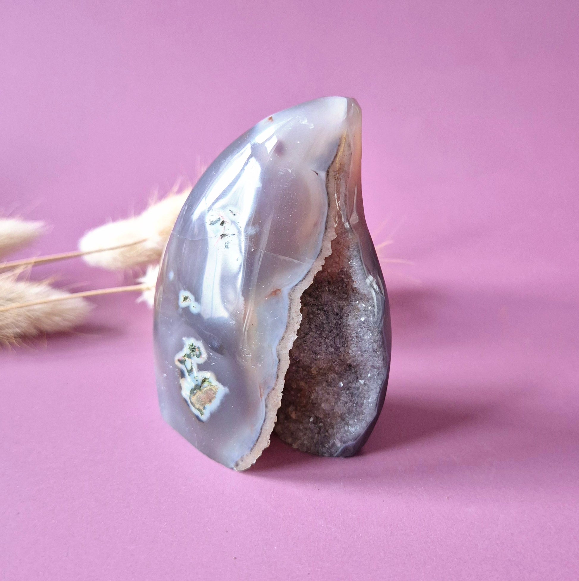 Drusenachat ist bekannt für seine erdenden Eigenschaften und die Förderung des inneren Gleichgewichts. In der Flammenform werden diese Eigenschaften besonders hervorgehoben, da die stilisierte Form Bewegung, Wachstum und spirituelle Erneuerung symbolisiert. Diese Flammen eignen sich ideal als Meditationsstein, energetisches Schmuckstück oder als einzigartiges Element in Ihrer Kristallsammlung.