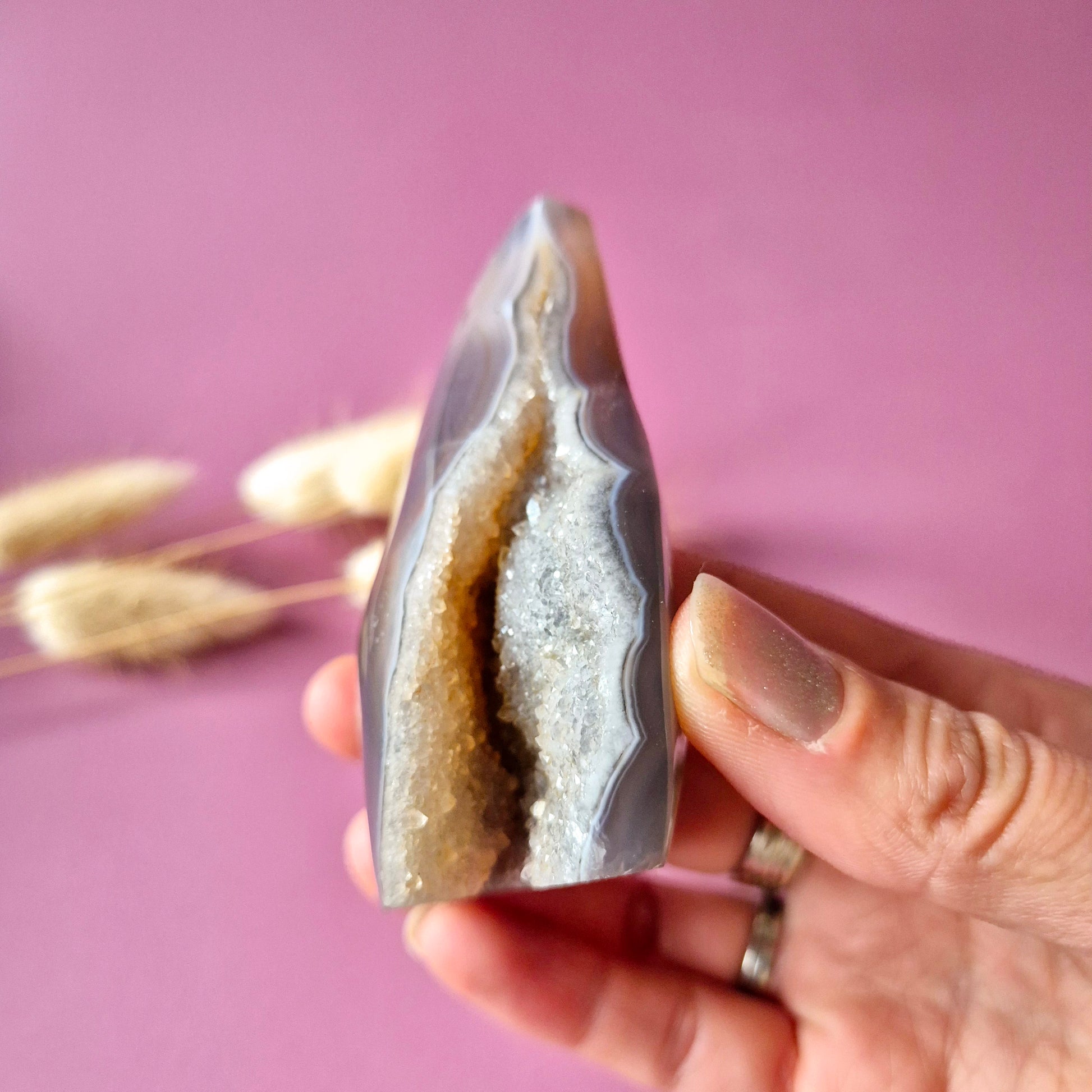 Druzy Grauer Achat - Tropfenförmiger stehender Edelsteinkristall - Nr. 12. 86 GrammDruzy Grey Agate Flame #21 134g.