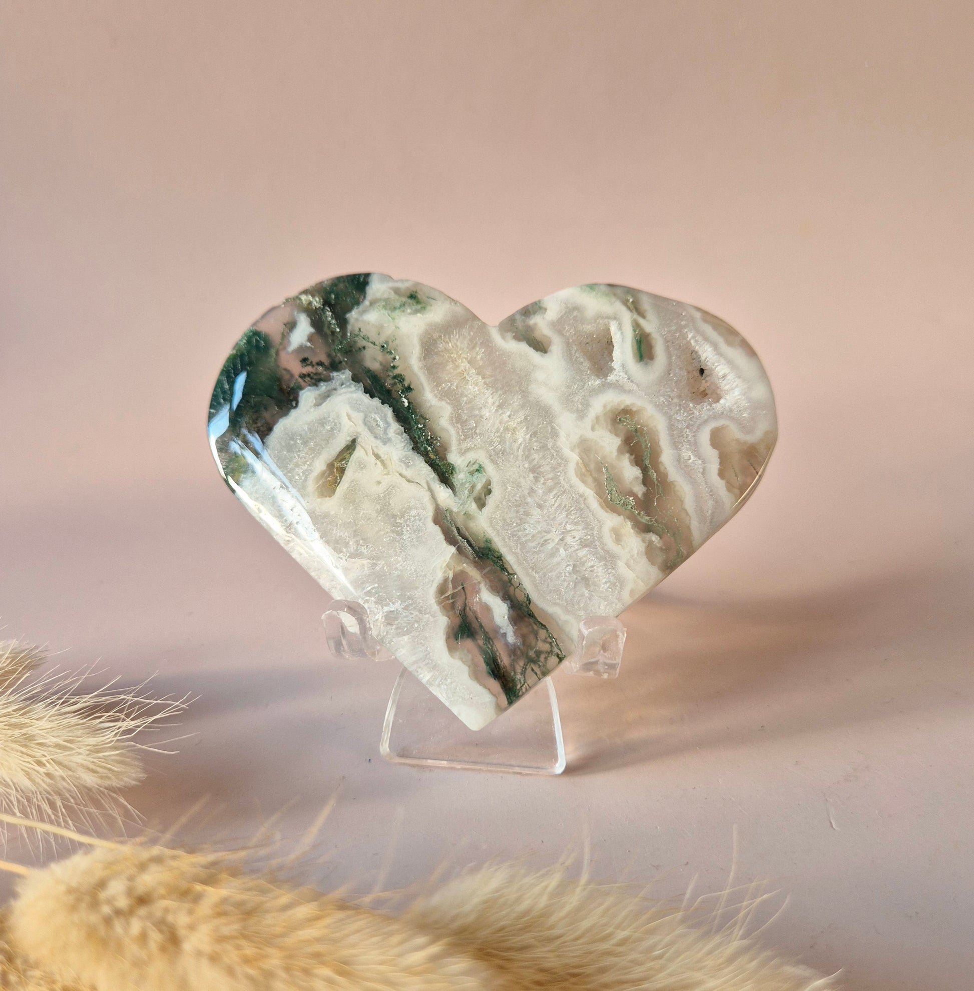 Druzy Moss Achat Herz auf Metallständer – Erdung, Gleichgewicht & natürliche Schönheit