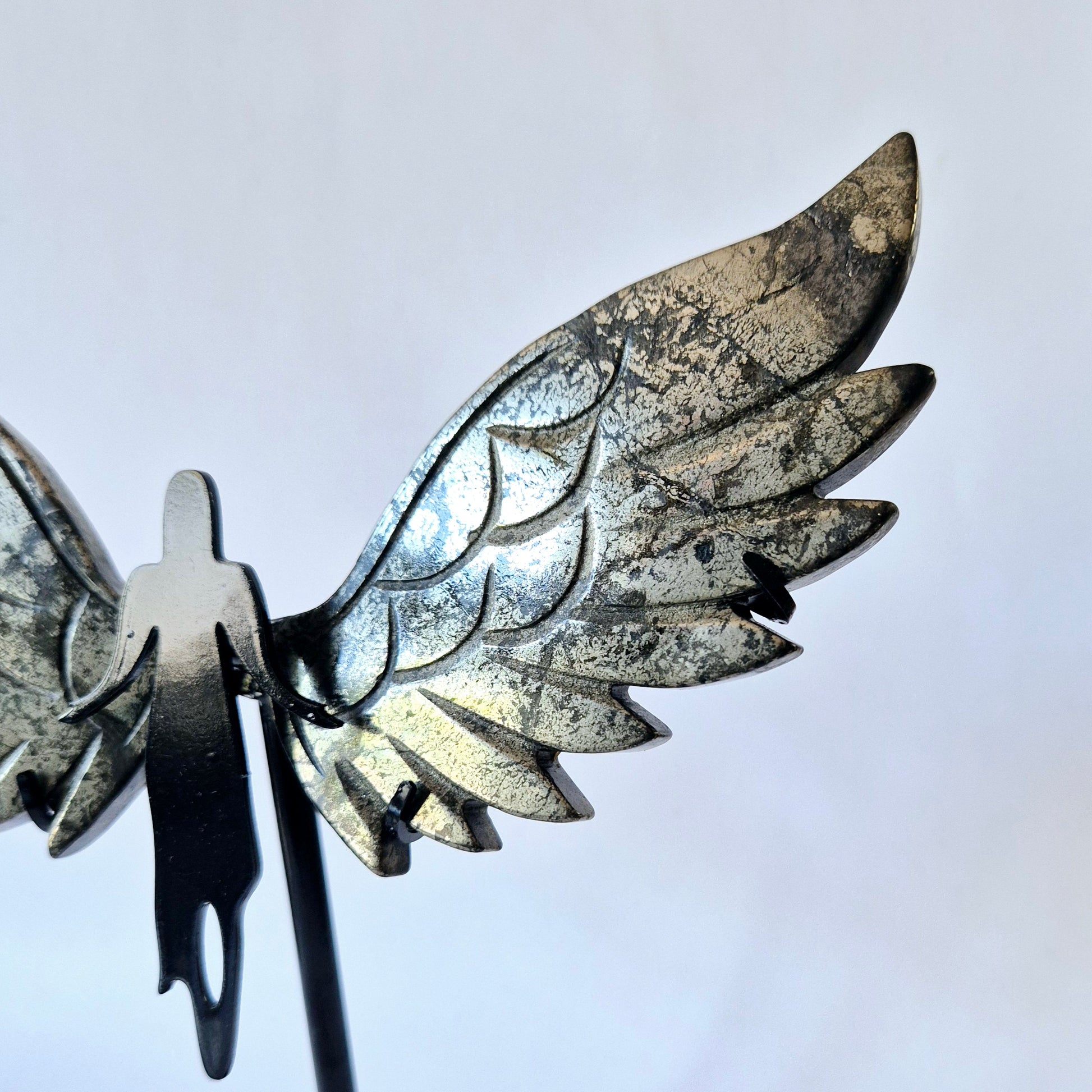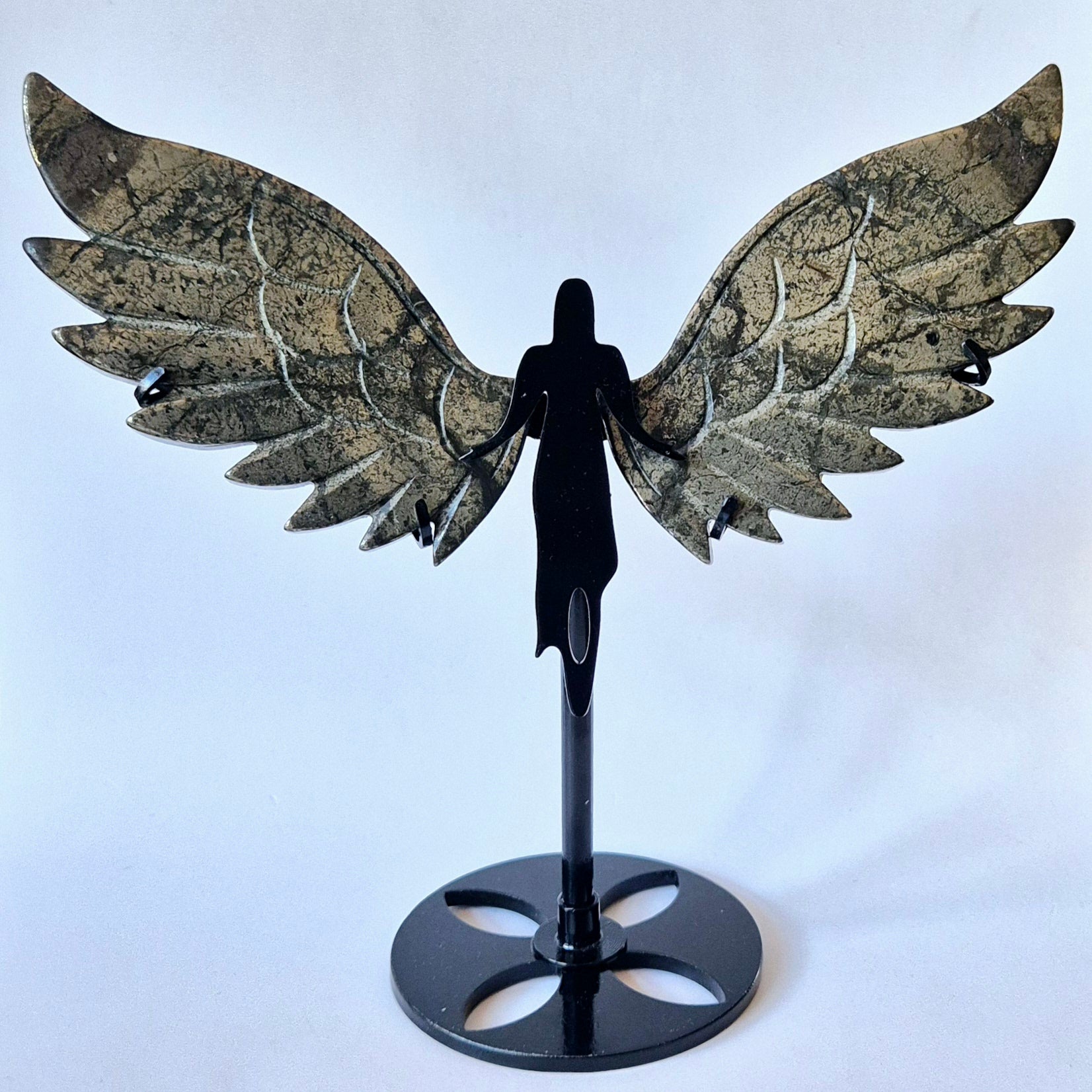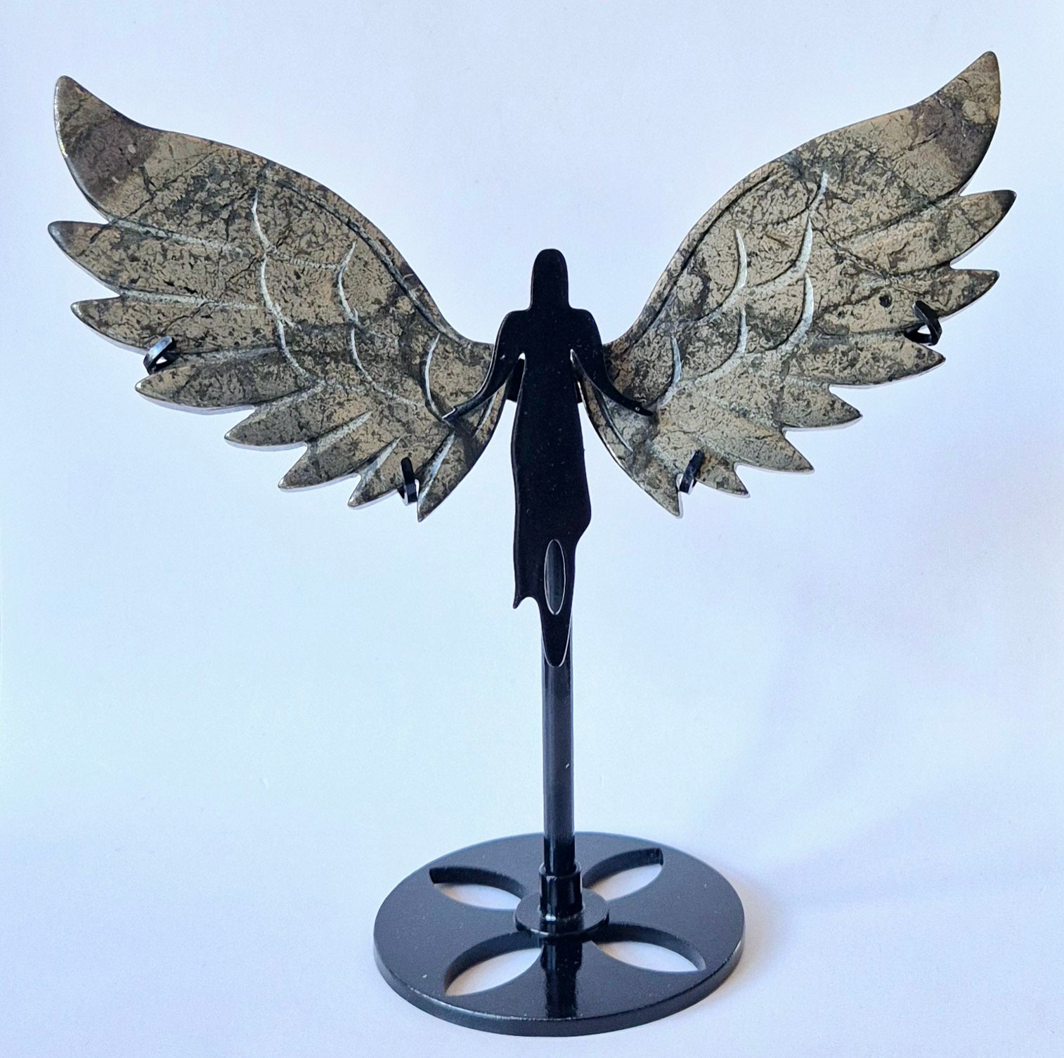 Die Flügelform symbolisiert Schutz, Freiheit und Verbindung zu höheren Energien, wodurch dieses einzigartige Kunstwerk perfekt für Meditation, energetische Heilung oder als bezauberndes Dekorationsstück in Ihrem Zuhause, Übungsraum oder heiligen Ort geeignet ist.