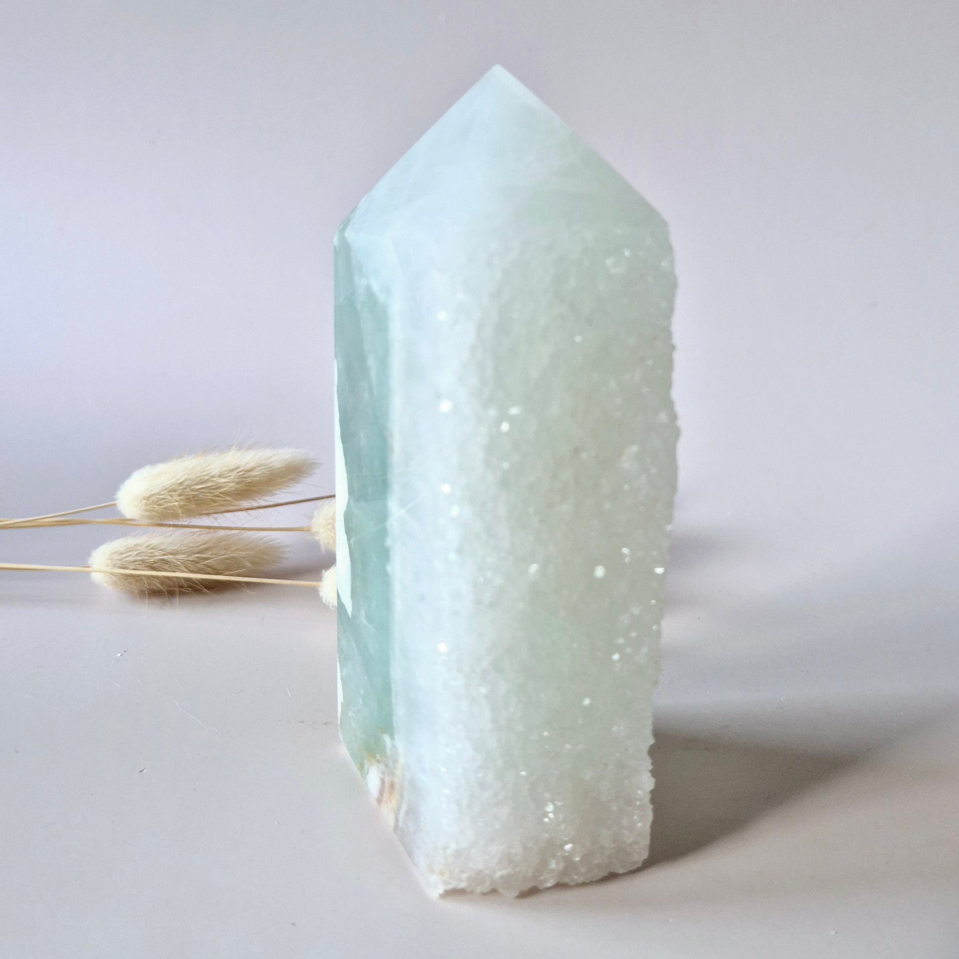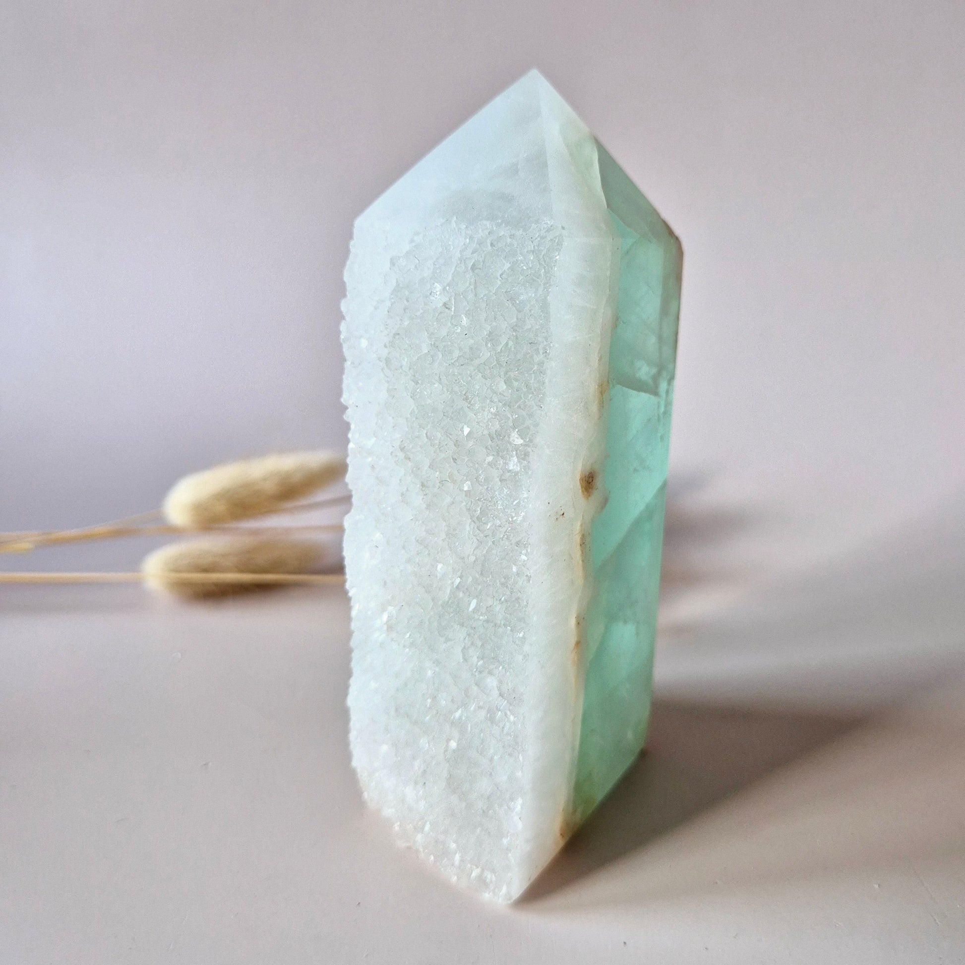 Lassen Sie sich von der beruhigenden Energie dieser grünen Fluoritspitze verzaubern, einem seltenen und besonderen Stück mit einer natürlichen Kombination aus rauen und polierten Strukturen. Die wunderschönen Schichten in sanften Grüntönen wechseln sich mit weißen und goldfarbenen Einschlüssen ab und machen jedes Stück zu einem Unikat und authentisch.