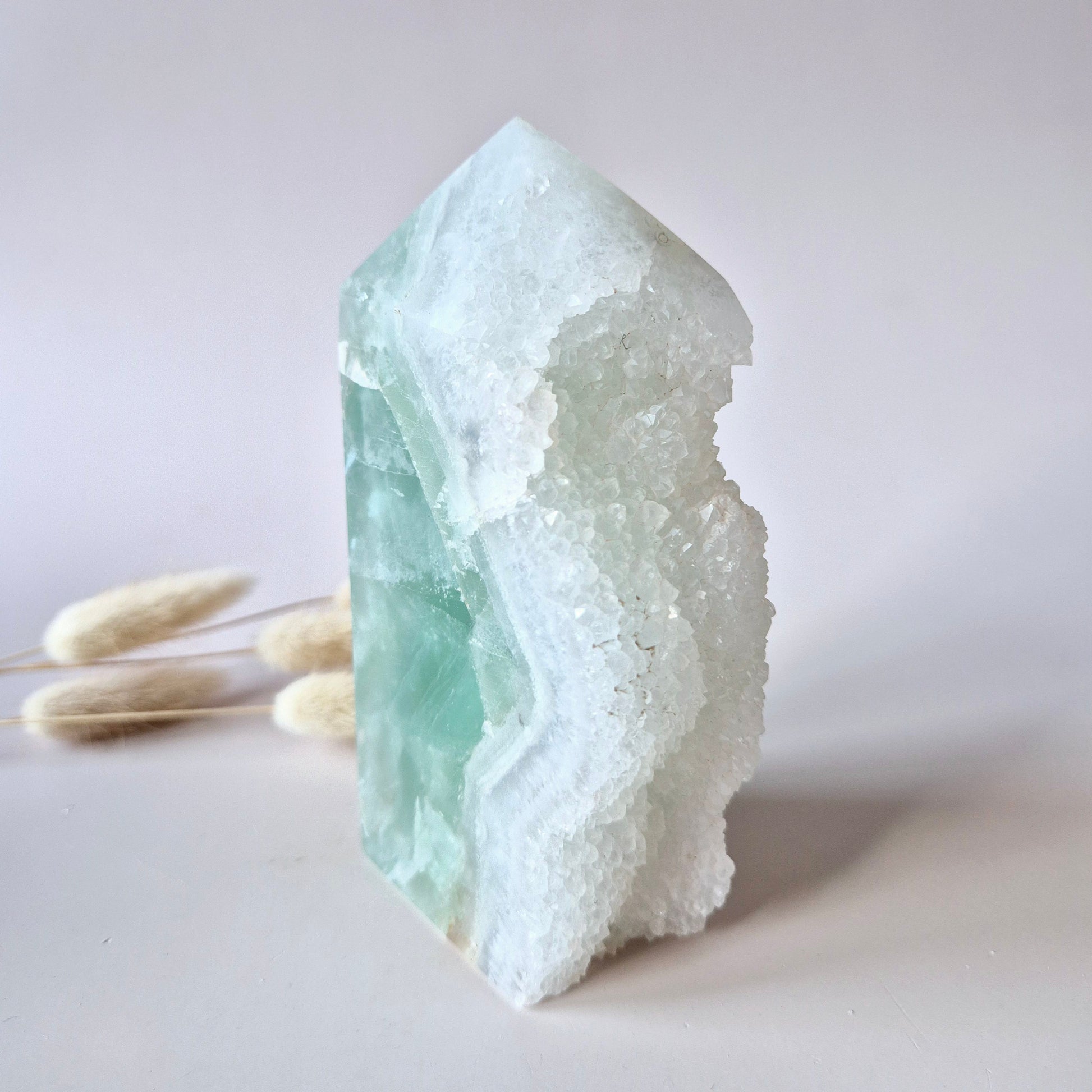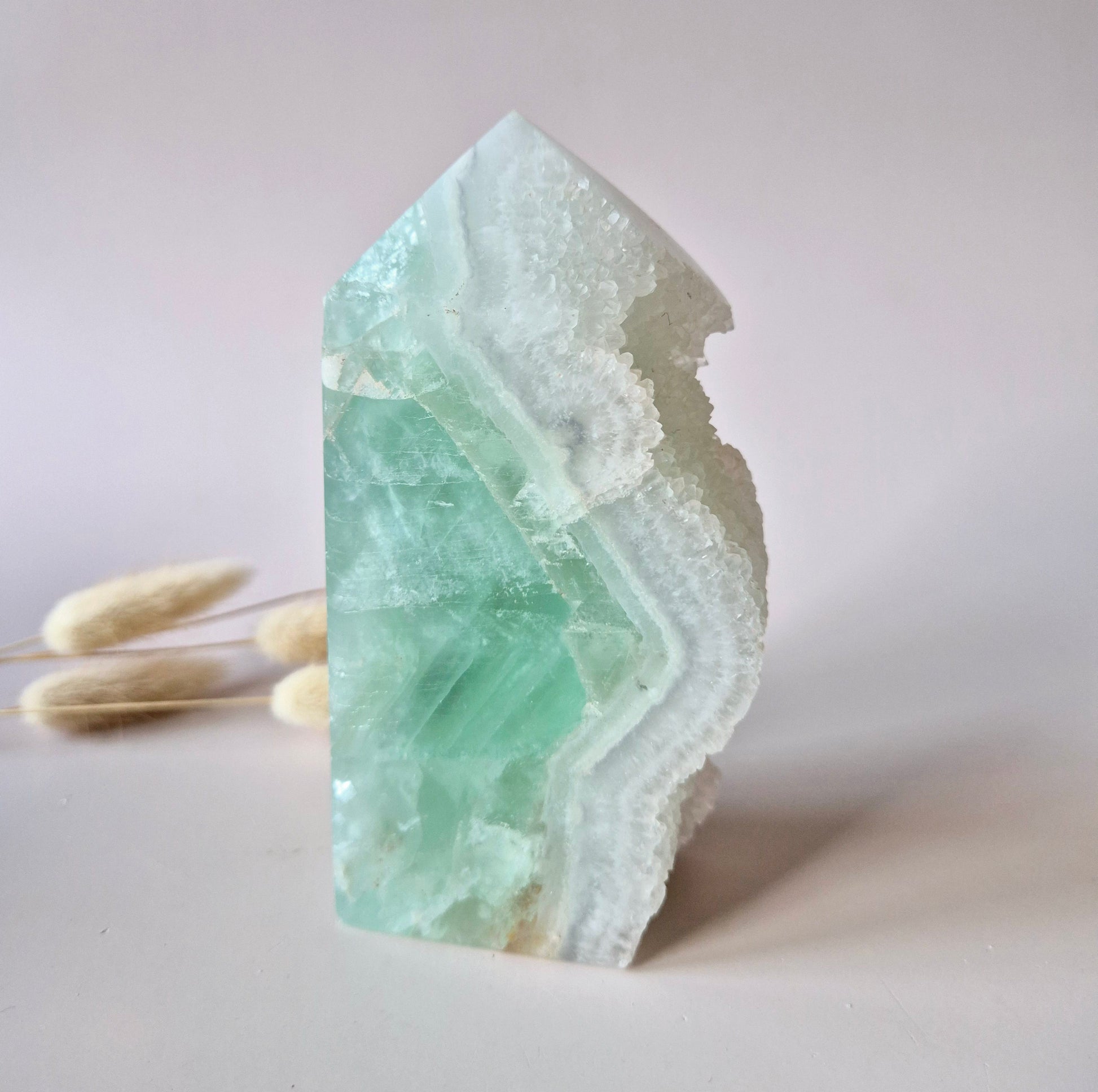 Lassen Sie sich von der beruhigenden Energie dieser grünen Fluoritspitze verzaubern, einem seltenen und besonderen Stück mit einer natürlichen Kombination aus rauen und polierten Strukturen. Die wunderschönen Schichten in sanften Grüntönen wechseln sich mit weißen und goldfarbenen Einschlüssen ab und machen jedes Stück zu einem Unikat und authentisch.