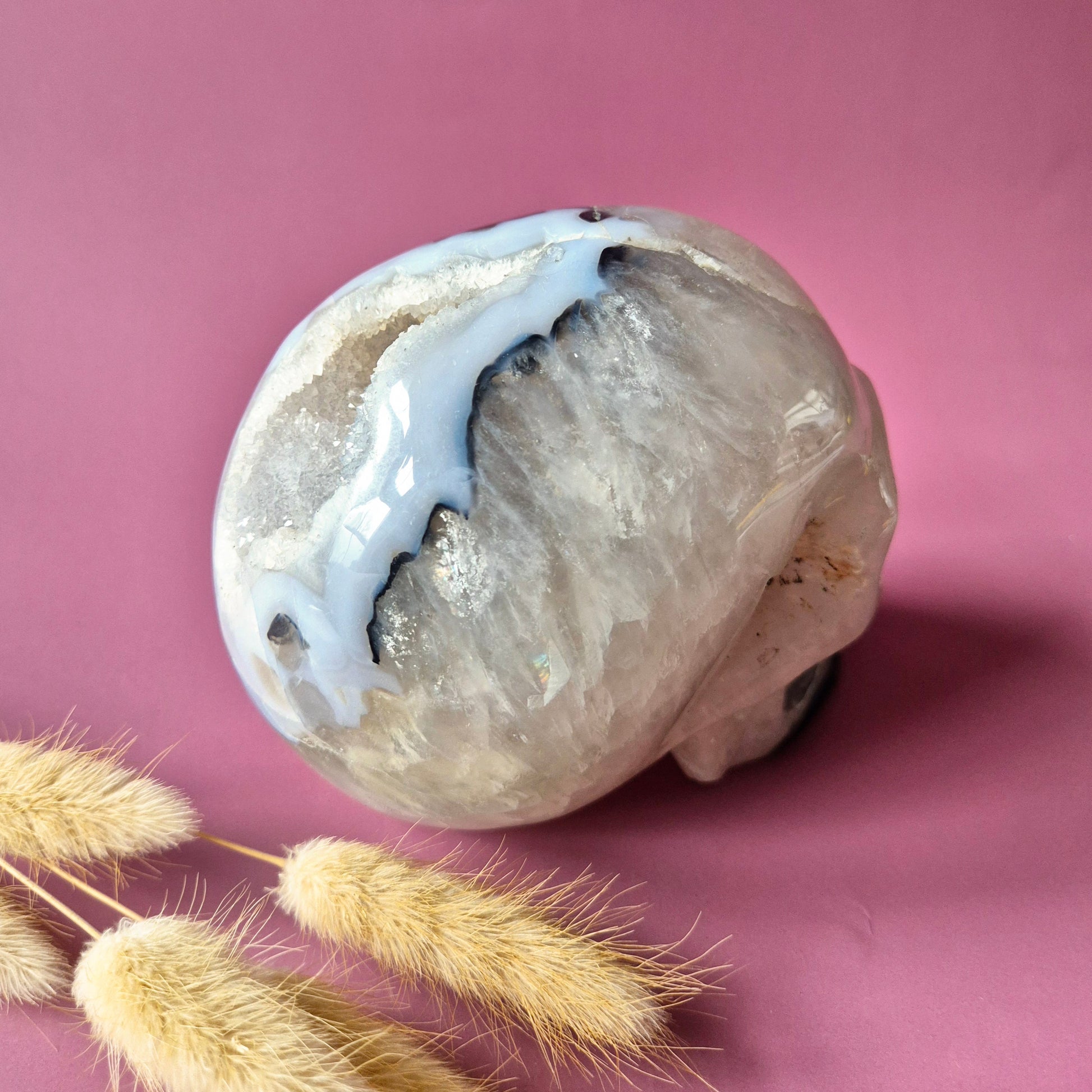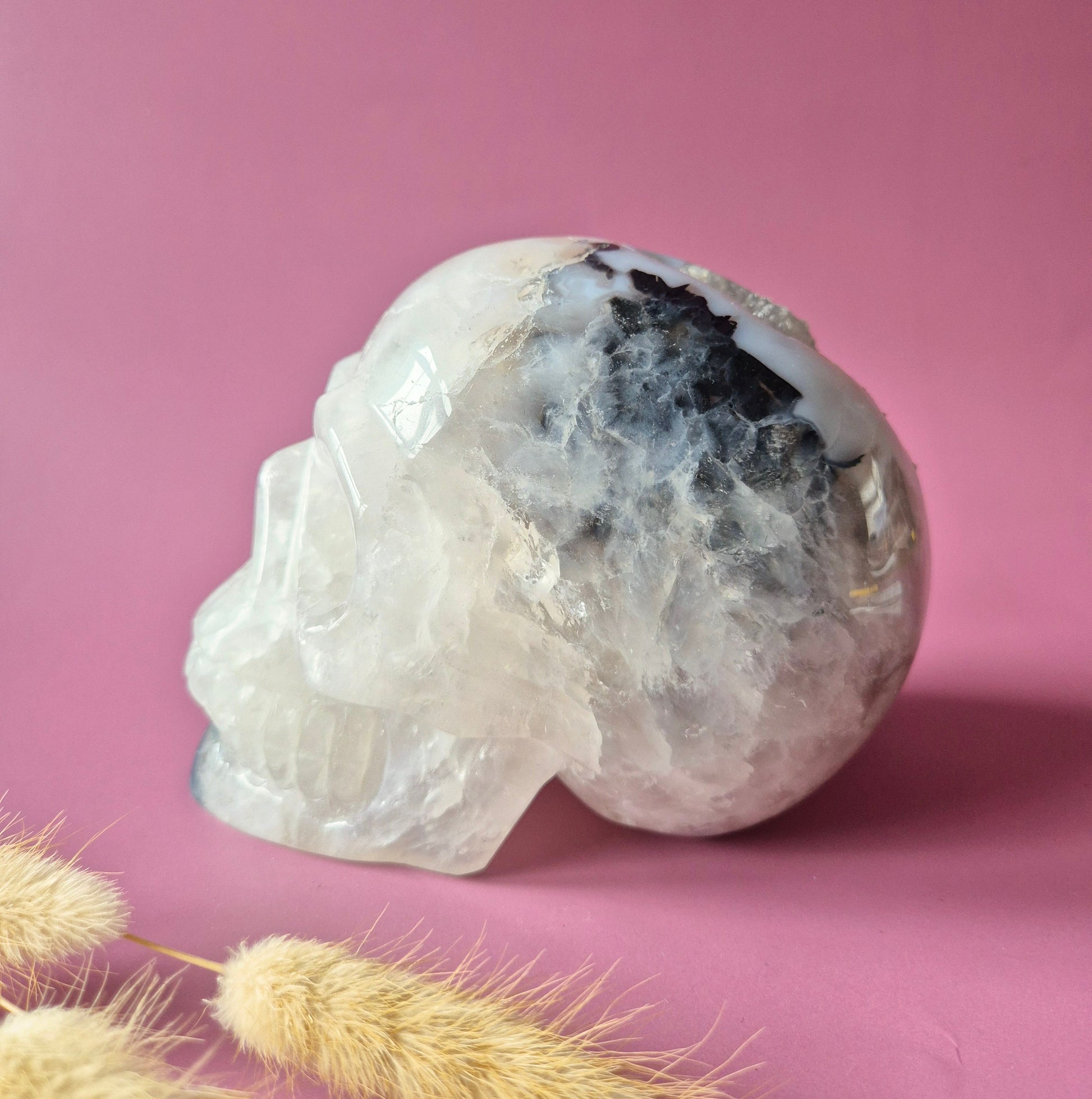 Die Totenkopfform symbolisiert Transformation, die Weisheit der Vorfahren und spirituelle Tiefe. Kombiniert mit der erdenden Energie des Moosachats und der erhöhten Schwingung der Druse entsteht ein kraftvolles energetisches Werkzeug für tiefe Meditation, Heilarbeit oder als magisches Dekorationsobjekt.