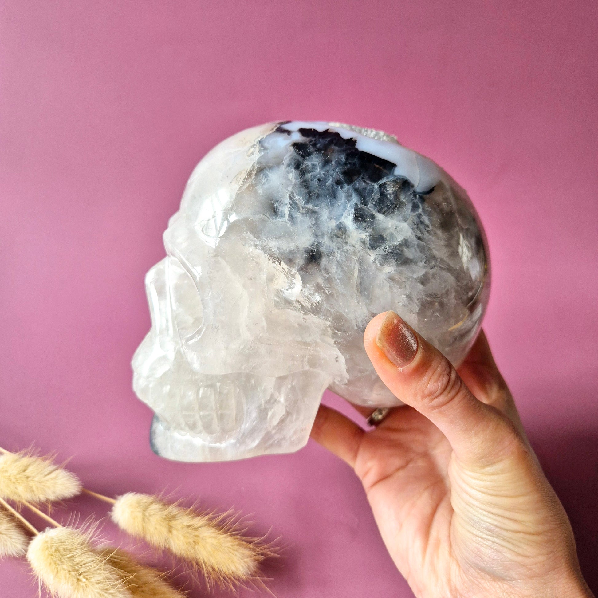 Dieser Drusenschädel aus Moosachat ist ein wahres Kunstwerk der Natur. Aus echtem Moosachat geschnitzt und mit wunderschönen Drusentaschen (kleinen Kristallwucherungen in Hohlräumen) verziert, vereint dieses Stück rohe Kraft und raffinierte Schönheit. Jedes Stück hat seine eigene Farbpalette aus Grün-, Weiß- und manchmal sogar Erdtönen – mit Adern und Mooseinschlüssen, die einer Miniaturlandschaft ähneln.