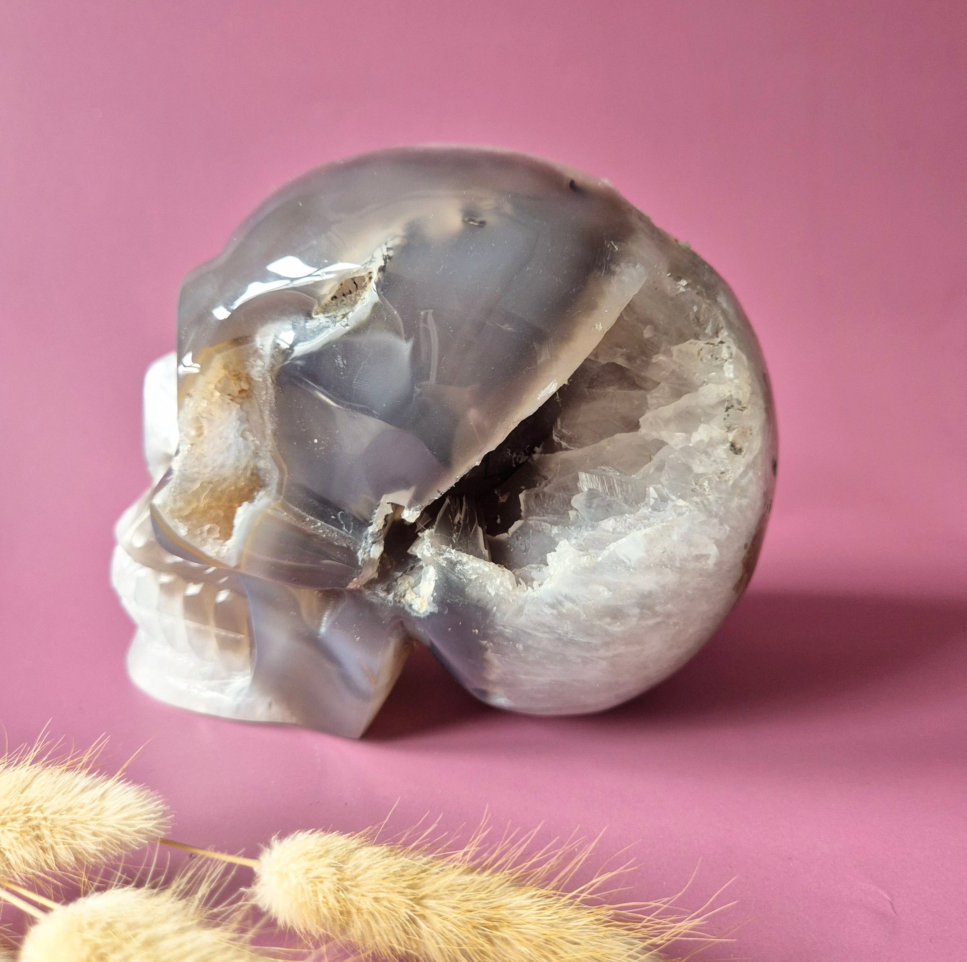 Die Totenkopfform symbolisiert Transformation, die Weisheit der Vorfahren und spirituelle Tiefe. Kombiniert mit der erdenden Energie des Moosachats und der erhöhten Schwingung der Druse entsteht ein kraftvolles energetisches Werkzeug für tiefe Meditation, Heilarbeit oder als magisches Dekorationsobjekt.