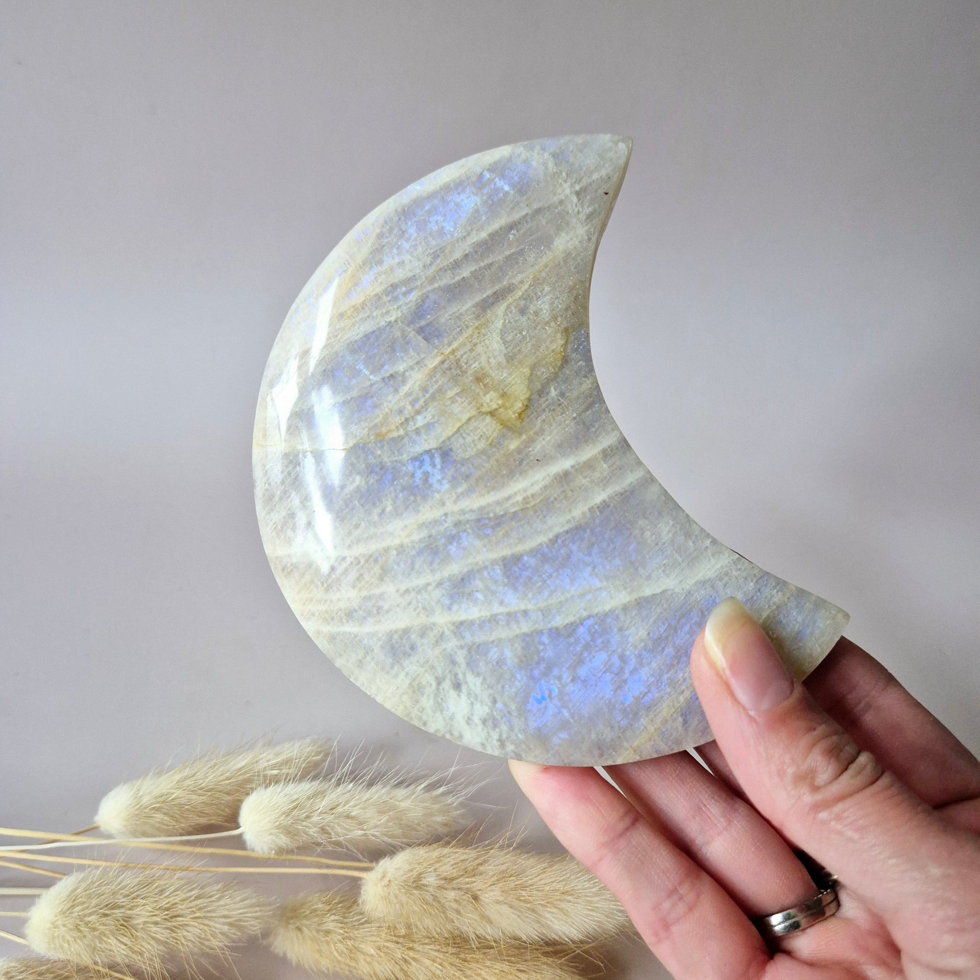 Diese super auffälligen blauen Mondsteinmonde (6-8 cm) sind ein wahrer Zauber! Mit ihrem mystischen blauen Leuchten und der tiefen Verbindung zur Mondenergie sind sie perfekt für intuitive Entwicklung, emotionales Gleichgewicht und spirituelle Heilung.