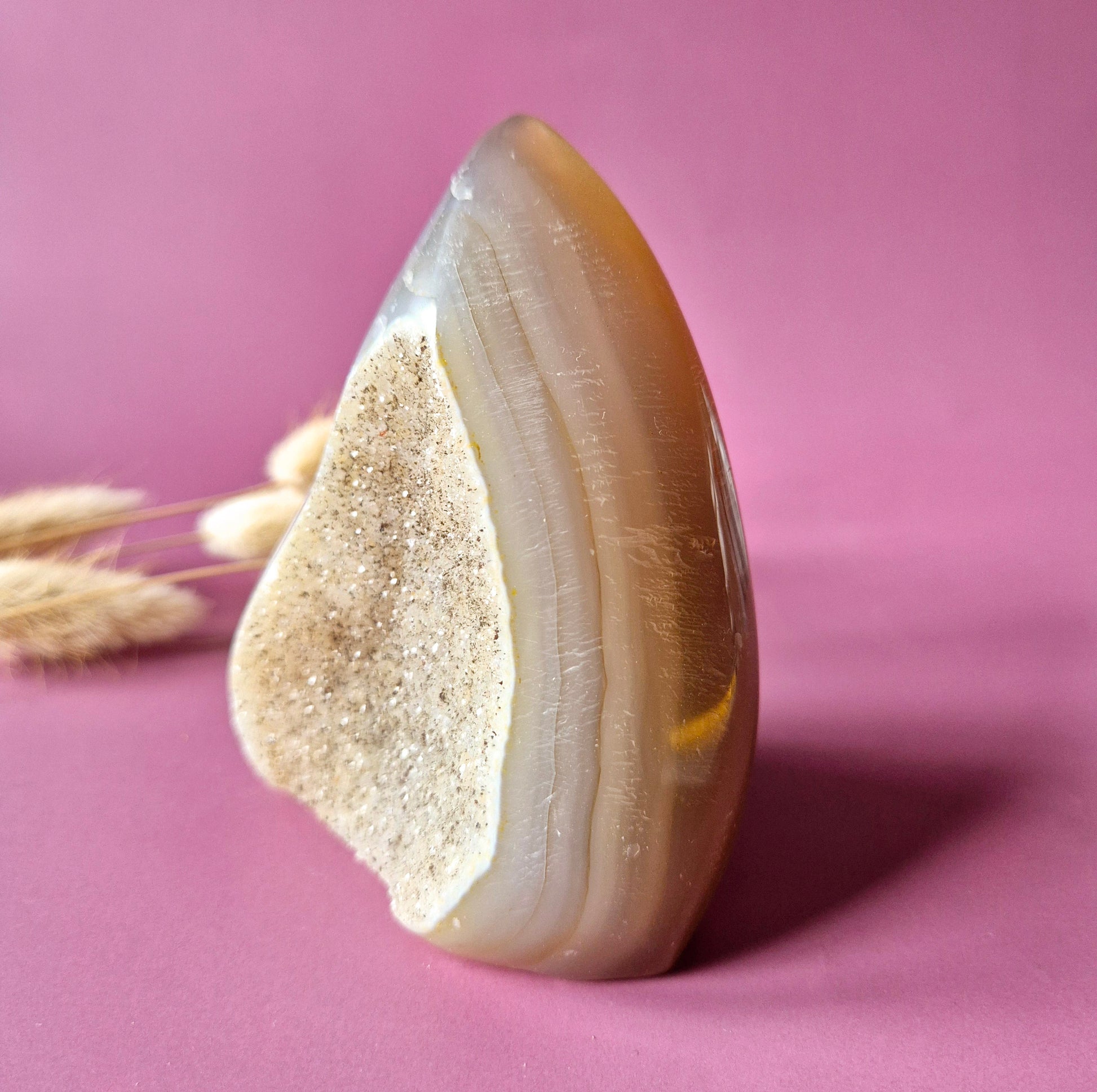 Druzy Grauer Achat - Tropfenförmiger stehender Edelsteinkristall - Nr. 12. 86 GrammDruzy Grey Agate Flame #11 338g.
