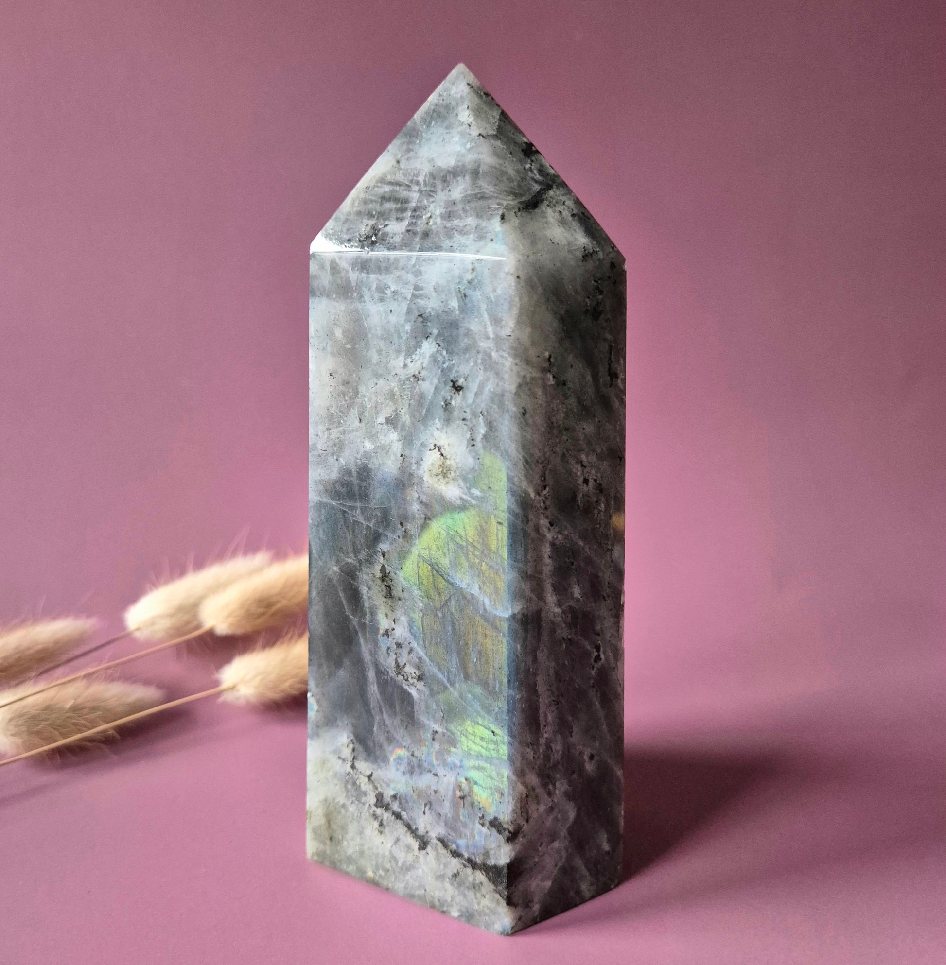 Bringen Sie Magie in Ihr Leben mit einem auffälligen Labradoritturm, der sowohl eine visuelle als auch eine energetische Wirkung hat!