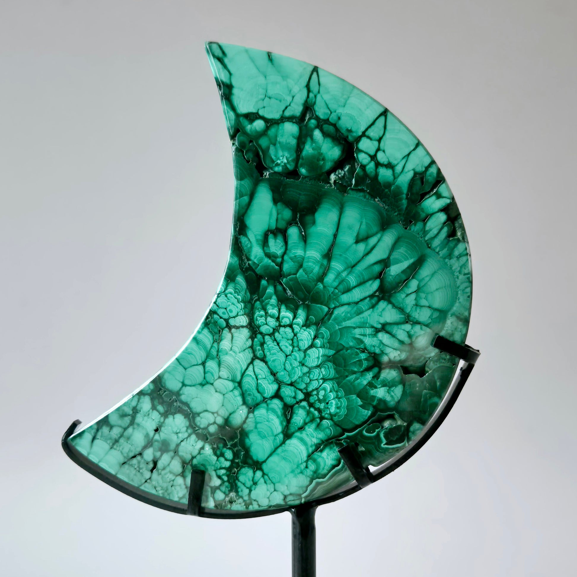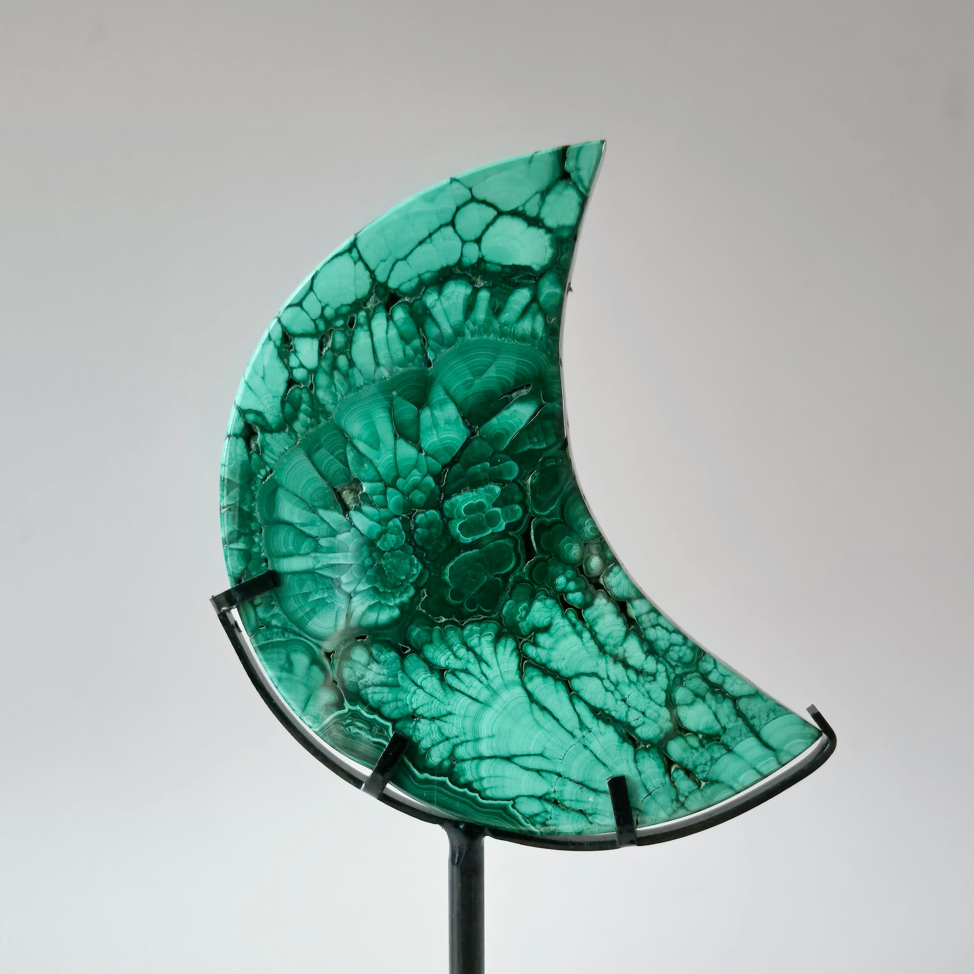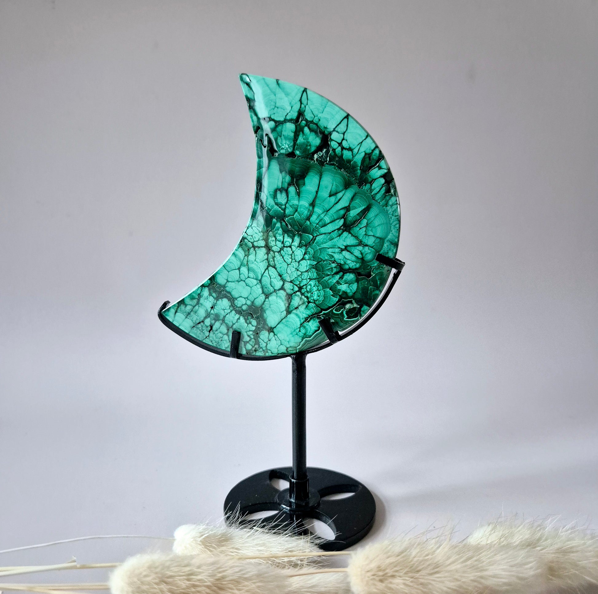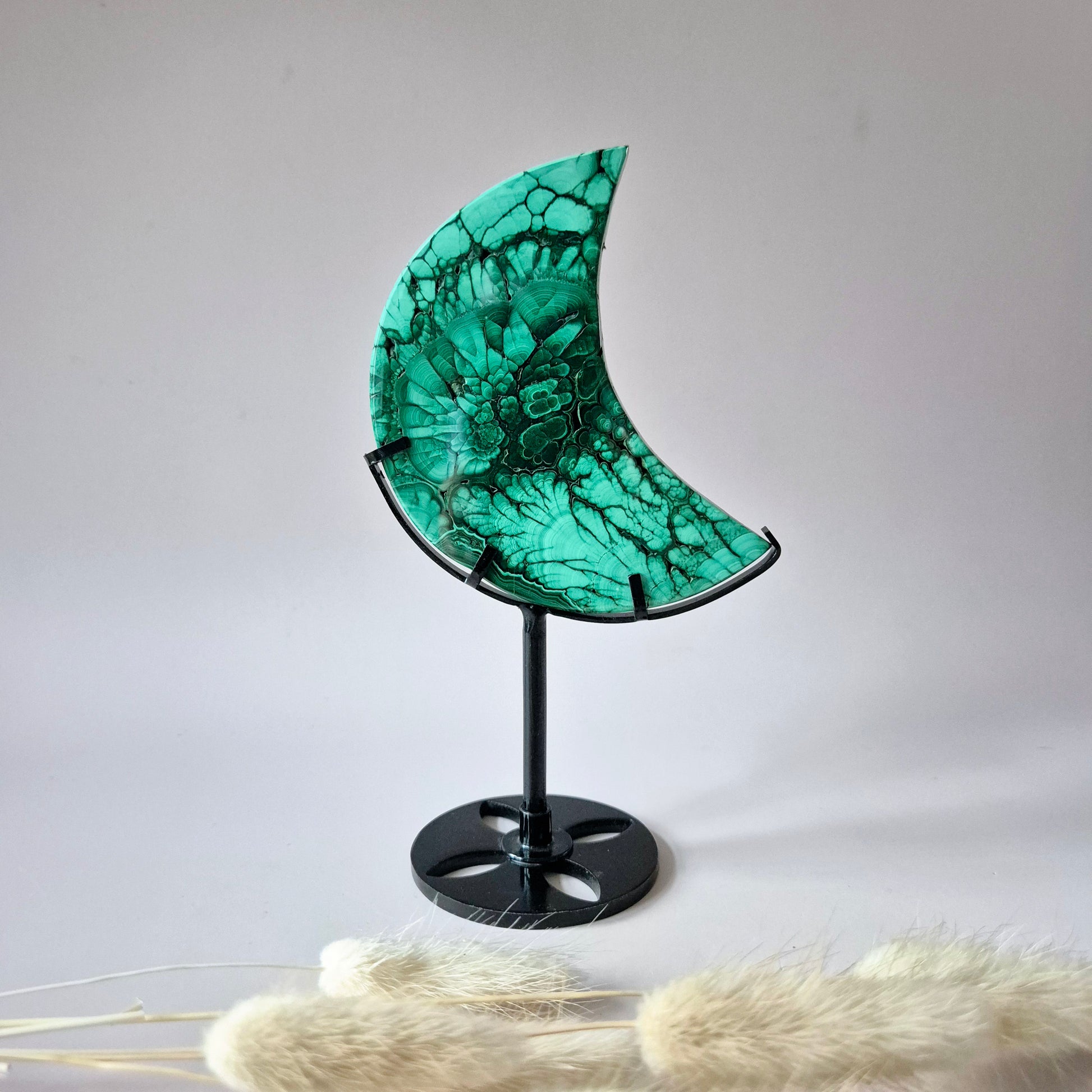 Breng rust, bescherming en een vleugje magie in je interieur met deze prachtige malachiet maan op metalen standaard.
