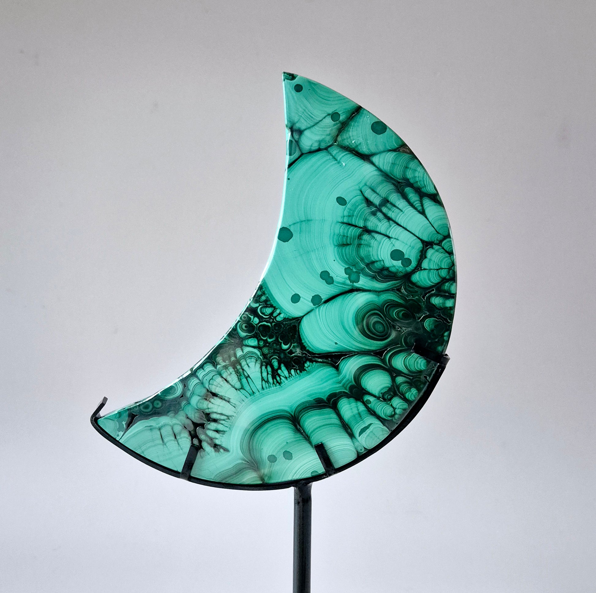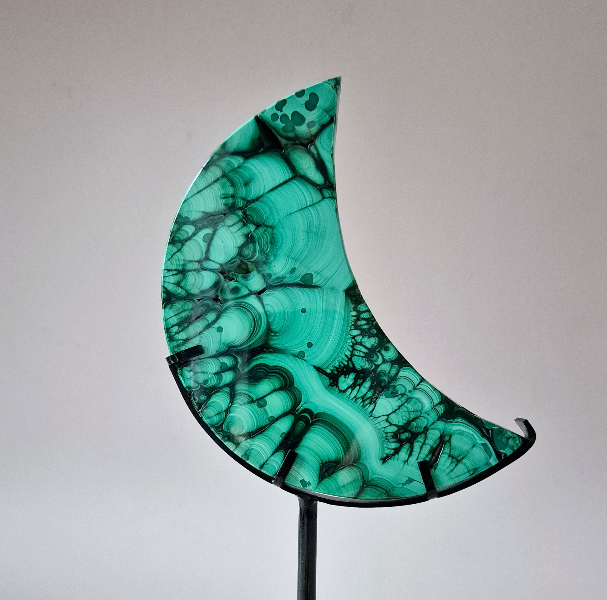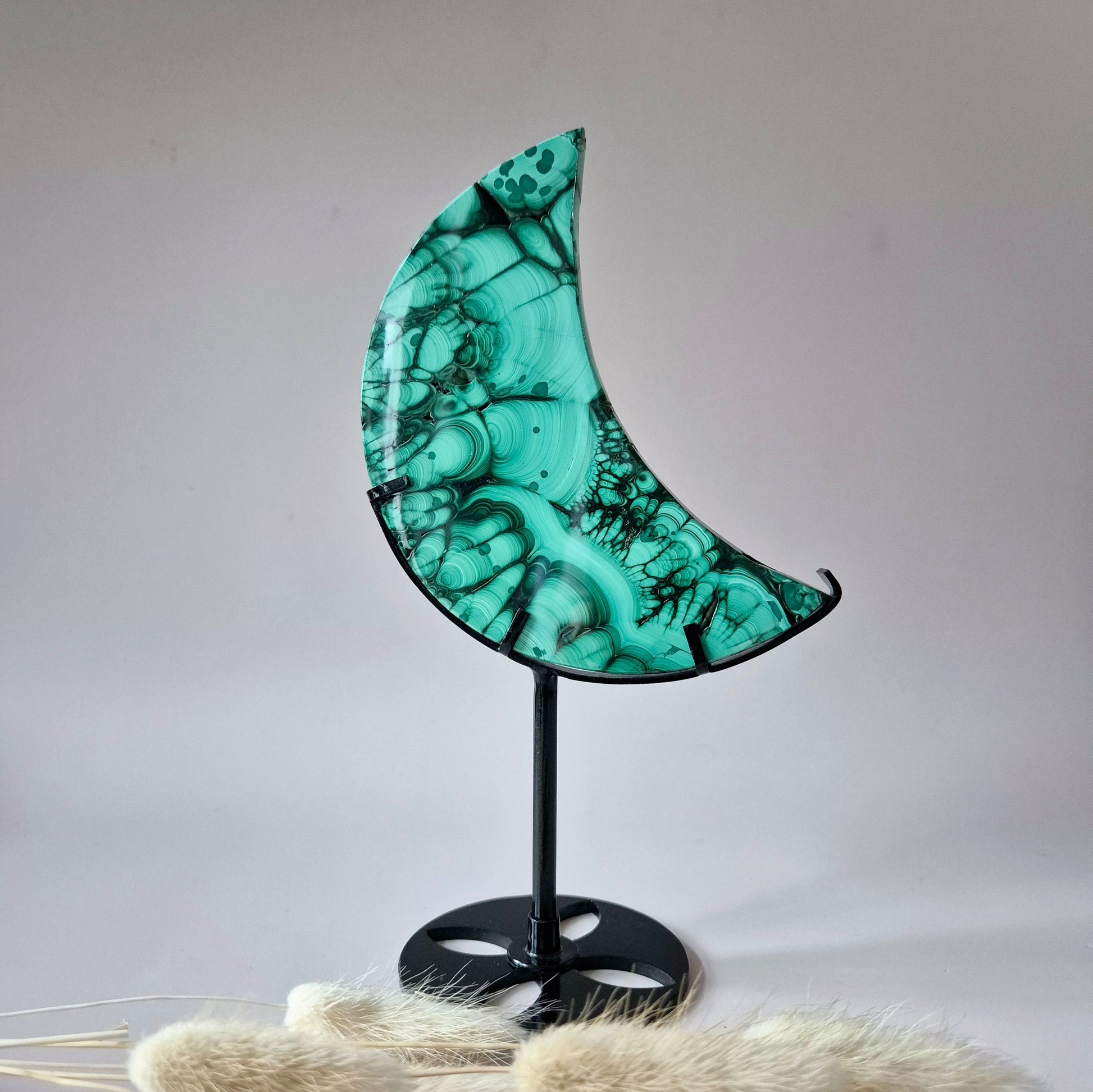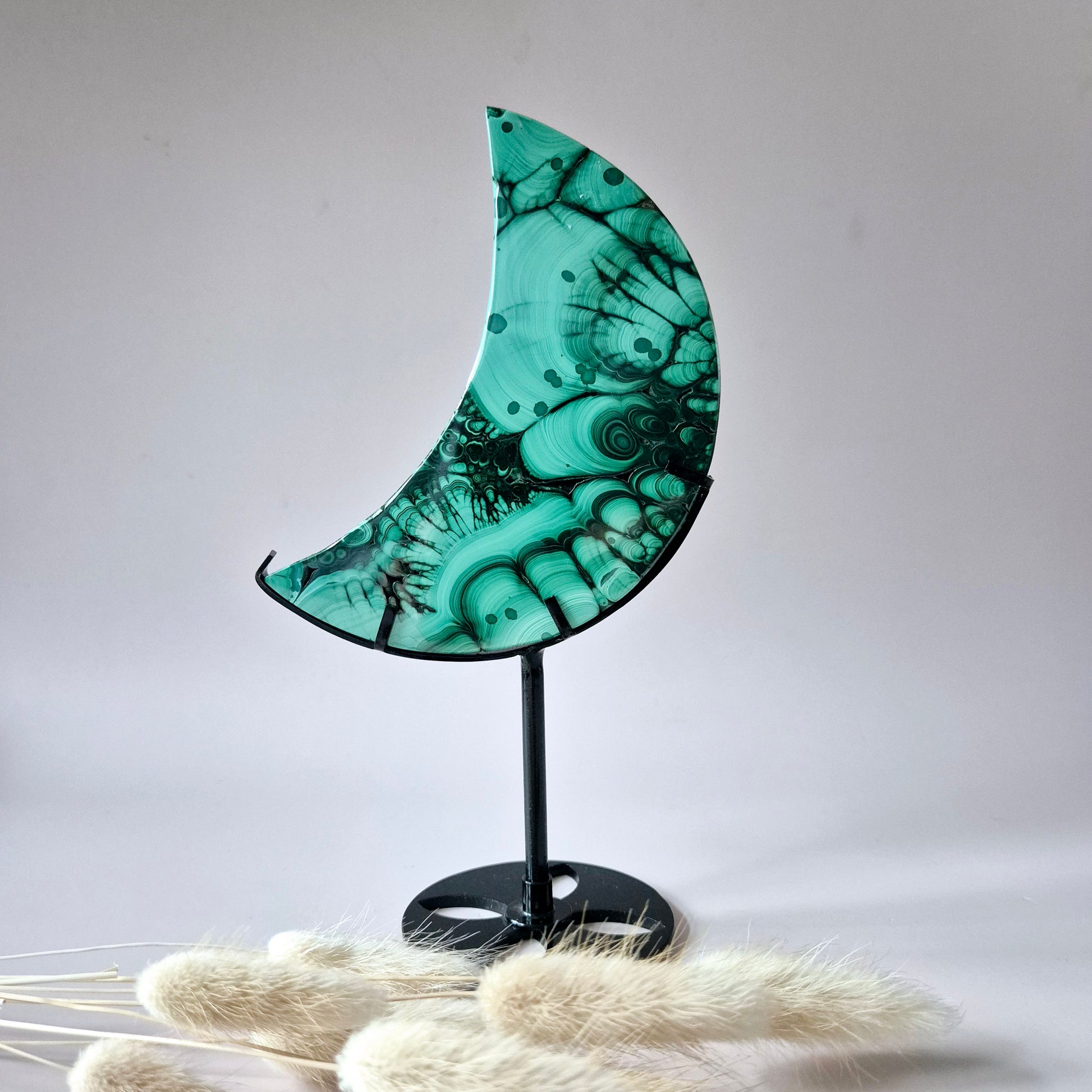 Breng rust, bescherming en een vleugje magie in je interieur met deze prachtige malachiet maan op metalen standaard.