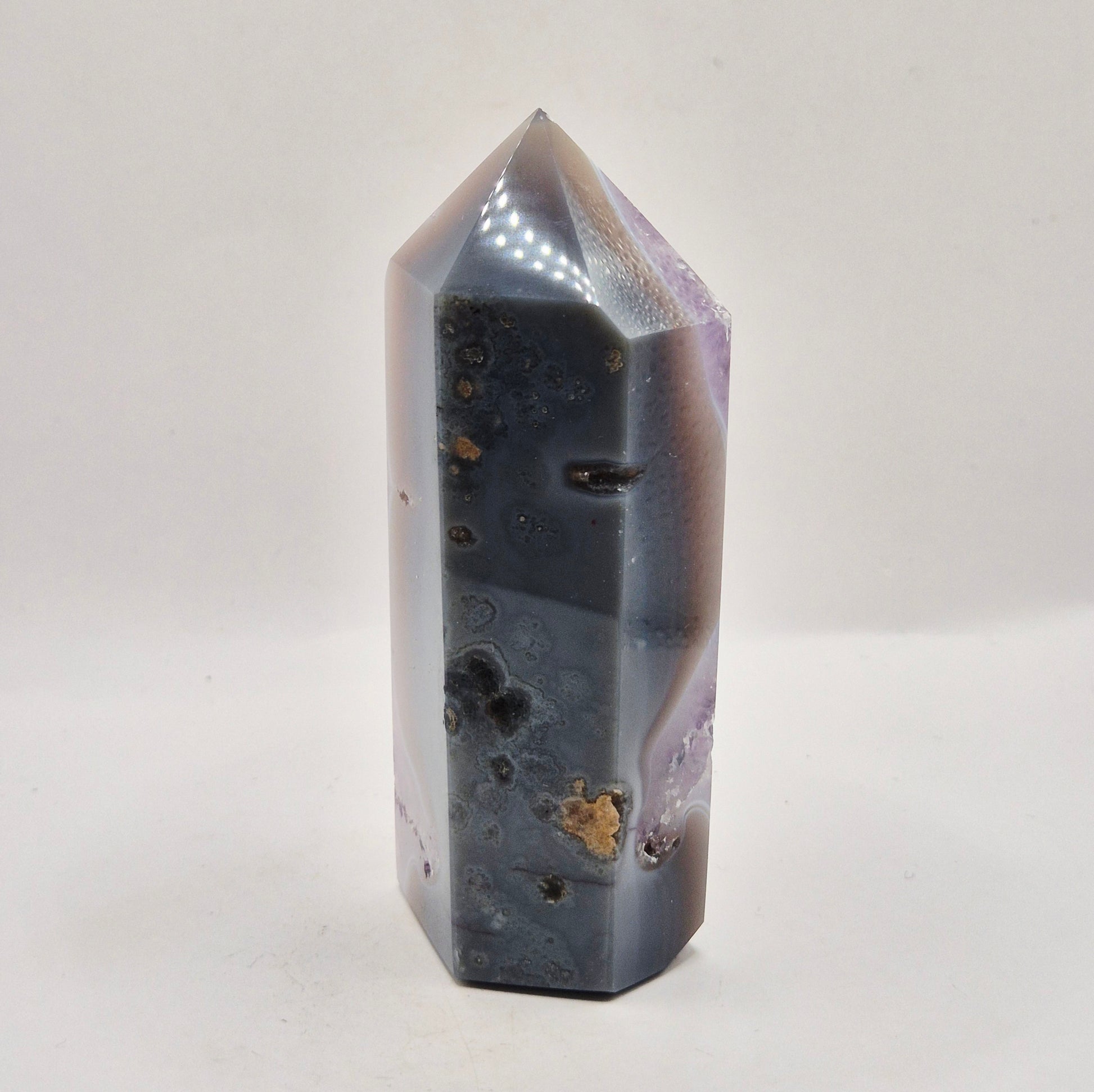 Deze hoogwaardige Amethist Agaat punt uit Uruguay is een indrukwekkend en uniek statementstuk van 243gram. Een zeldzame combinatie van diepe paarse amethistkristallen, en krachtige natuurlijke agaatbanden in grijs- en antraciettinten.