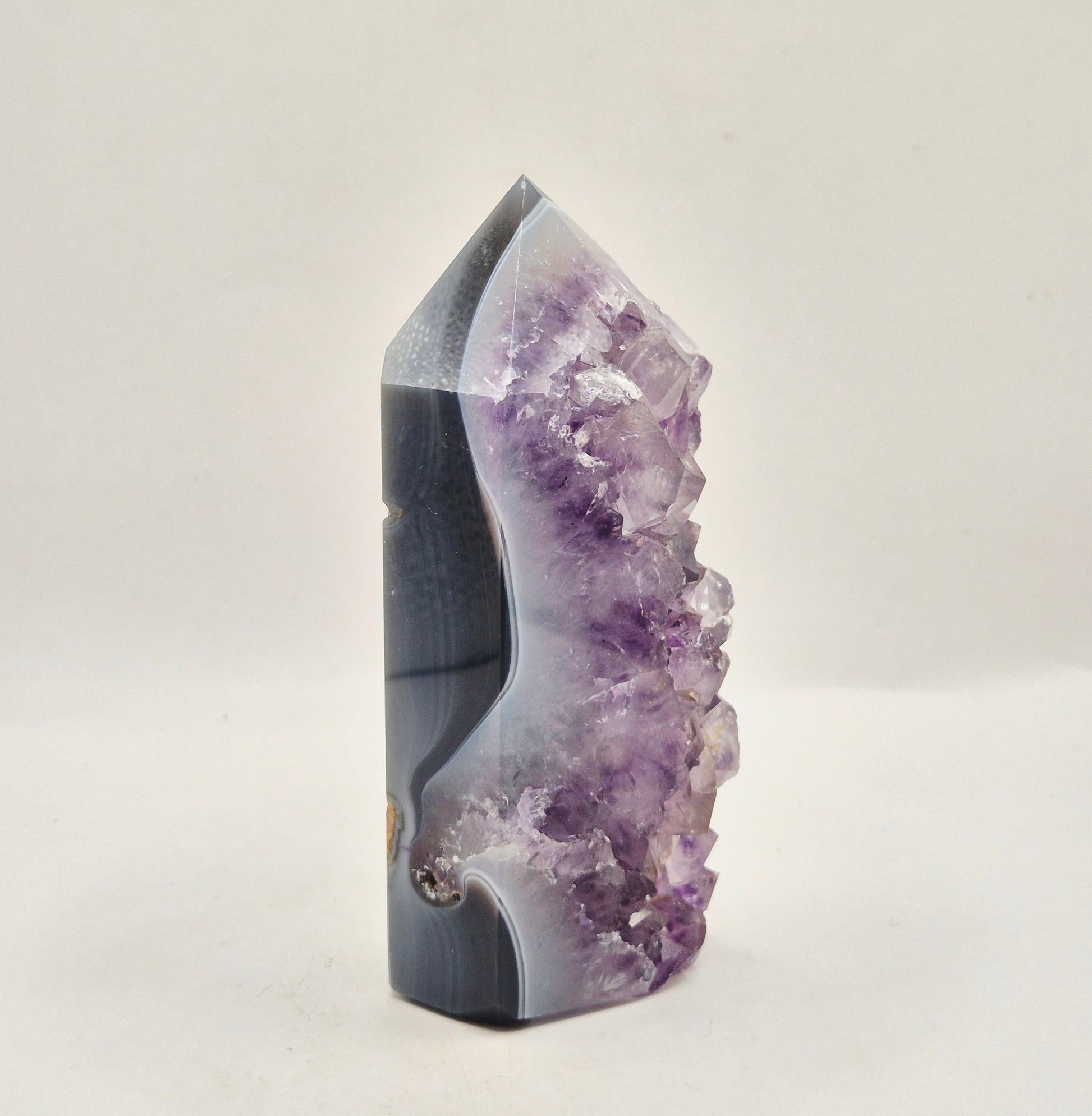 De voorzijde toont een schitterende druzy opening met intens paarse kristallen. De zijkanten onthullen natuurlijke agaatbanden die in vloeiende lagen door het stuk lopen – een prachtig samenspel van kracht en zachtheid.