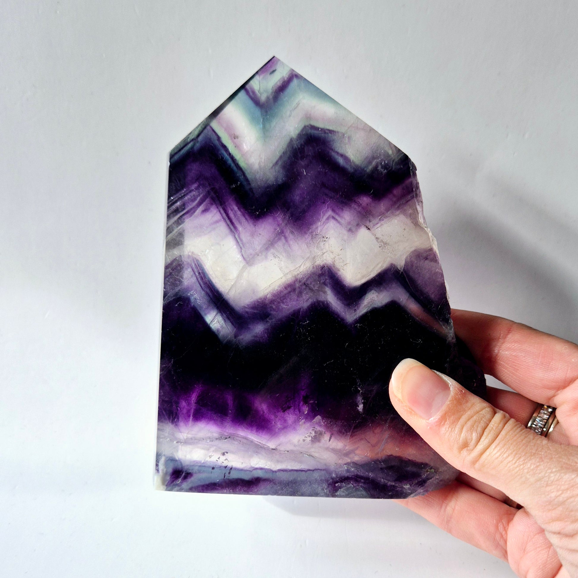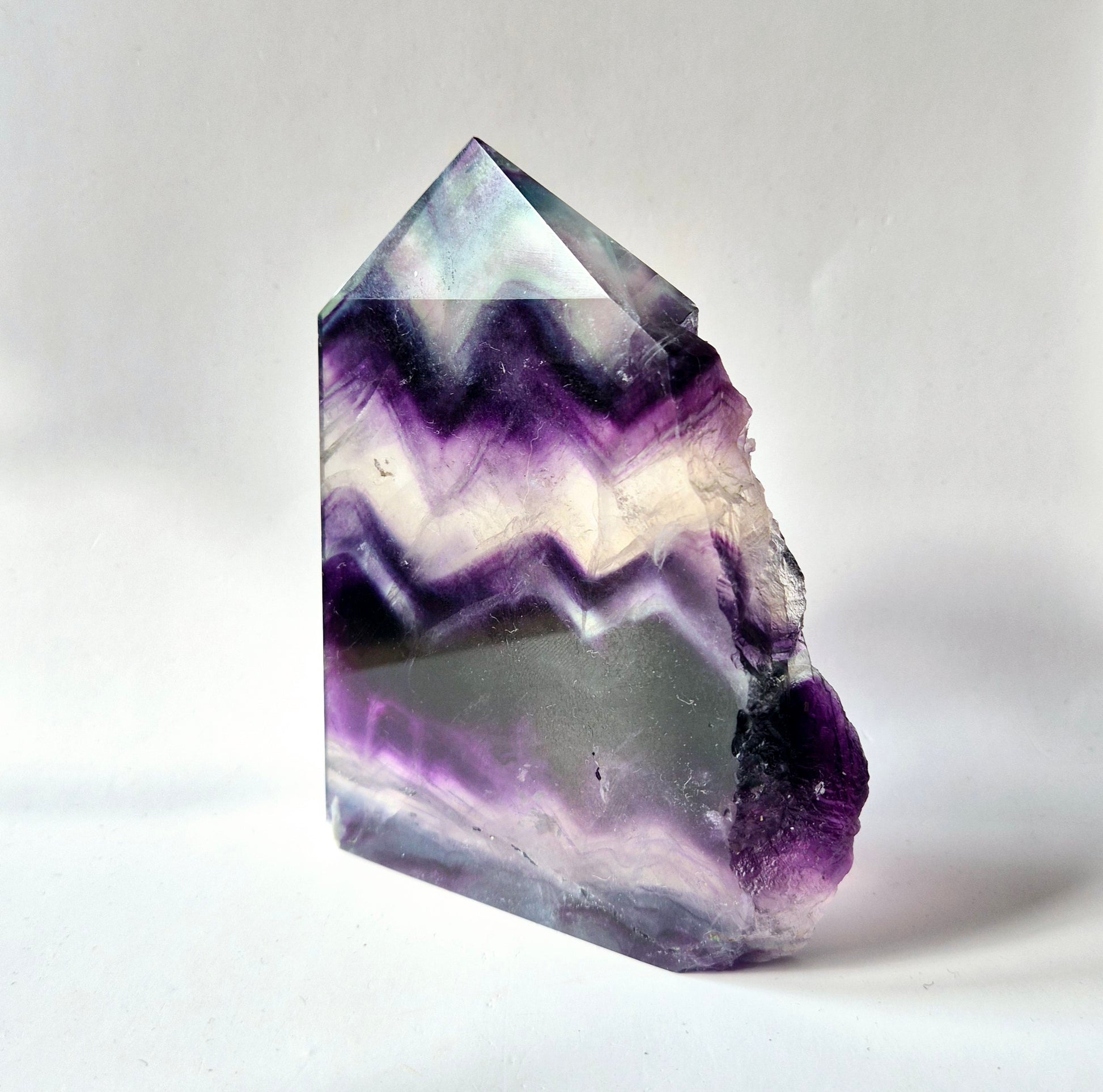 Laat je betoveren door deze unieke Candy Fluoriet sculpturen, zorgvuldig gepolijst met behoud van een ruwe natuurlijke rand. De levendige lagen in paars, groen en turquoise maken elk stuk tot een visueel spektakel — perfect voor liefhebbers van edelstenen en statement pieces.