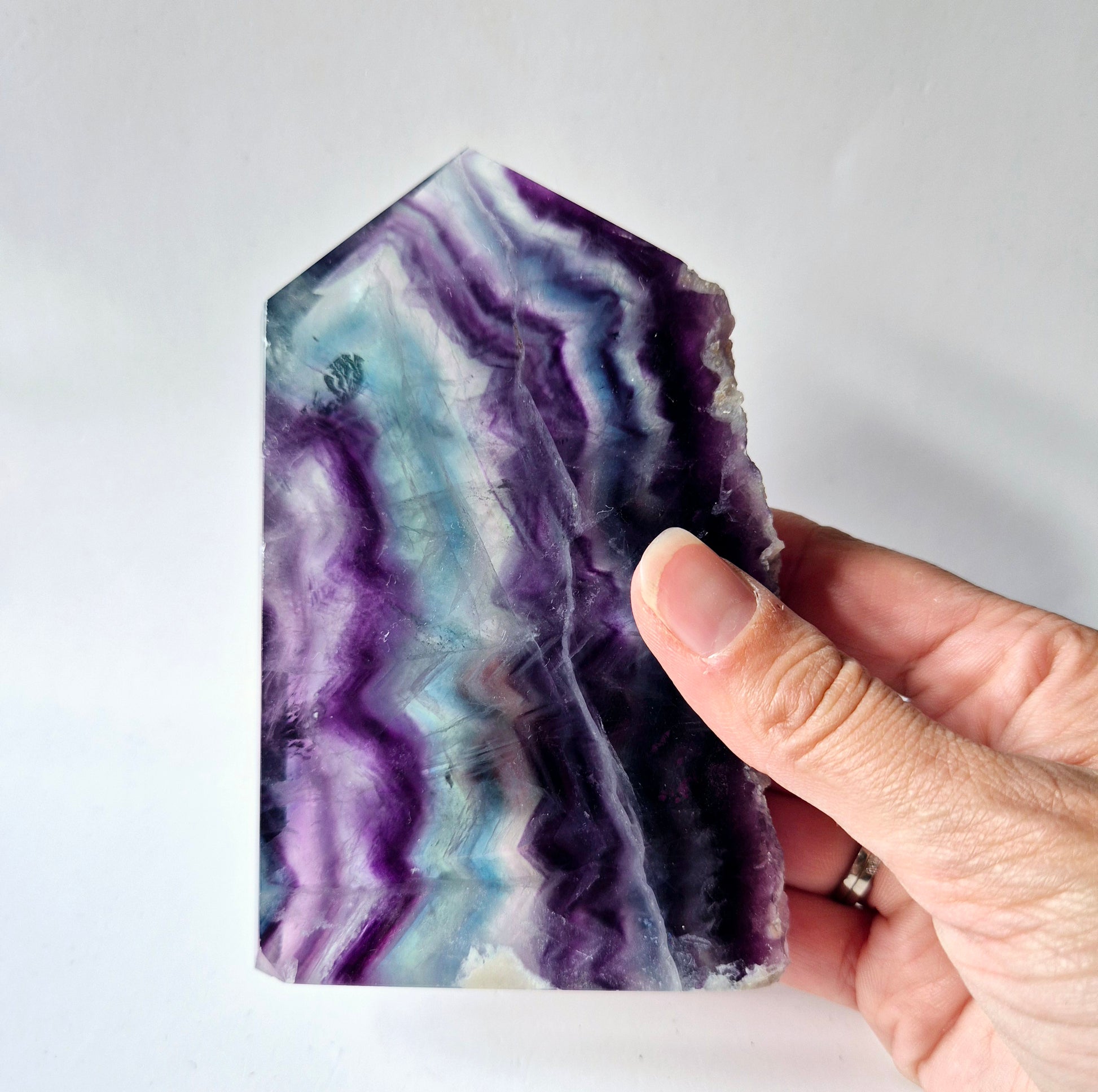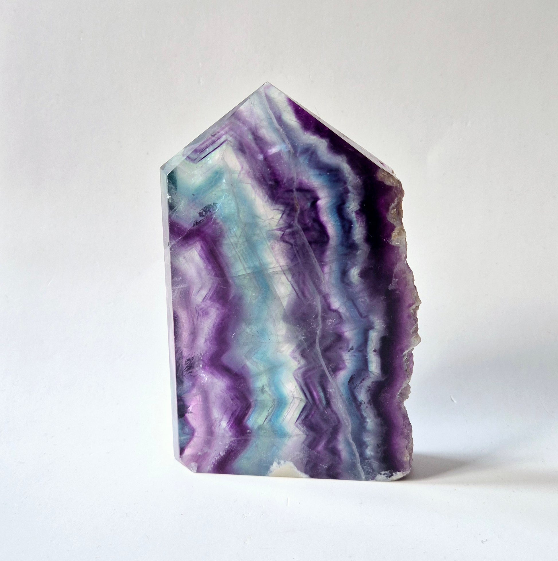 Laat je betoveren door deze unieke Candy Fluoriet sculpturen, zorgvuldig gepolijst met behoud van een ruwe natuurlijke rand. De levendige lagen in paars, groen en turquoise maken elk stuk tot een visueel spektakel — perfect voor liefhebbers van edelstenen en statement pieces.
