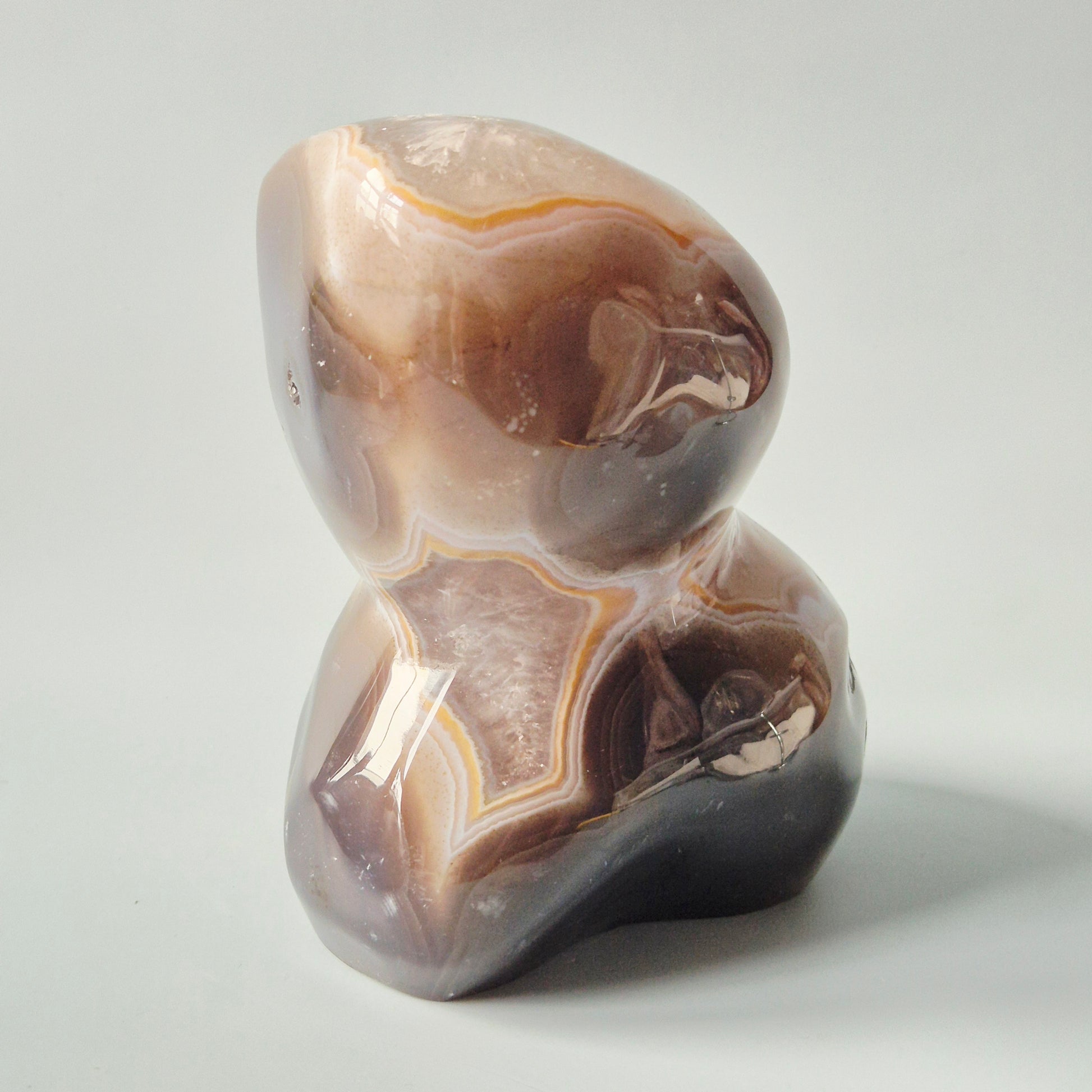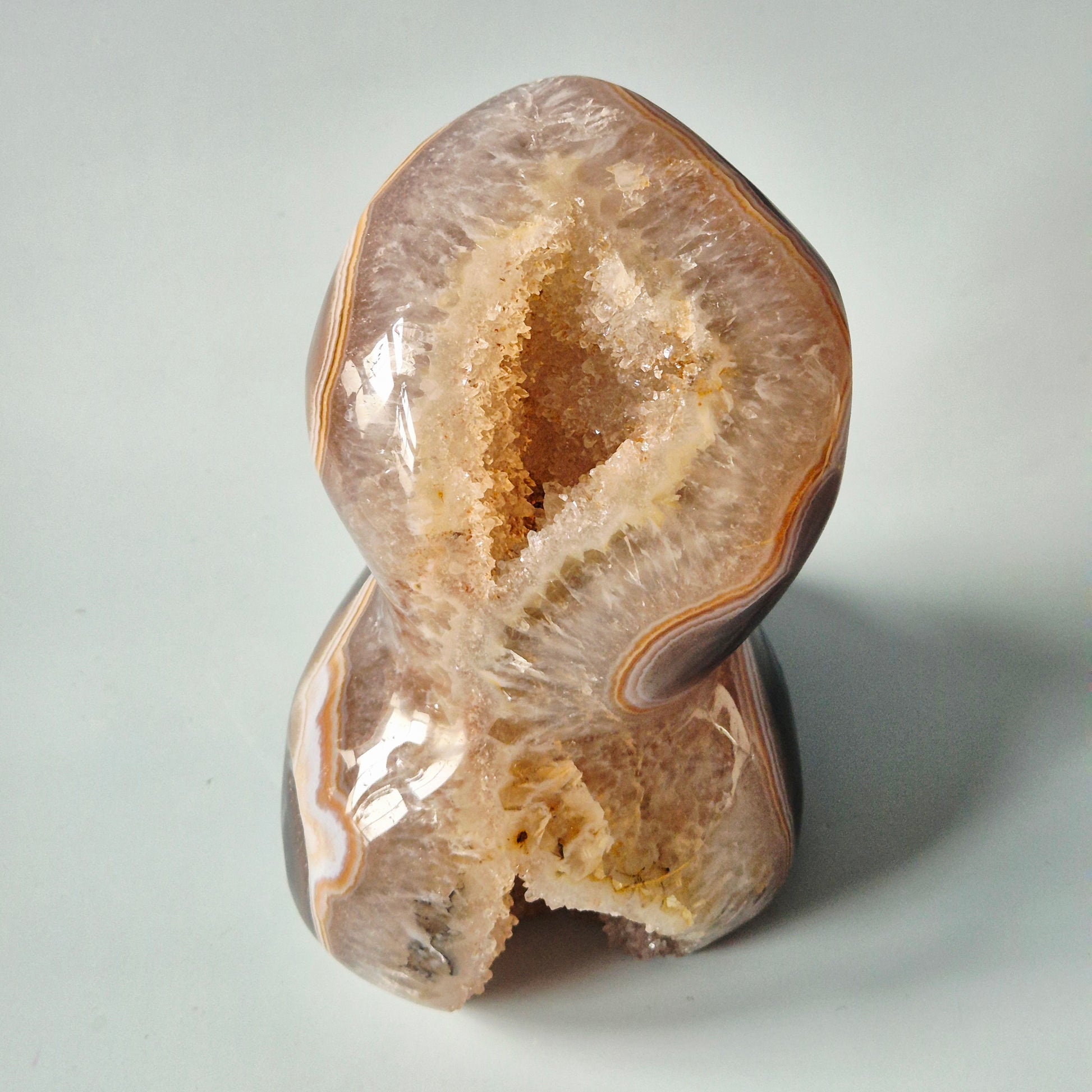 Deze indrukwekkende Druzy Agaat Freeform met Kwarts is een krachtig en luxueus natuurstuk met rijke bandstructuren en een sprankelende kristalkern.