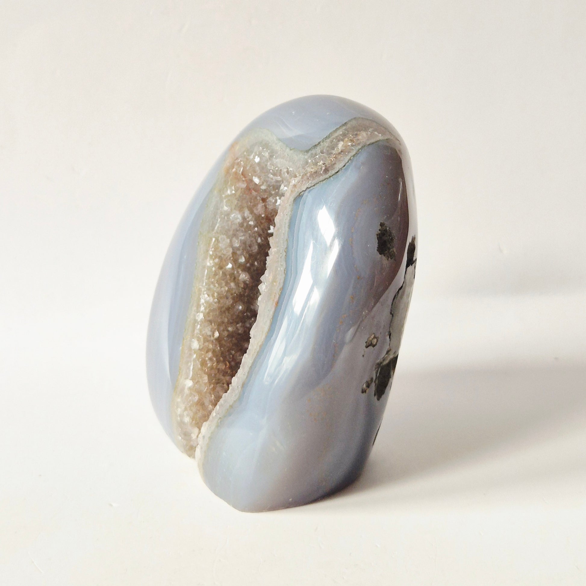 Deze prachtige Druzy Agaat uit Uruguay is een natuurlijk gevormde geode met een diep sprankelende kristalkern en een gepolijste buitenzijde. De fijne, dicht op elkaar groeiende kristallen zorgen voor een intense, subtiele glitter die prachtig vangt in het licht.