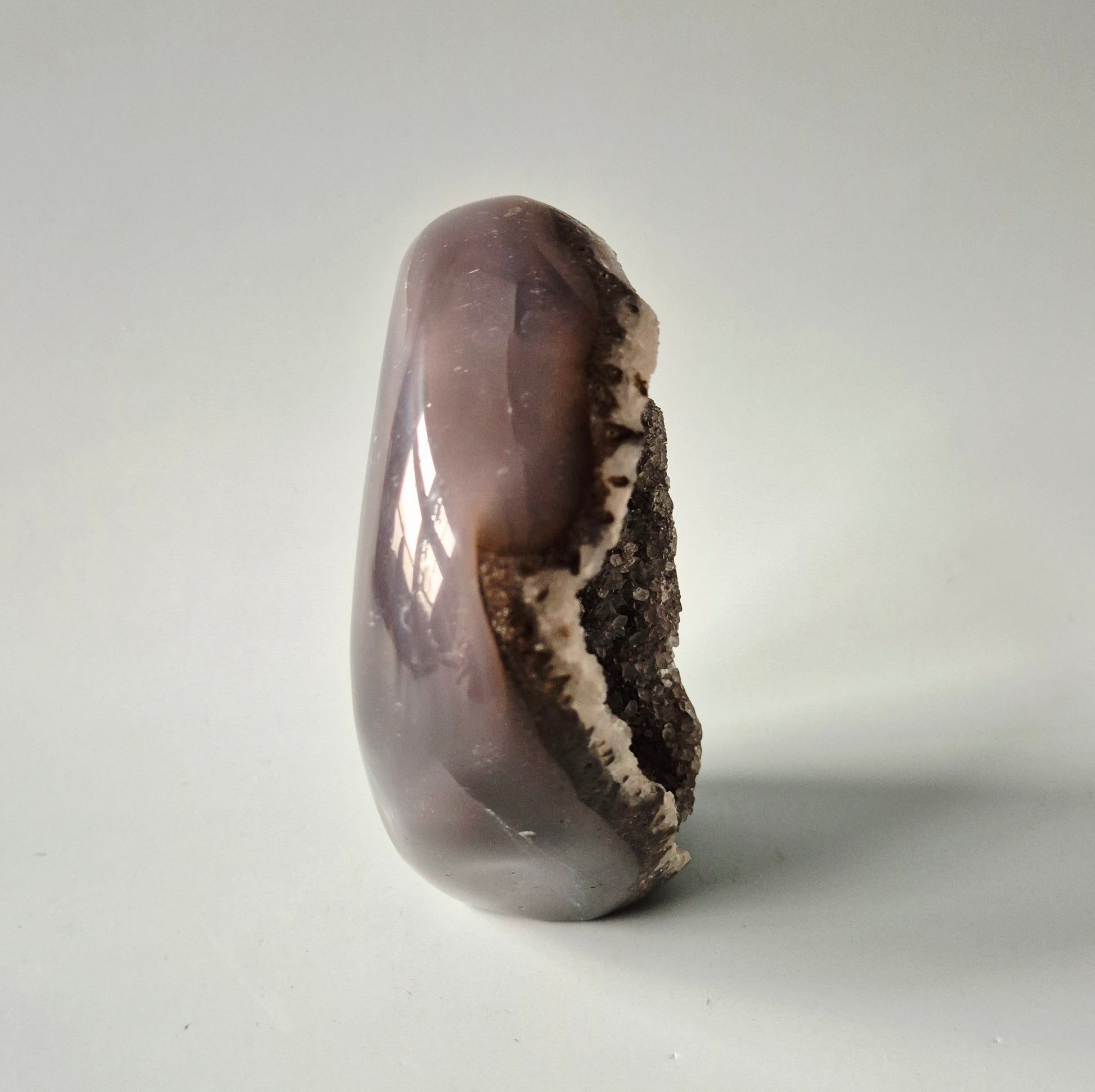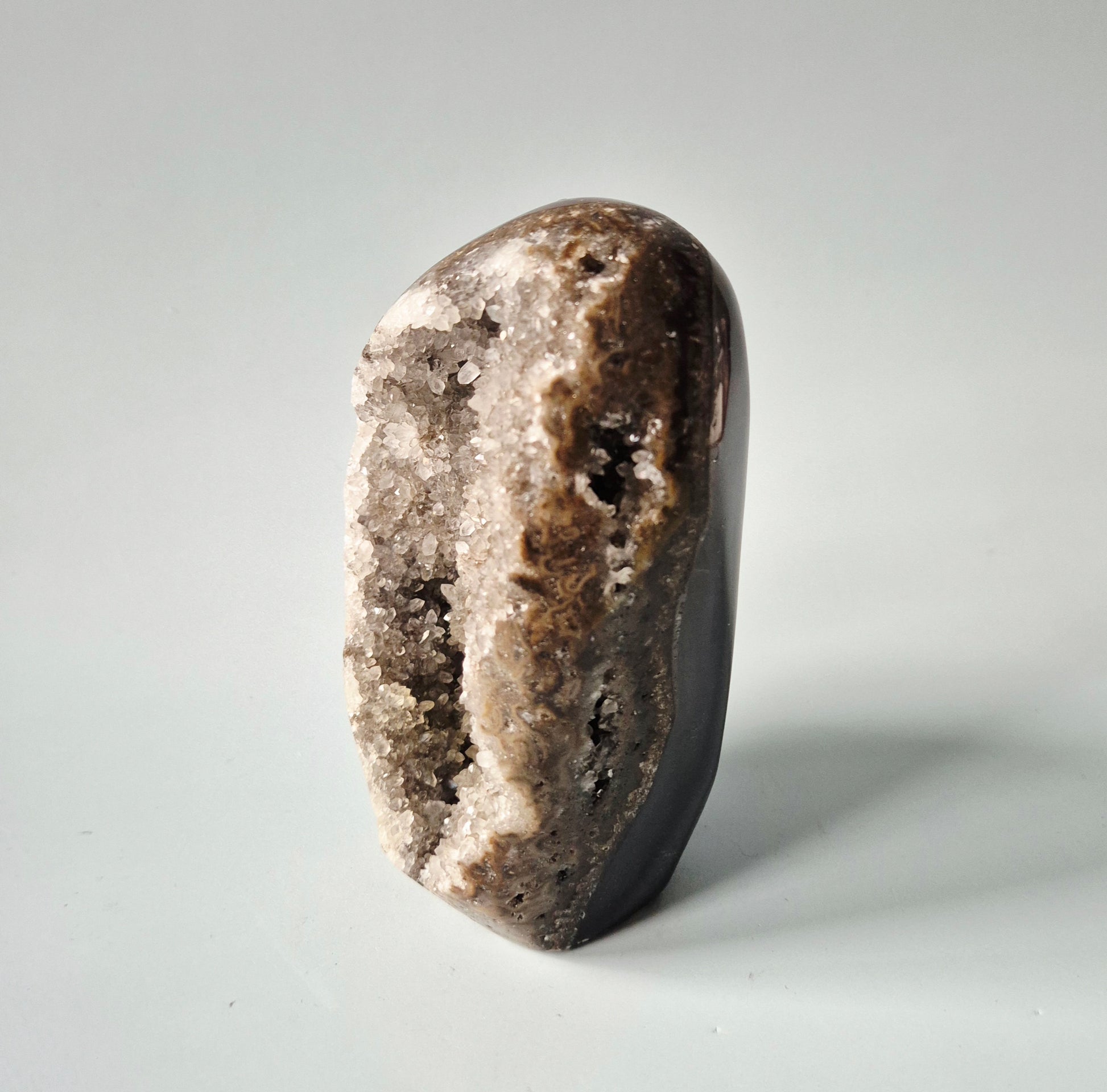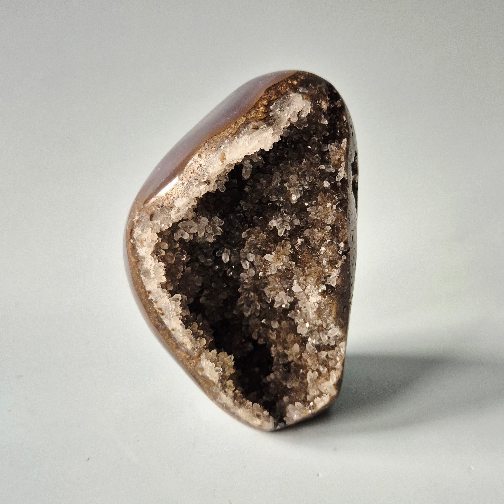 Deze prachtige Druzy Agaat uit Uruguay is een natuurlijk gevormde geode met een diep sprankelende kristalkern en een gepolijste buitenzijde. De fijne, dicht op elkaar groeiende kristallen zorgen voor een intense, subtiele glitter die prachtig vangt in het licht.
