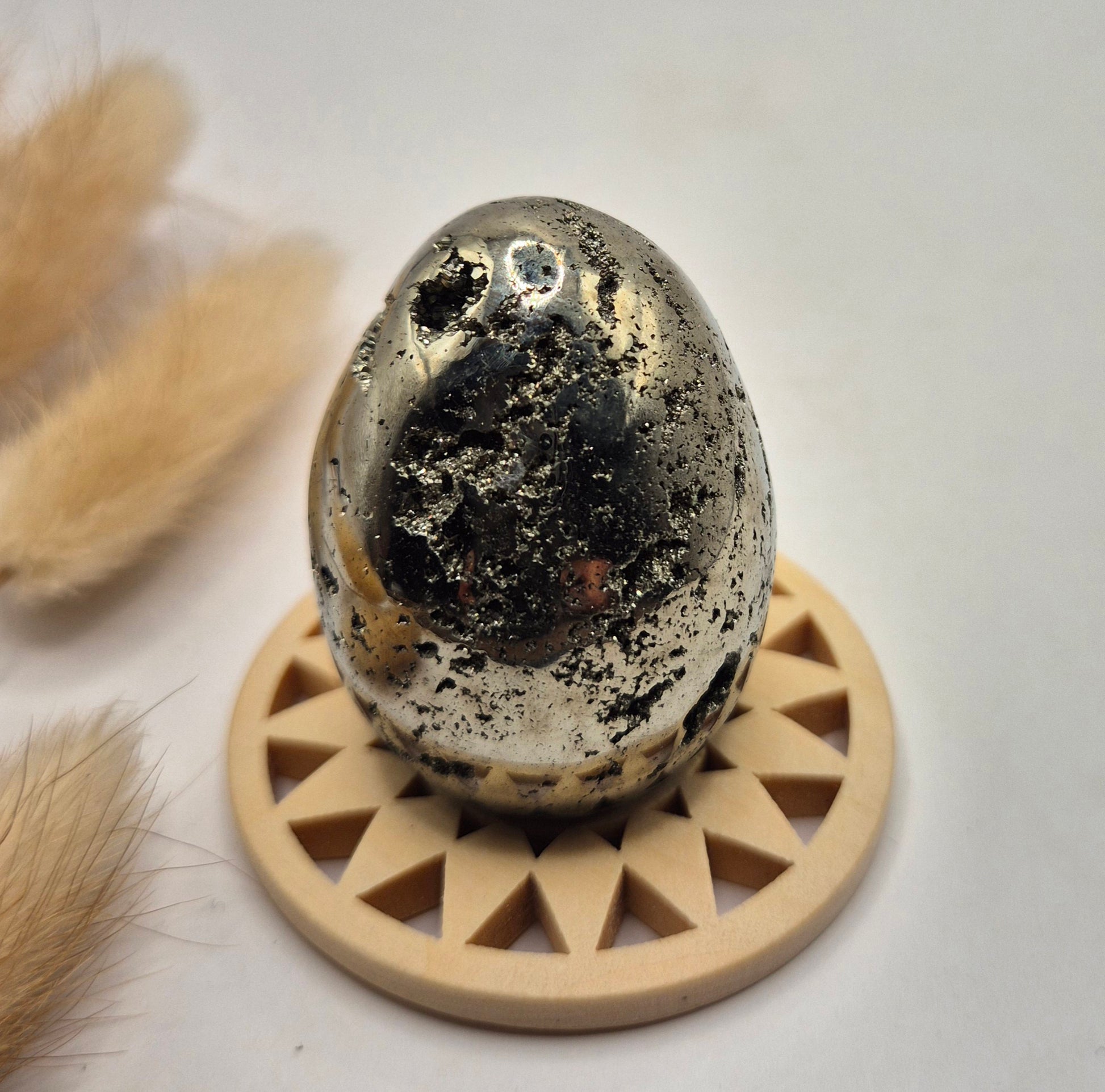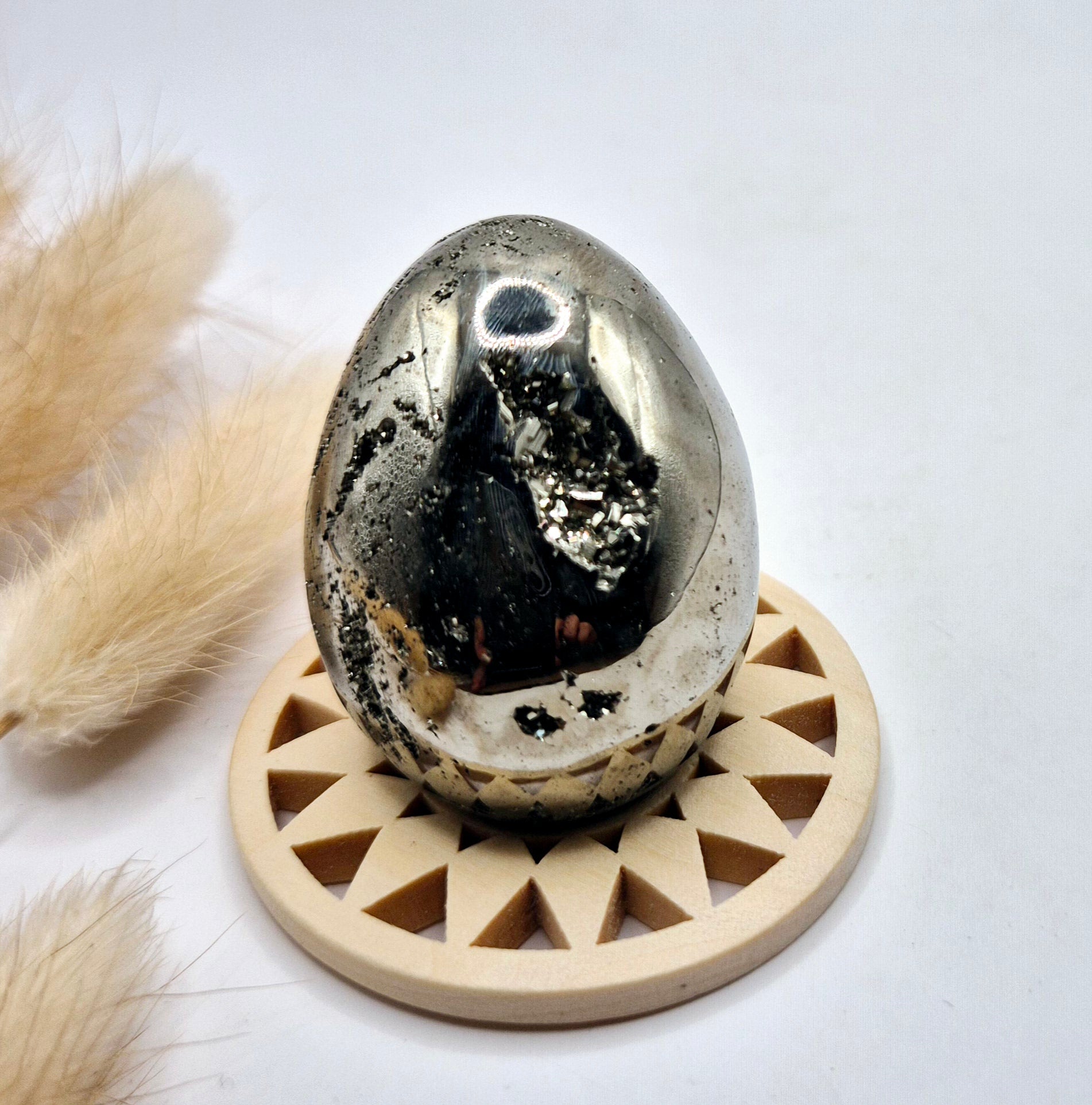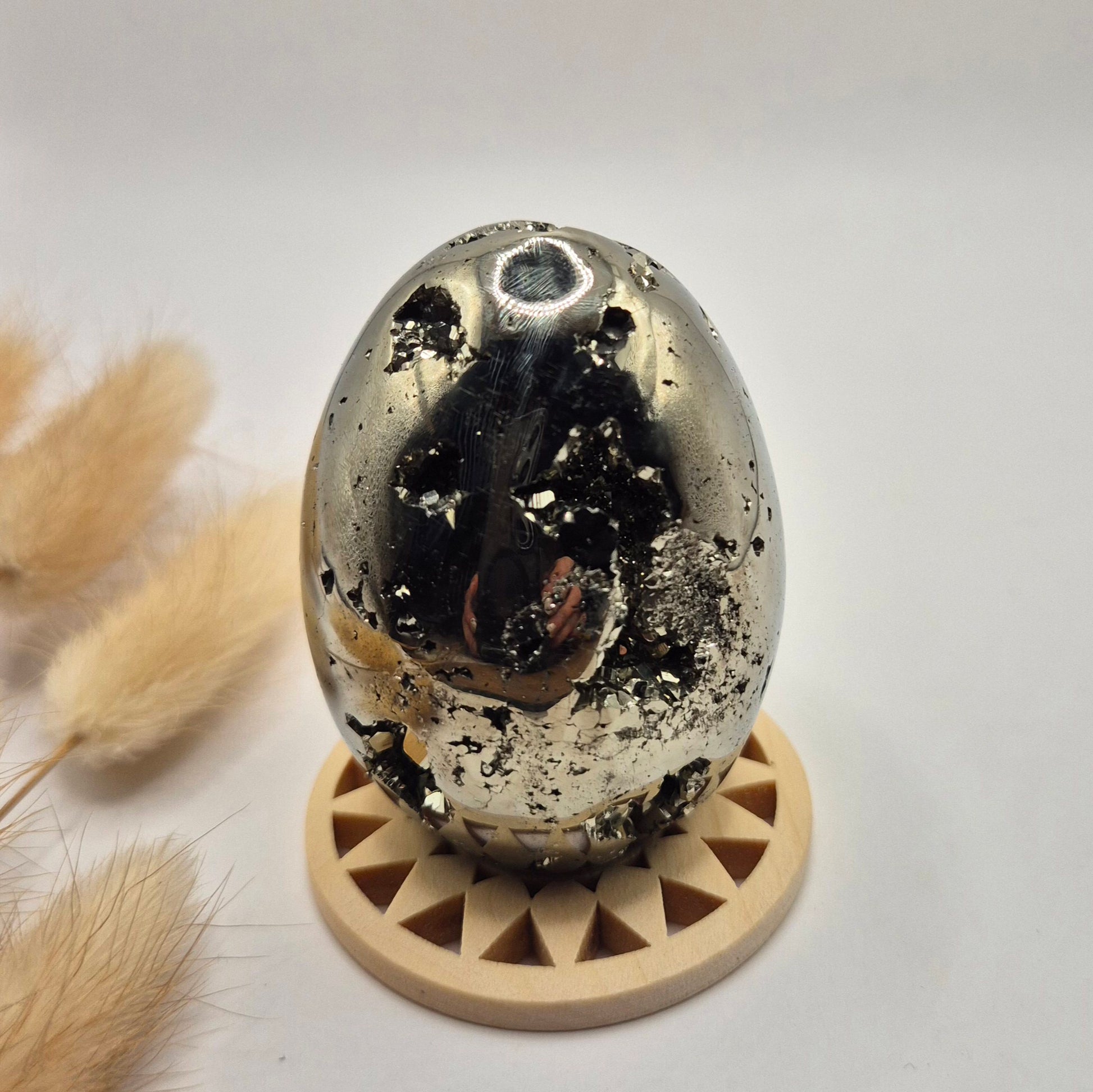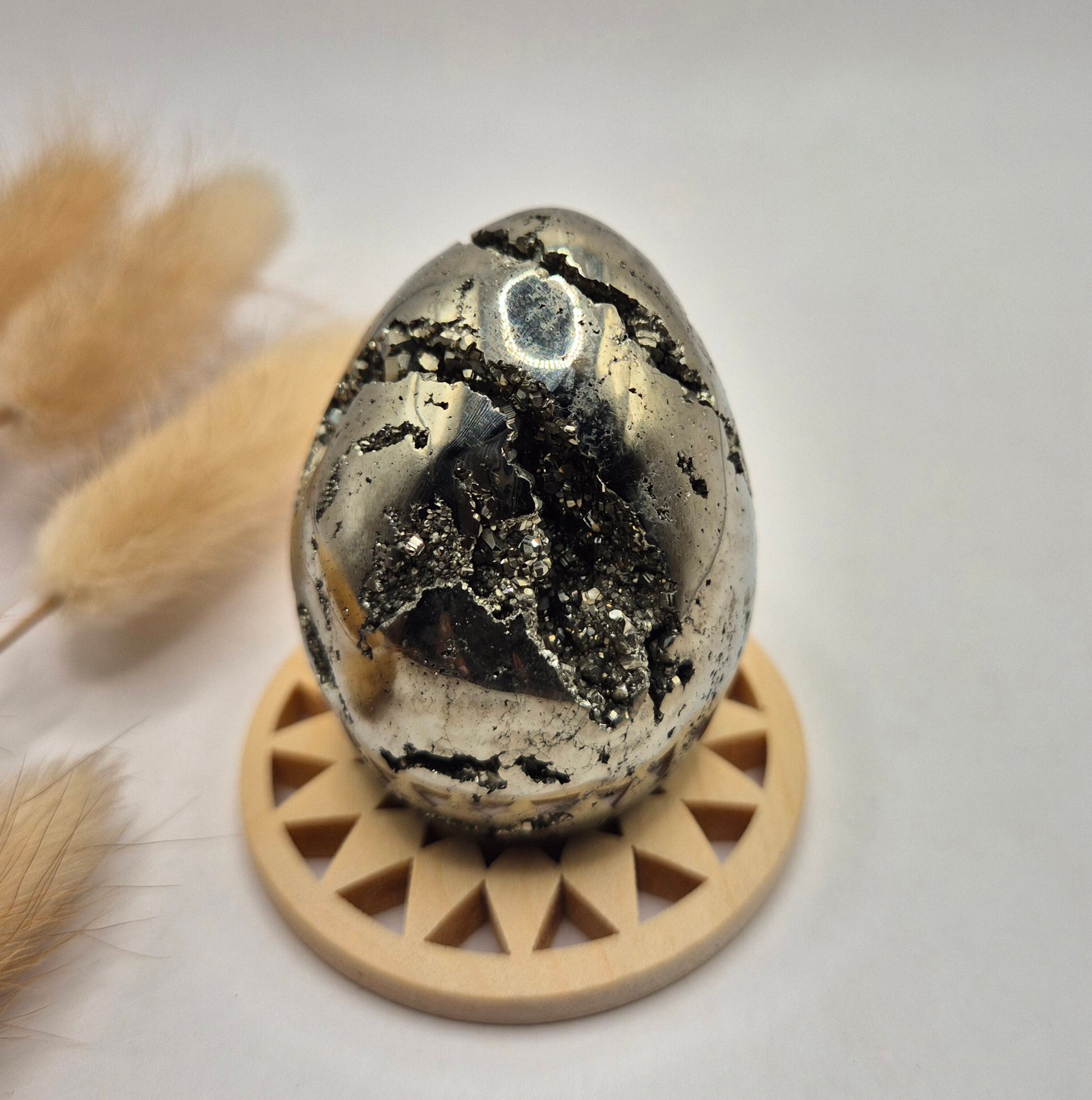 Deze hoogwaardige pyriet edelsteen ei van 40-50 mm is een krachtig en luxe statement piece. De eieren hebben een prachtige metallic glans en bevatten natuurlijke druzy kristallen, wat zorgt voor een uniek spel van licht en structuur. Elke bol is anders en straalt karakter, kracht en elegantie uit.