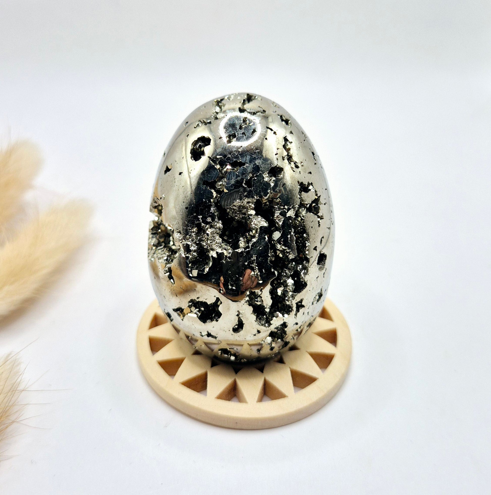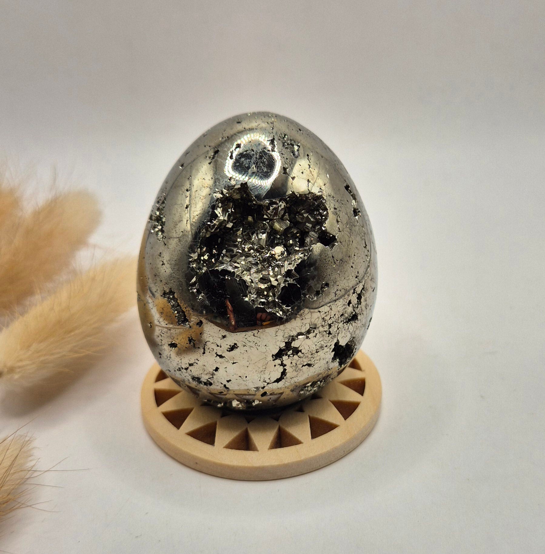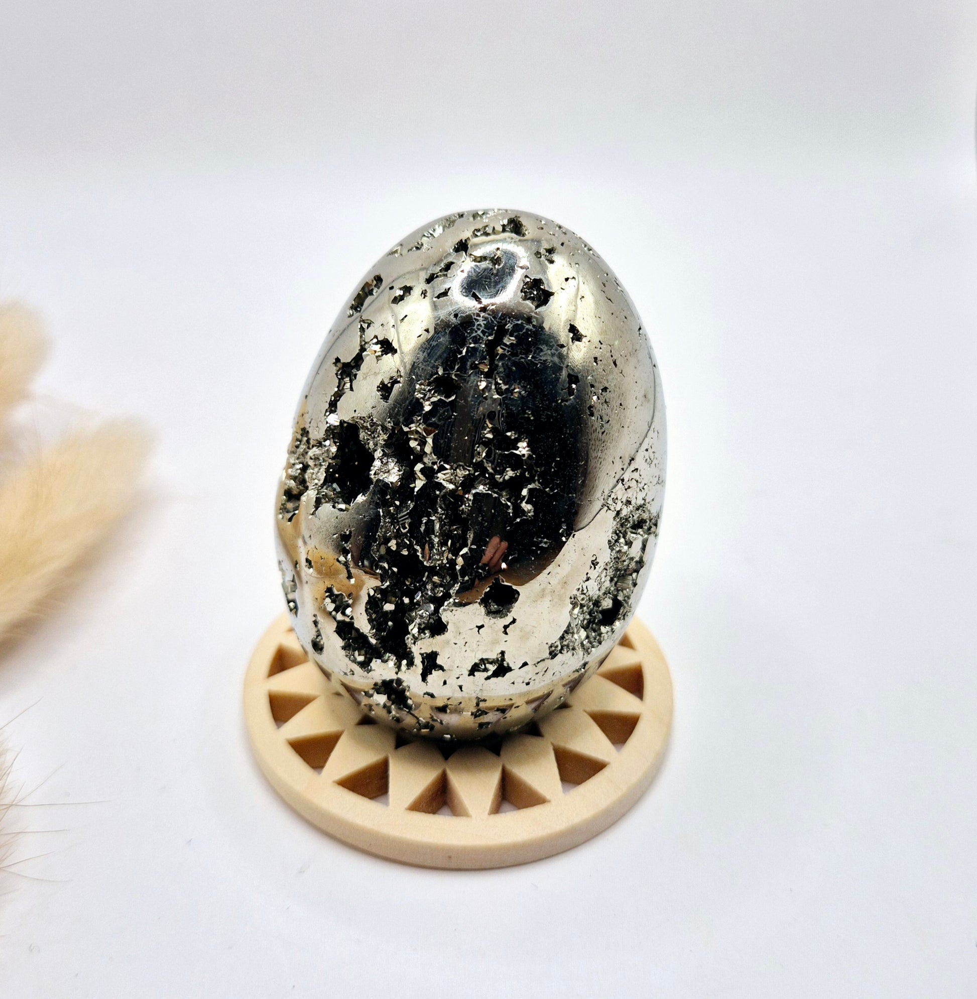Deze hoogwaardige pyriet edelsteen ei van 40-50 mm is een krachtig en luxe statement piece. De eieren hebben een prachtige metallic glans en bevatten natuurlijke druzy kristallen, wat zorgt voor een uniek spel van licht en structuur. Elke bol is anders en straalt karakter, kracht en elegantie uit.