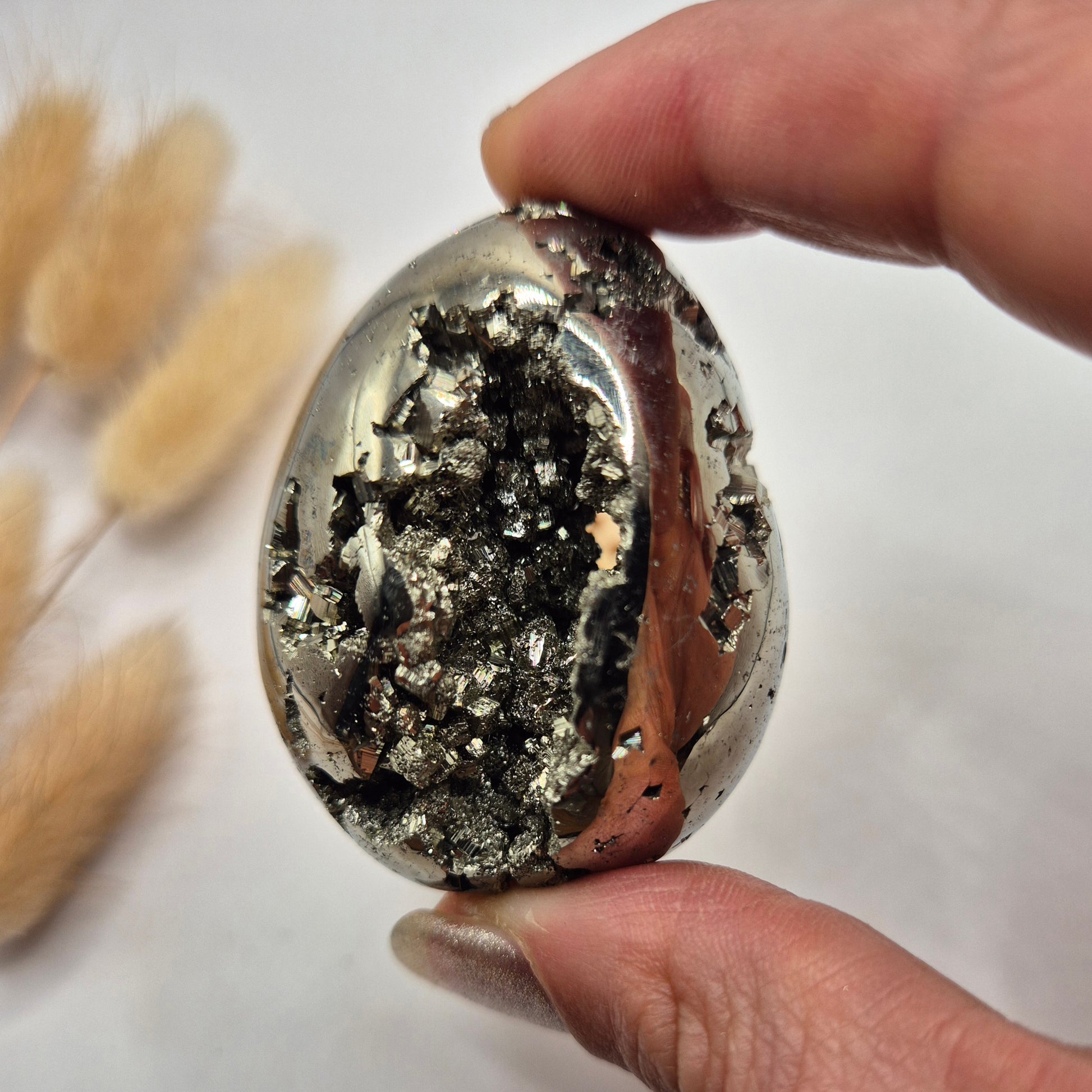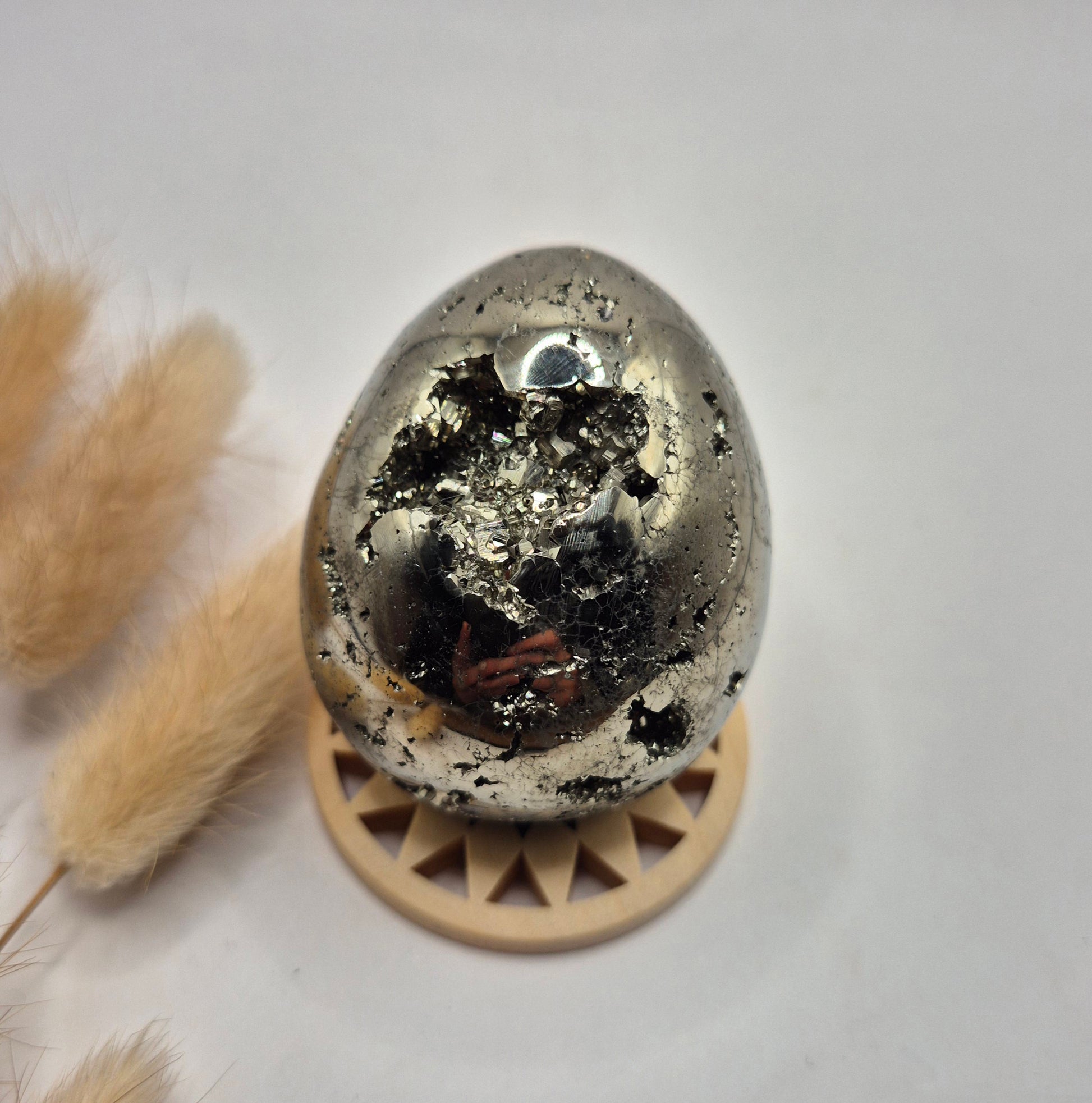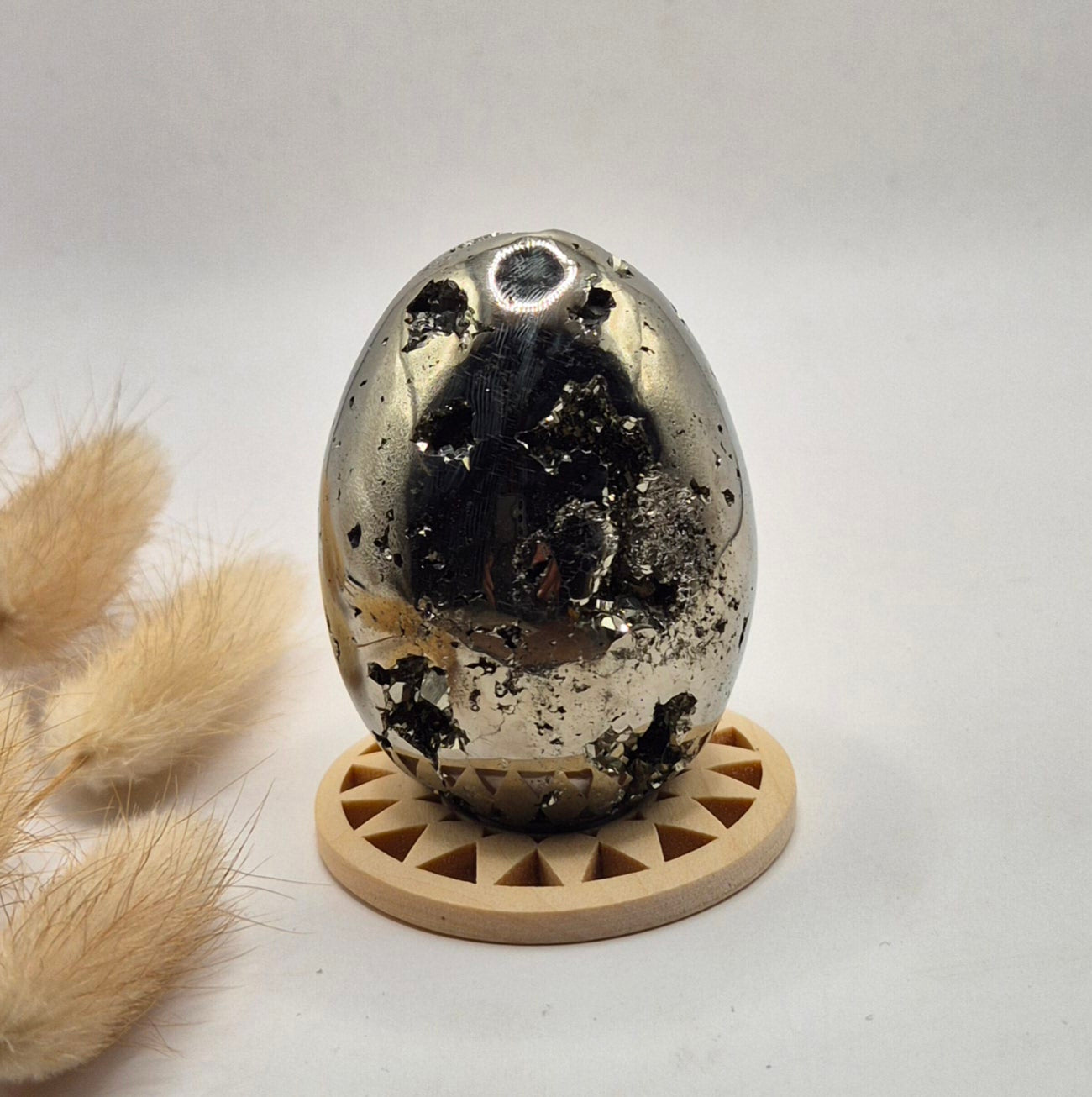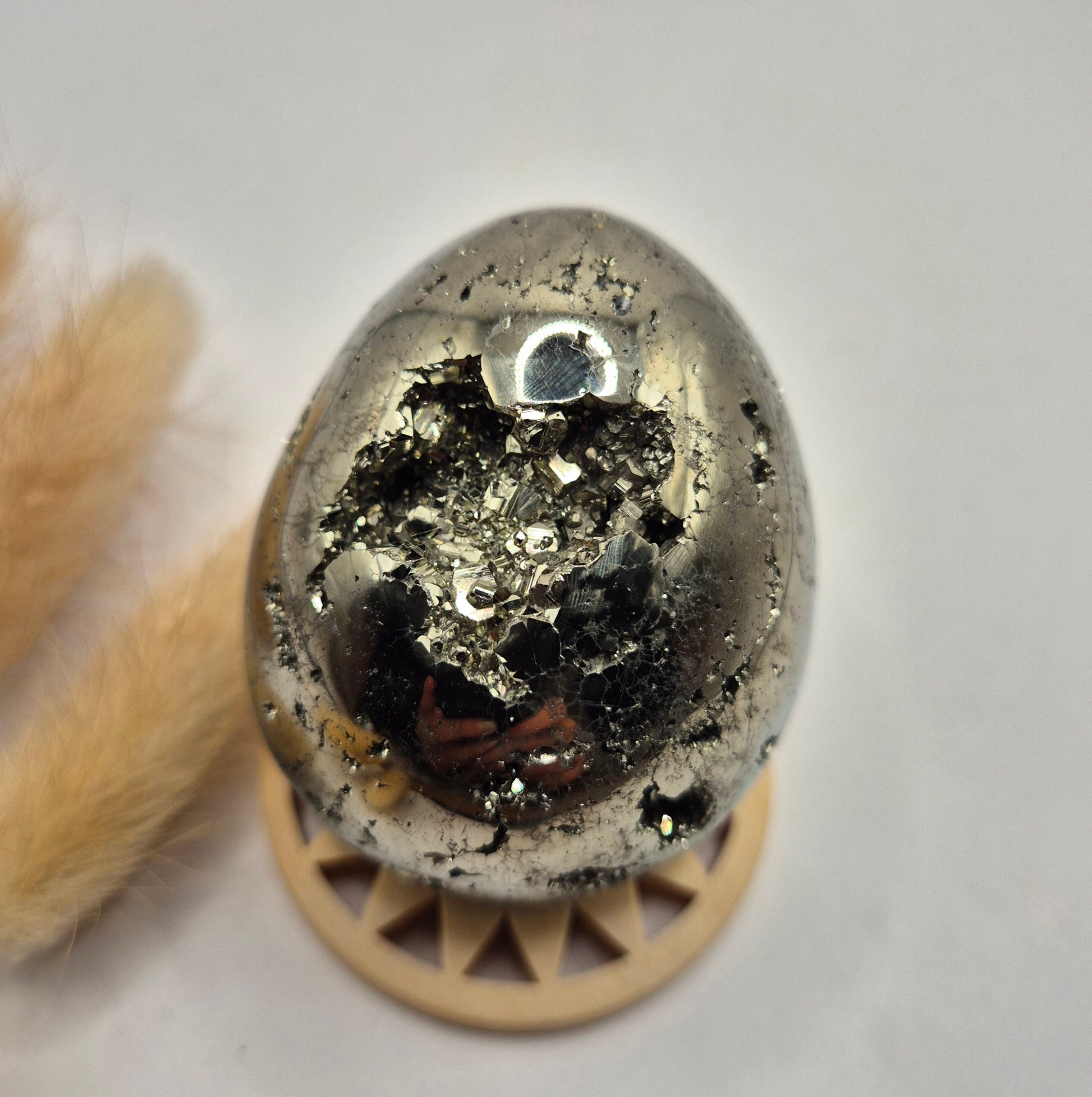 Deze hoogwaardige pyriet edelsteen ei van 40-50 mm is een krachtig en luxe statement piece. De eieren hebben een prachtige metallic glans en bevatten natuurlijke druzy kristallen, wat zorgt voor een uniek spel van licht en structuur. Elke bol is anders en straalt karakter, kracht en elegantie uit.
