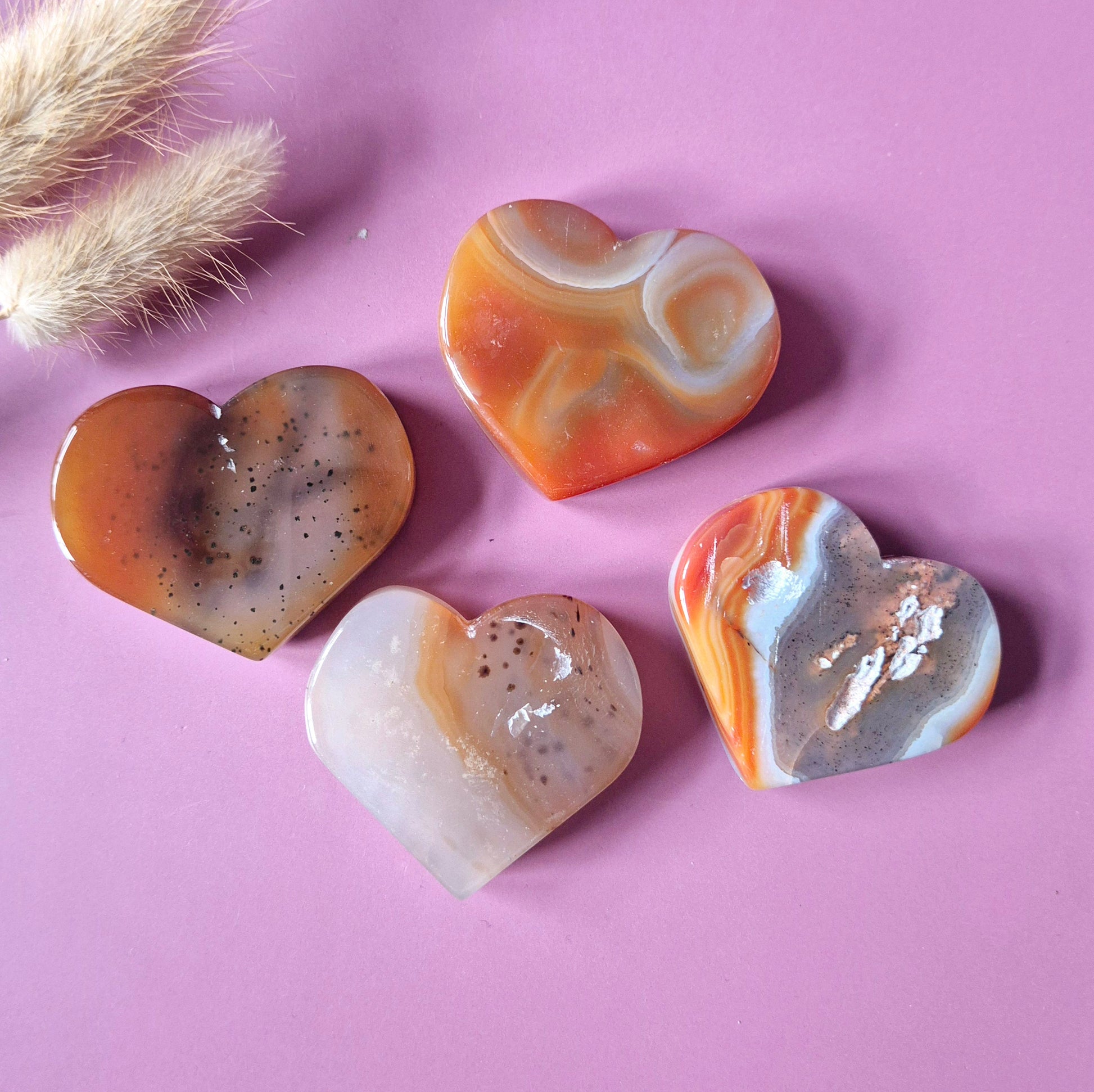 Voeg warmte, passie en creatieve energie toe aan je collectie met deze prachtige Carneool / Fire Agate harten. Elk hart is met de hand geslepen en toont unieke banden, patronen en natuurlijke kleurvariaties – van zacht beige tot vurige oranje tinten. Een echte blikvanger voor op je altaar, je bureau of als liefdevol cadeautje.