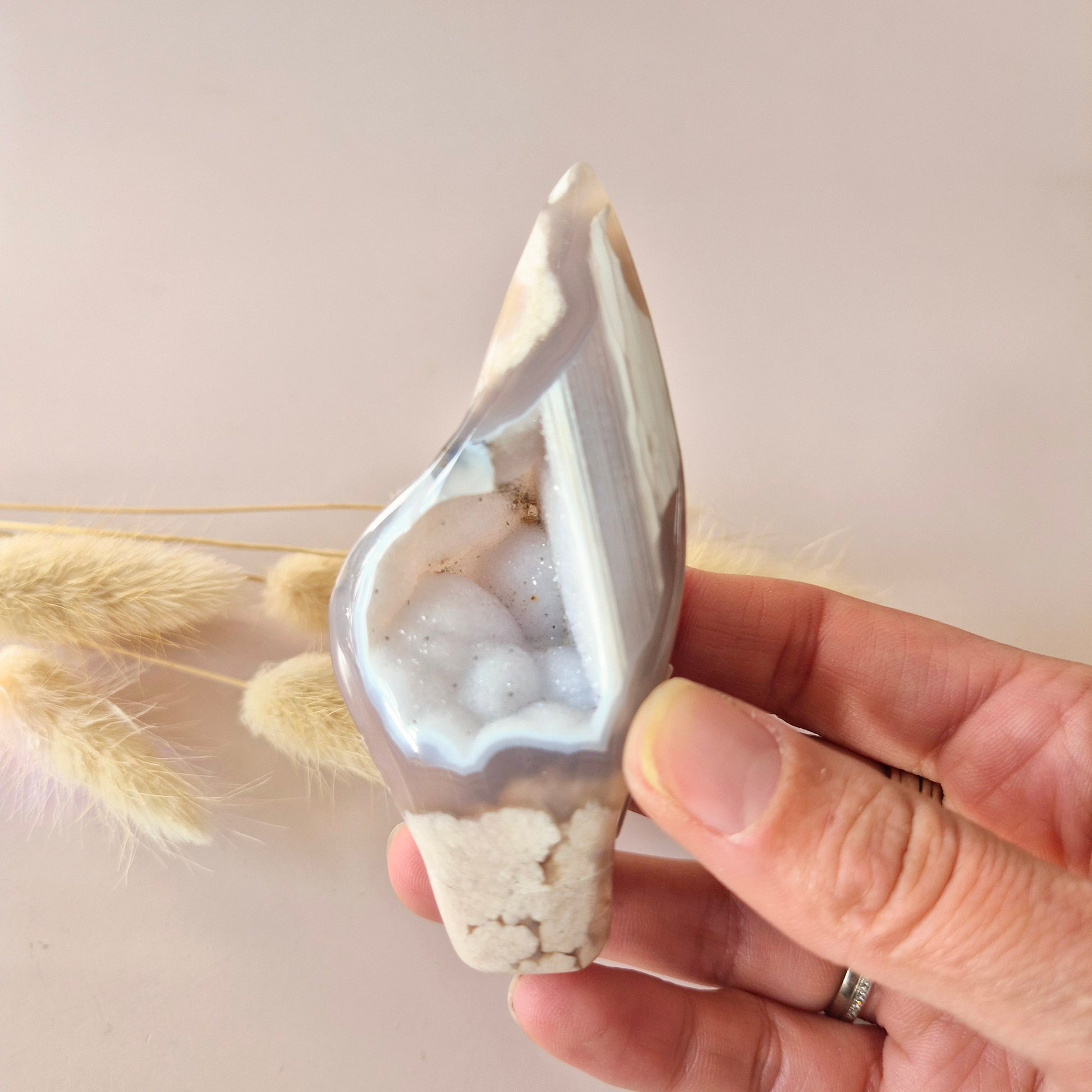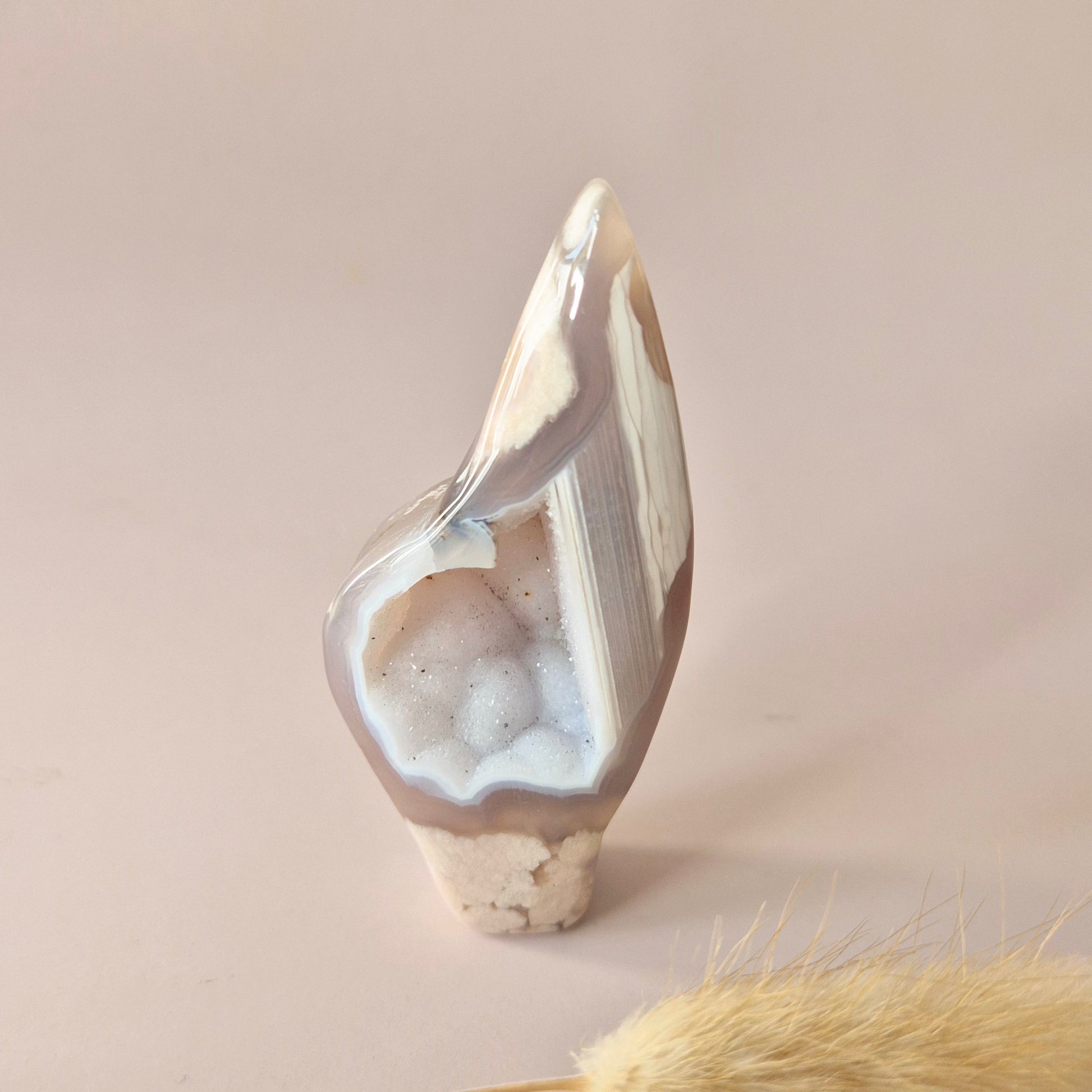 Pink Amethist staat bekend om haar kalmerende en beschermende energie. Ze opent het hartchakra, bevordert zelfliefde, en helpt je om met meer rust en vertrouwen in het leven te staan. Dit stuk is niet alleen energetisch waardevol, maar ook een esthetisch sieraad voor je interieur, altaar of meditatieplek.