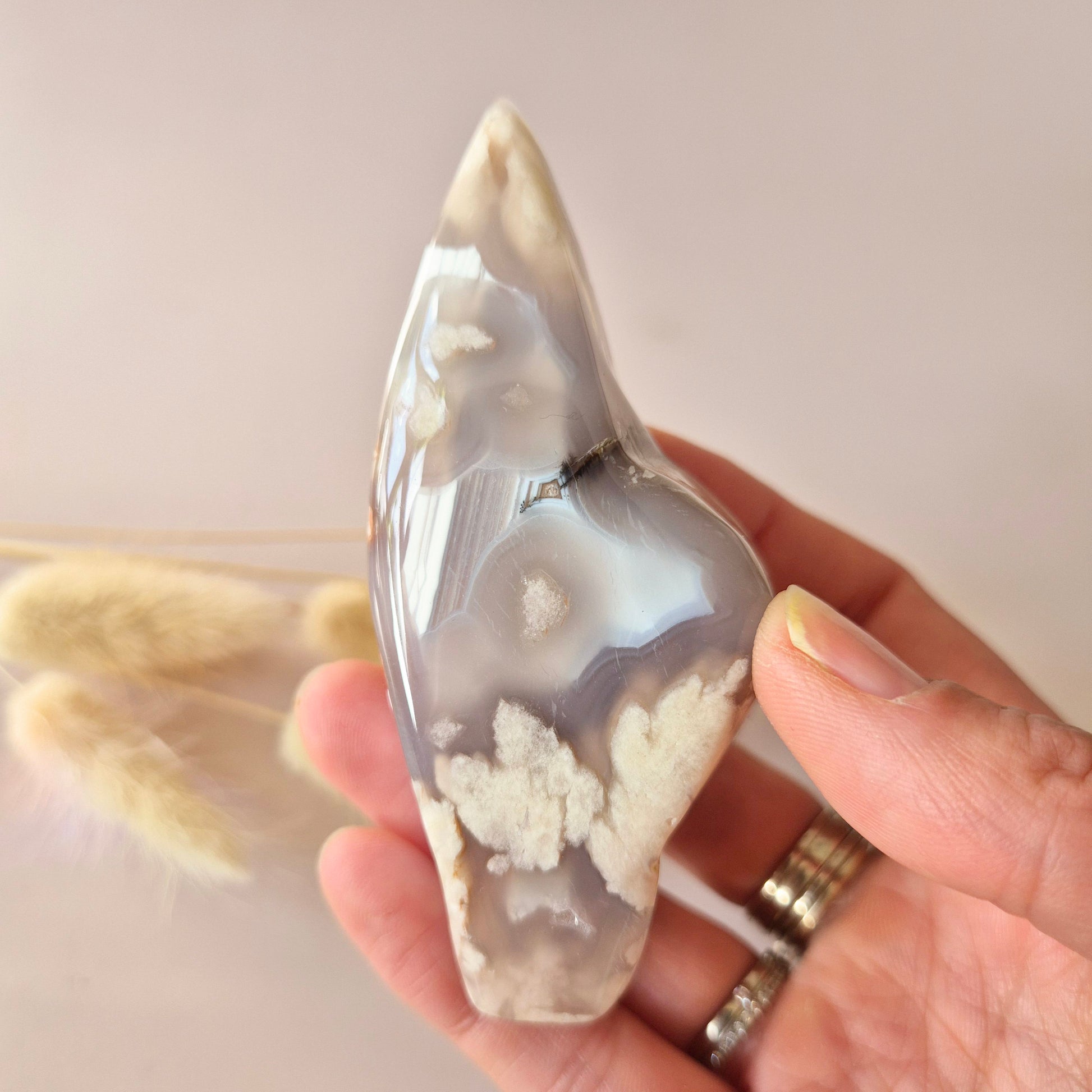 Laat je betoveren door deze unieke, handgeslepen Pink Amethist flame van 89gram. Het stuk combineert zachte roze tinten - een natuurlijk kunstwerk met een liefdevolle uitstraling.