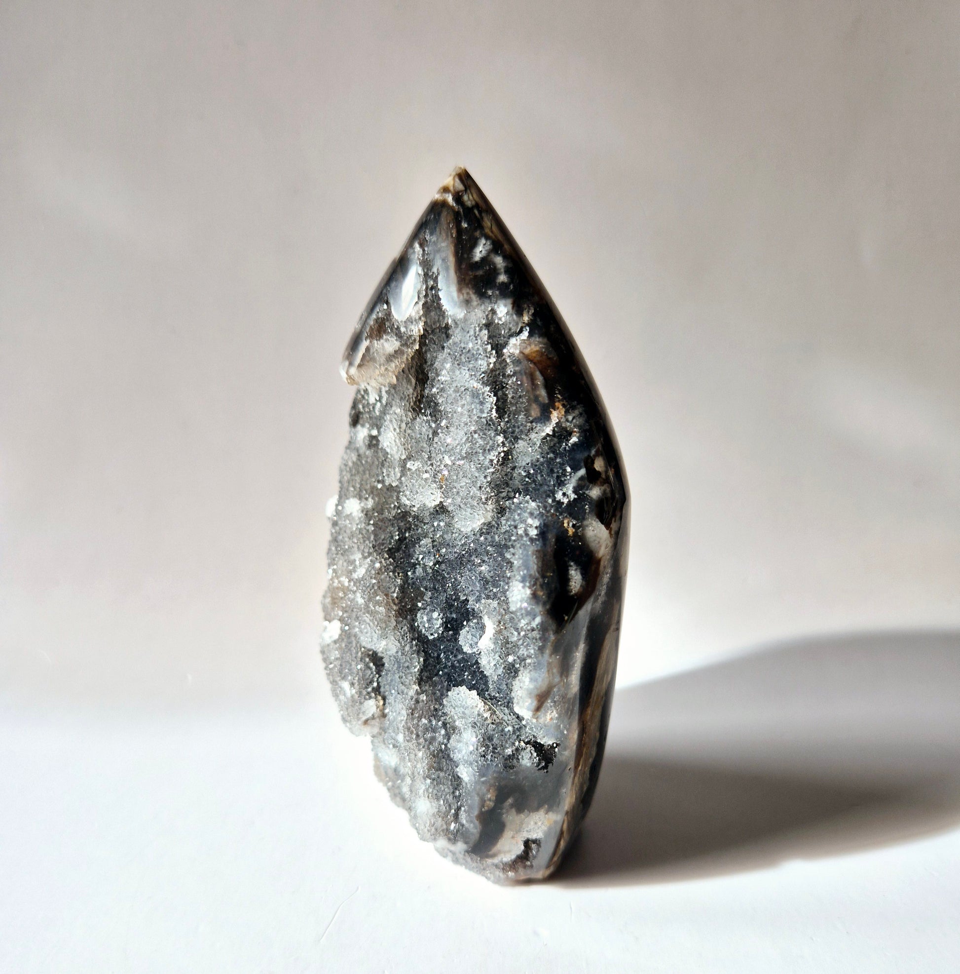 Laat je betoveren door de diepe, mysterieuze glans van deze handgeslepen Sphalerite flame. Met zijn natuurlijke schittering, kristallijne druzy-insluitsels en organische vormen is deze sculptuur niet alleen een energetisch krachtobject, maar ook een waar kunstwerk voor je altaar, interieur of edelstenencollectie.