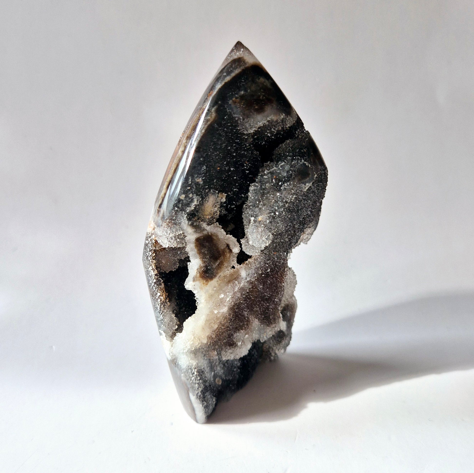 Laat je betoveren door de diepe, mysterieuze glans van deze handgeslepen Sphalerite flame. Met zijn natuurlijke schittering, kristallijne druzy-insluitsels en organische vormen is deze sculptuur niet alleen een energetisch krachtobject, maar ook een waar kunstwerk voor je altaar, interieur of edelstenencollectie.