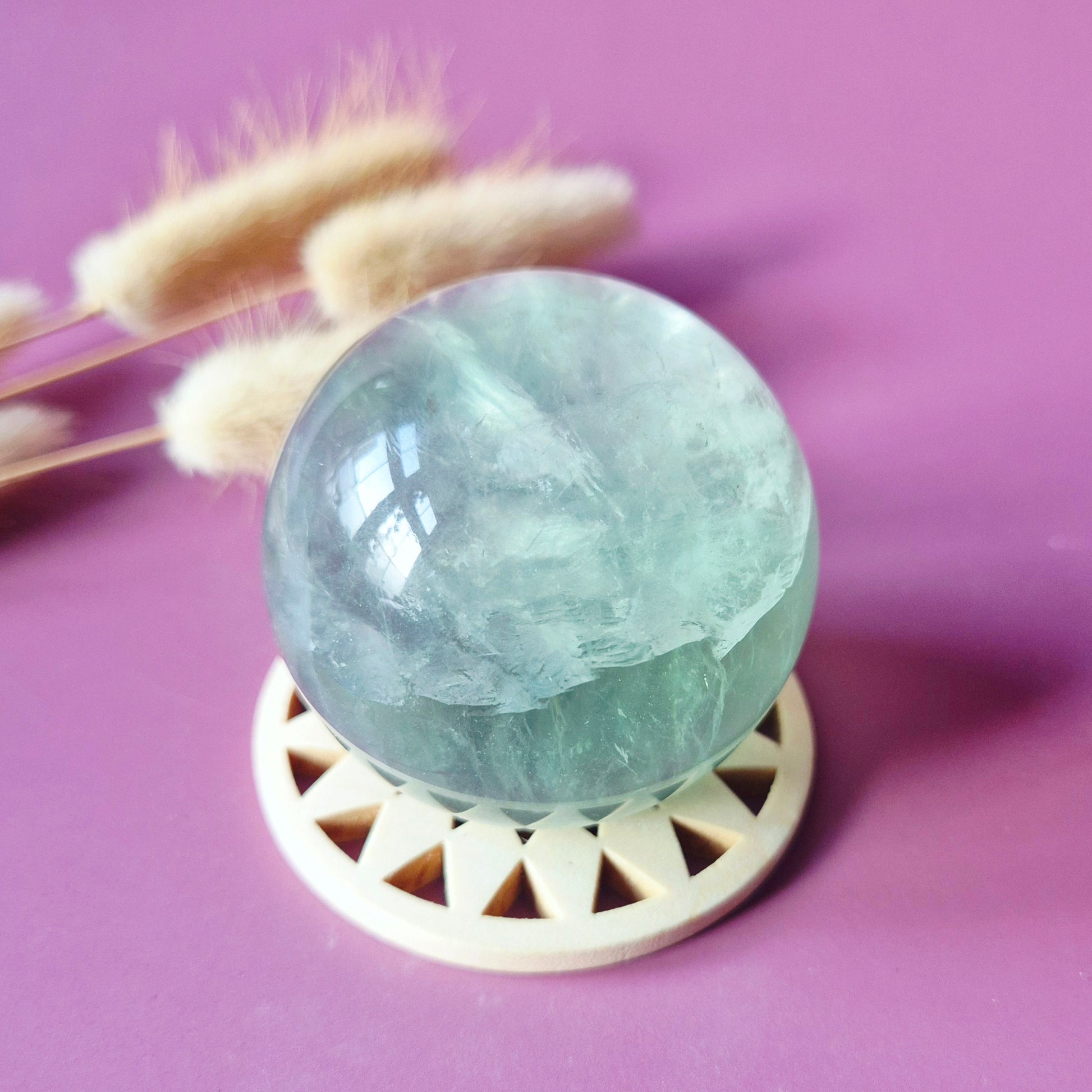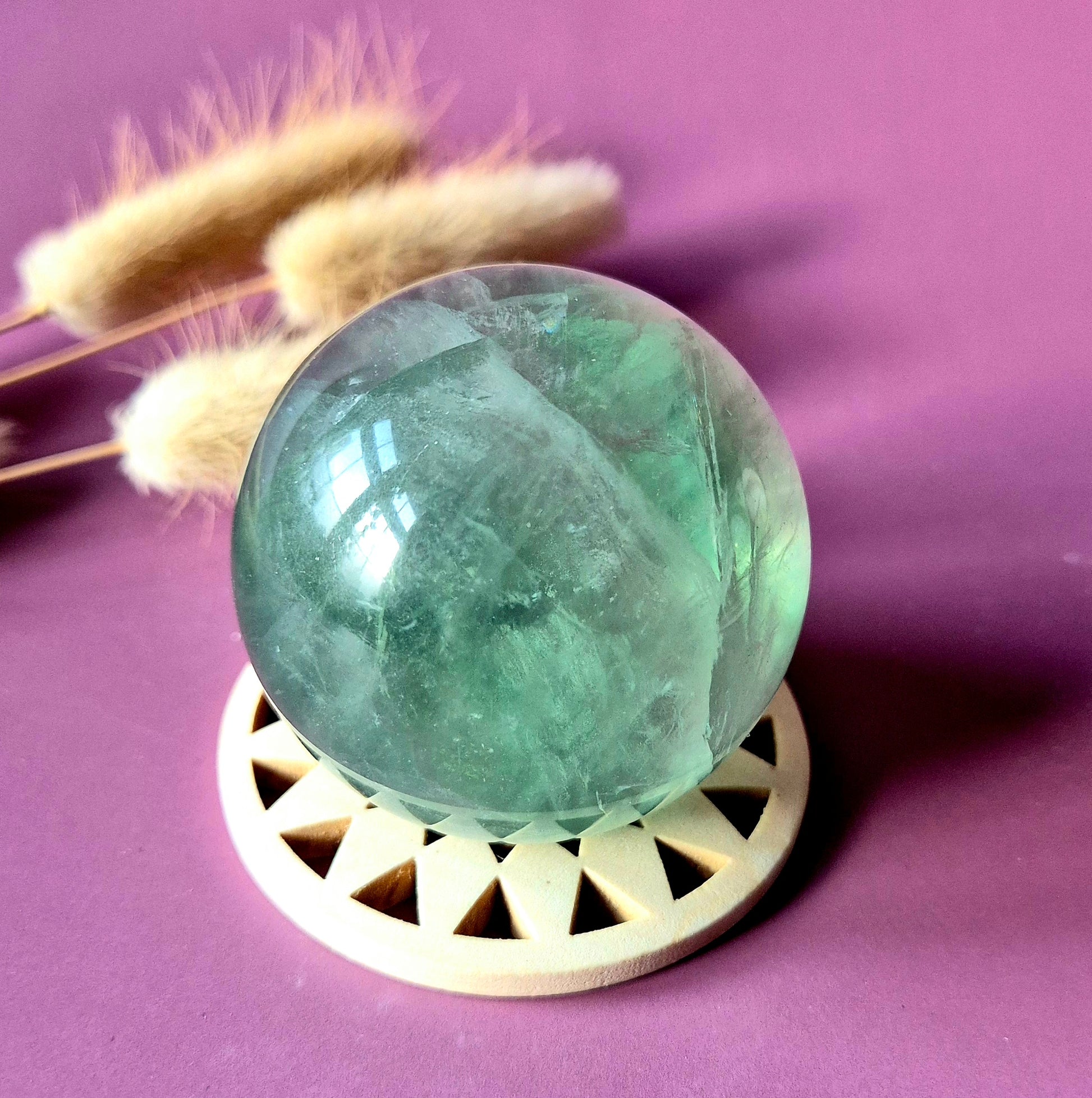 Fluoriet staat bekend om haar zuiverende werking op de geest. Het helpt bij focus, concentratie, bescherming tegen negatieve invloeden en energetische ruis. De bolvorm verspreidt de energie gelijkmatig in alle richtingen en is ideaal voor meditatie, werkplekken of kristalgrids.