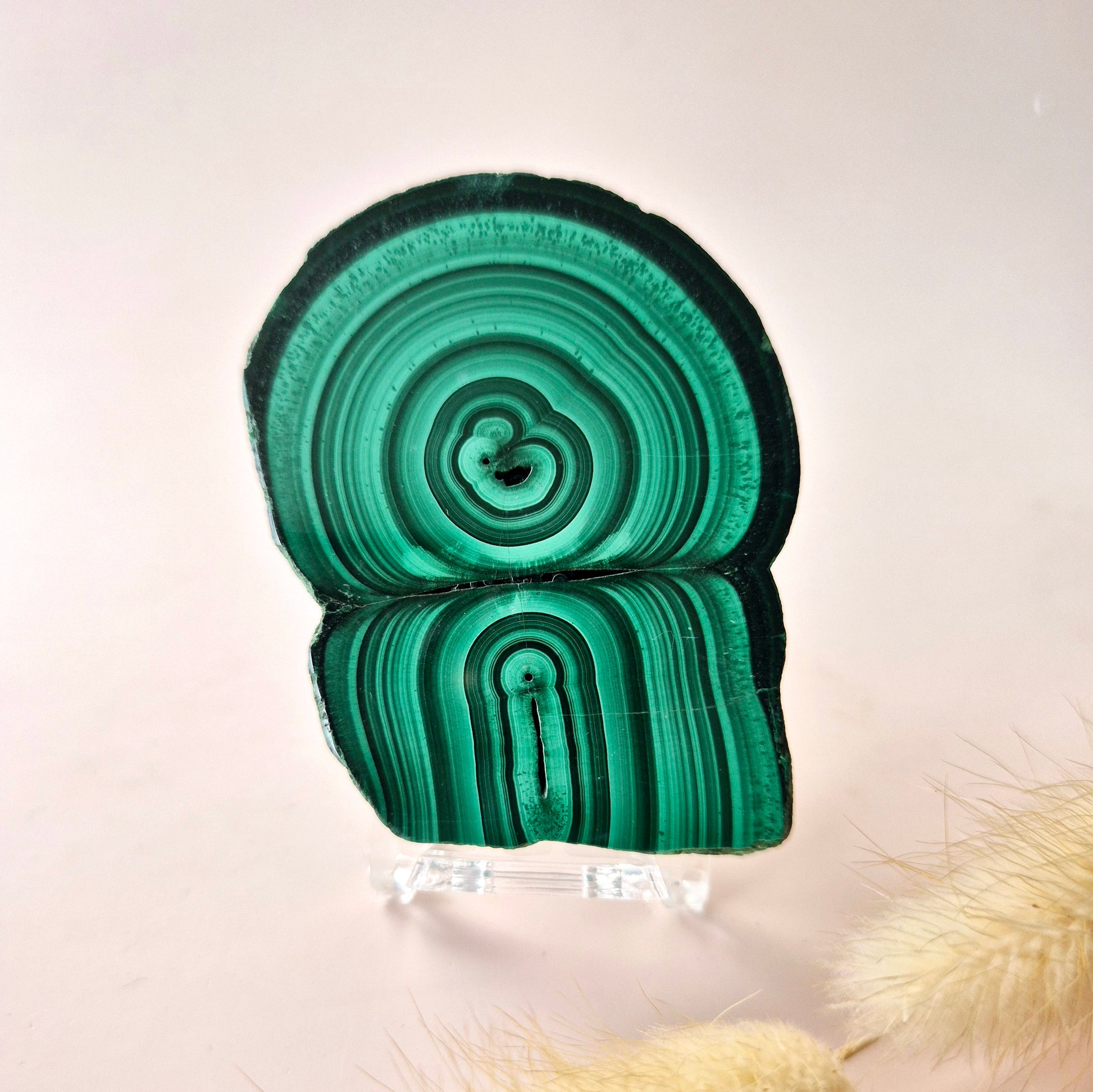 Deze hoogwaardige malachiet is zorgvuldig gepolijst aan één zijde en wordt geleverd met een transparante standaard, waardoor het een schitterend displaystuk is voor elk interieur of edelstenenverzameling.