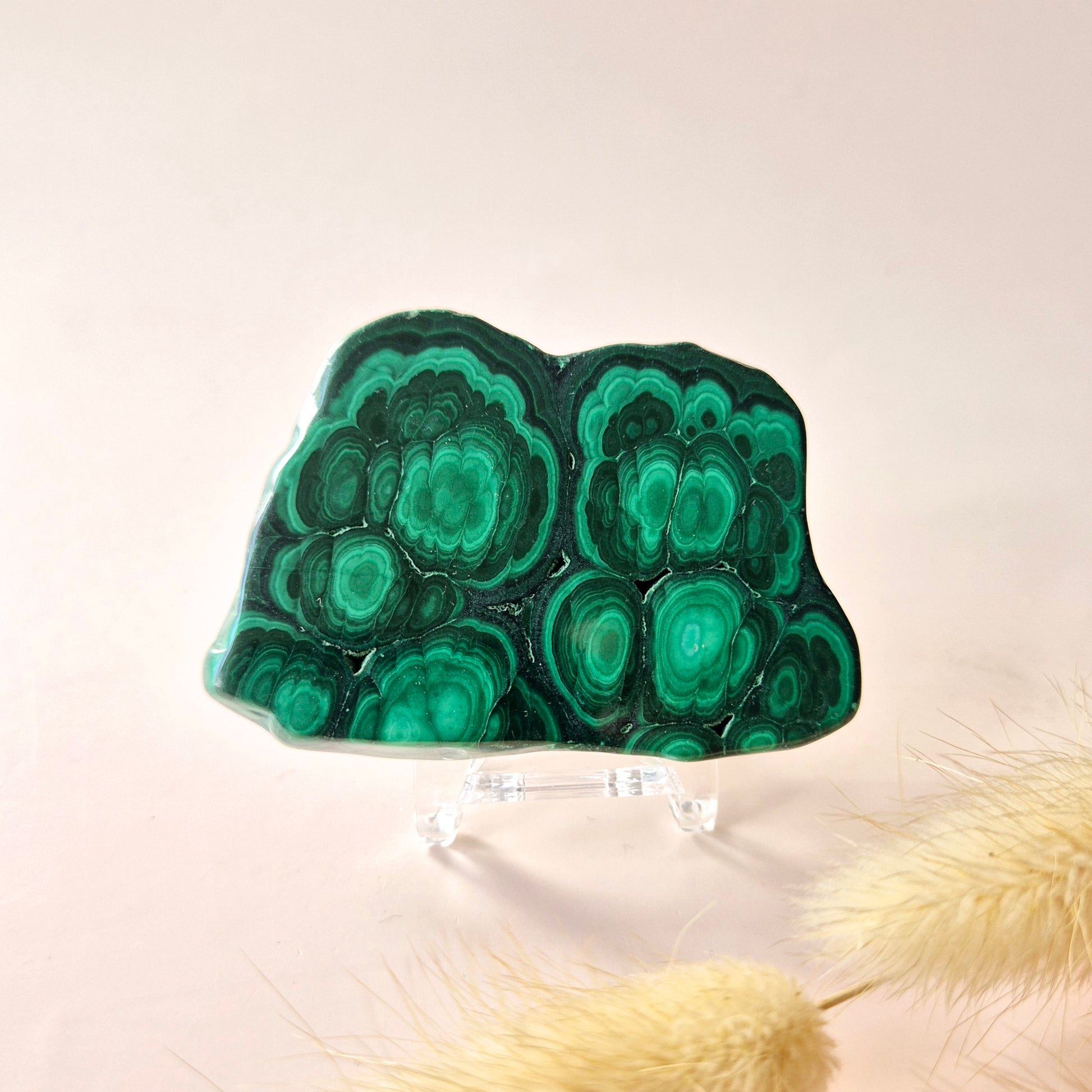 Deze hoogwaardige malachiet is zorgvuldig gepolijst aan één zijde en wordt geleverd met een transparante standaard, waardoor het een schitterend displaystuk is voor elk interieur of edelstenenverzameling.