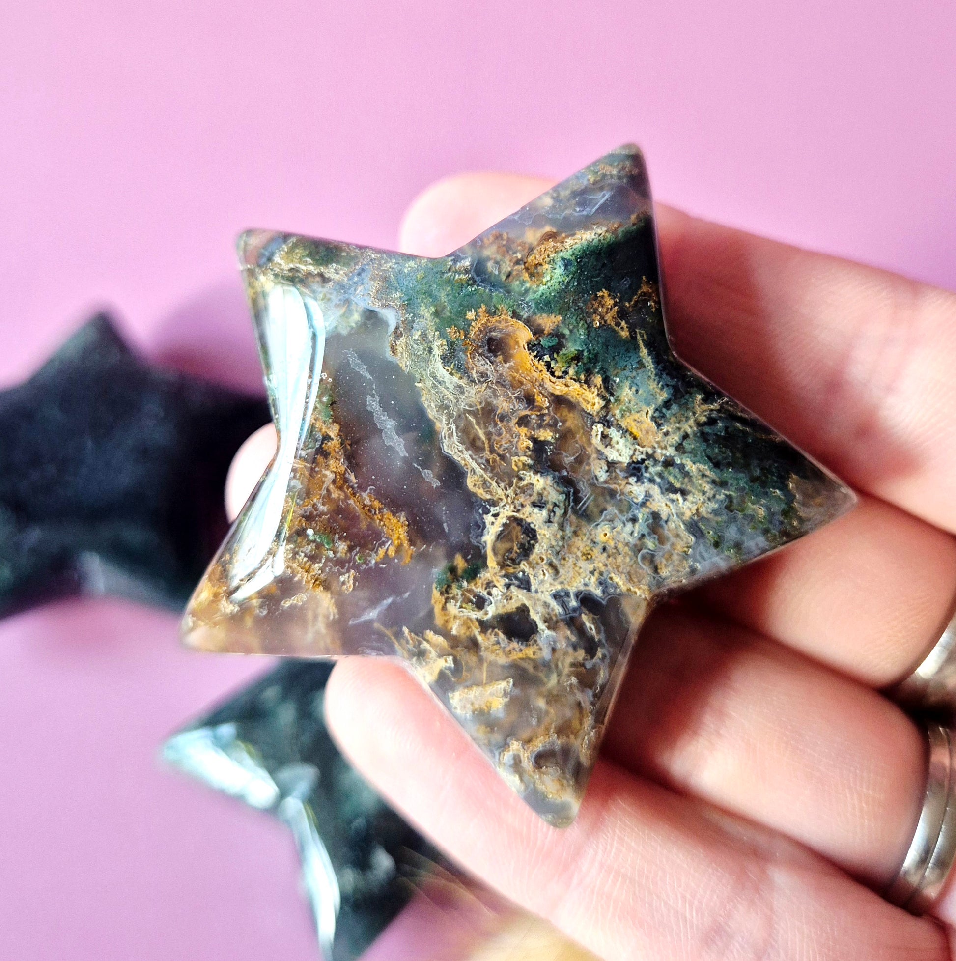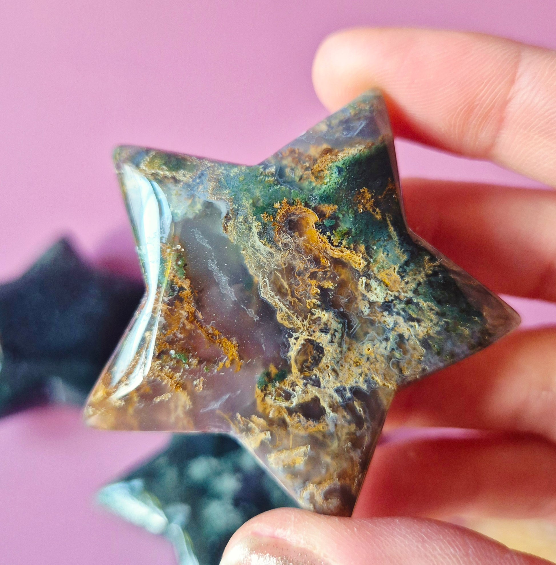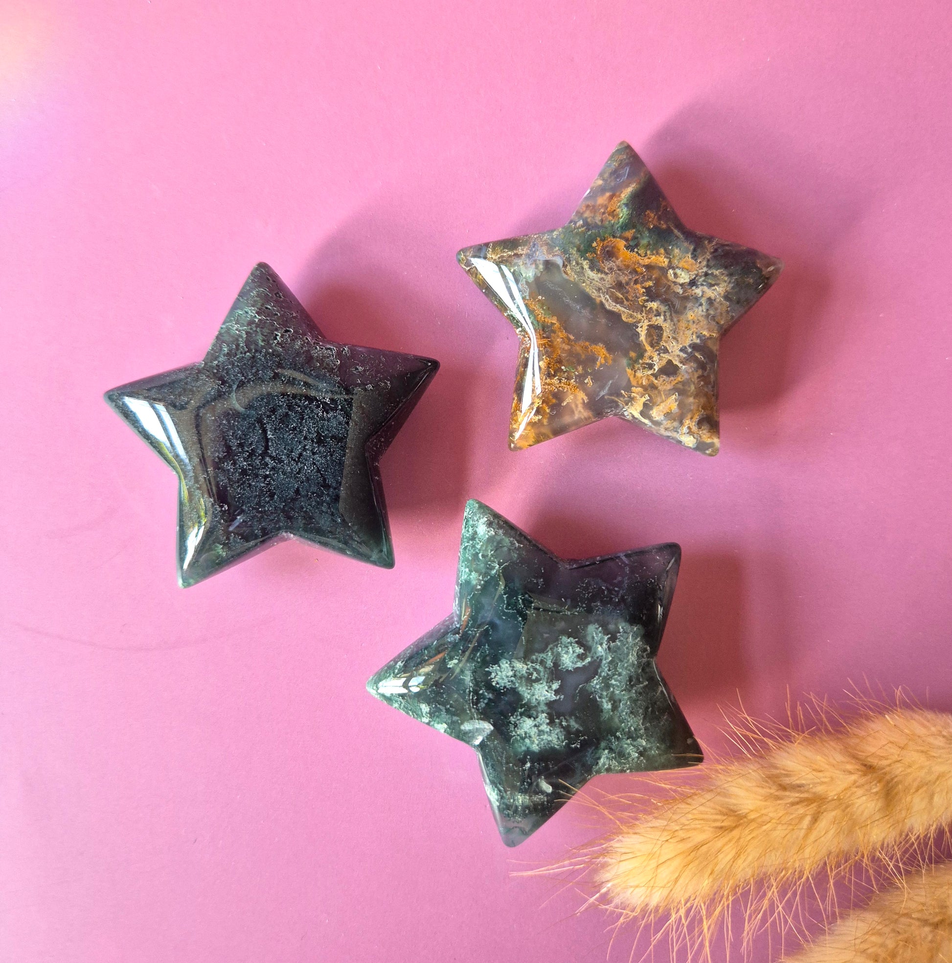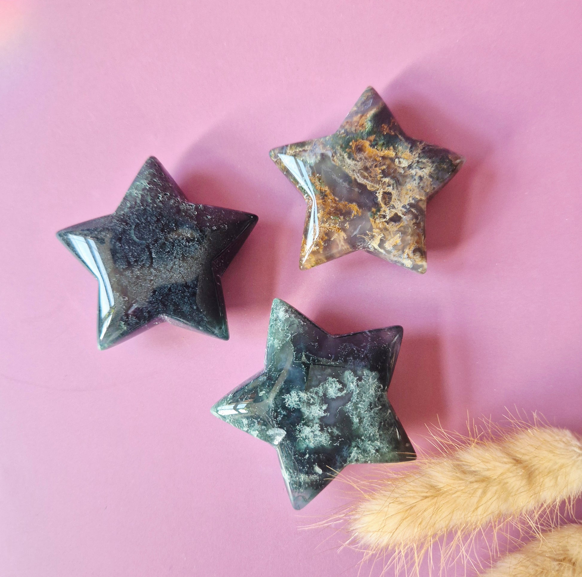 Mosagaat staat bekend als een steen van verbinding met de natuur, groei en stabiliteit. Hij werkt sterk aardend en helpt om rust te brengen bij stress, onrust of emotionele disbalans. Dankzij het compacte formaat is deze ster perfect om bij je te dragen, neer te leggen op een altaar of te gebruiken tijdens meditatie.