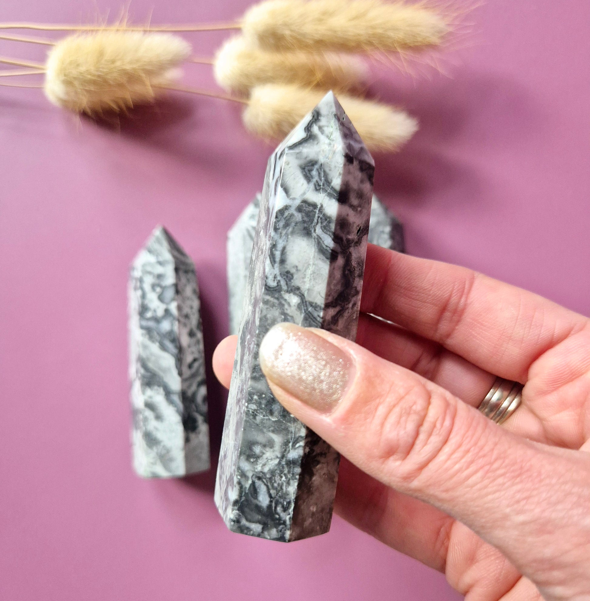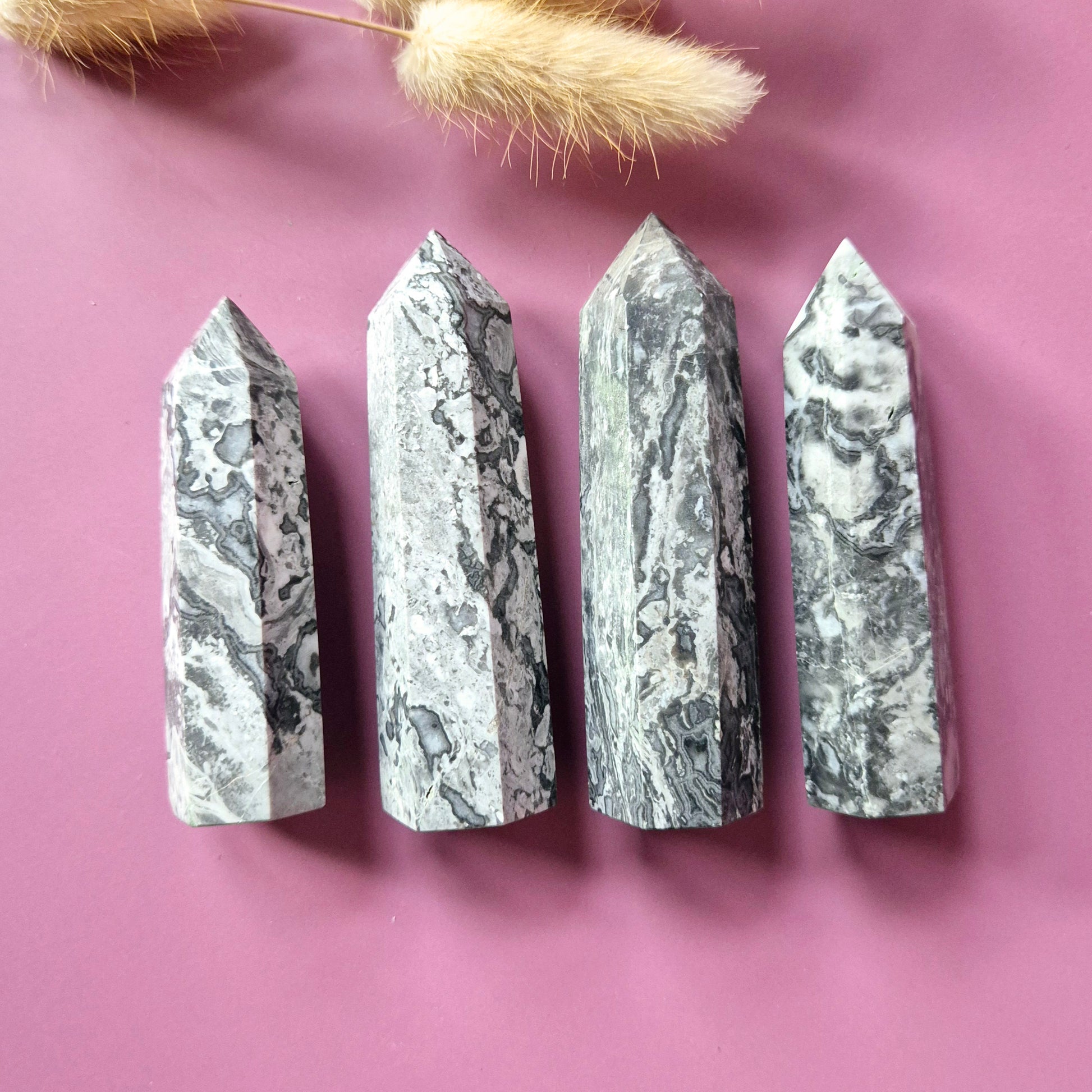Onze Picasso Jasper torens (7–9 cm) zijn unieke edelsteenpunten met prachtige grijstinten, zwarte penseelachtige lijnen en marmerachtige patronen. Geen enkele toren is hetzelfde — elke steen ziet eruit alsof hij met de hand geschilderd is, wat de naam Picasso Jasper eer aandoet.