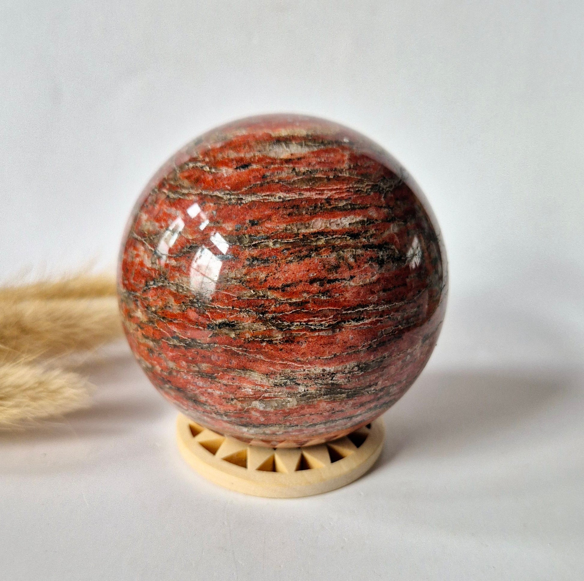Red Banded Jasper staat bekend als een stabilisierende en beschermende edelsteen. Ze ondersteunt bij focus, doorzettingsvermogen en het behouden van innerlijke rust, vooral in drukke of veeleisende omgevingen. Deze bollen zijn perfect voor een werkplek, praktijkruimte, meditatiehoek of als statement piece in huis.