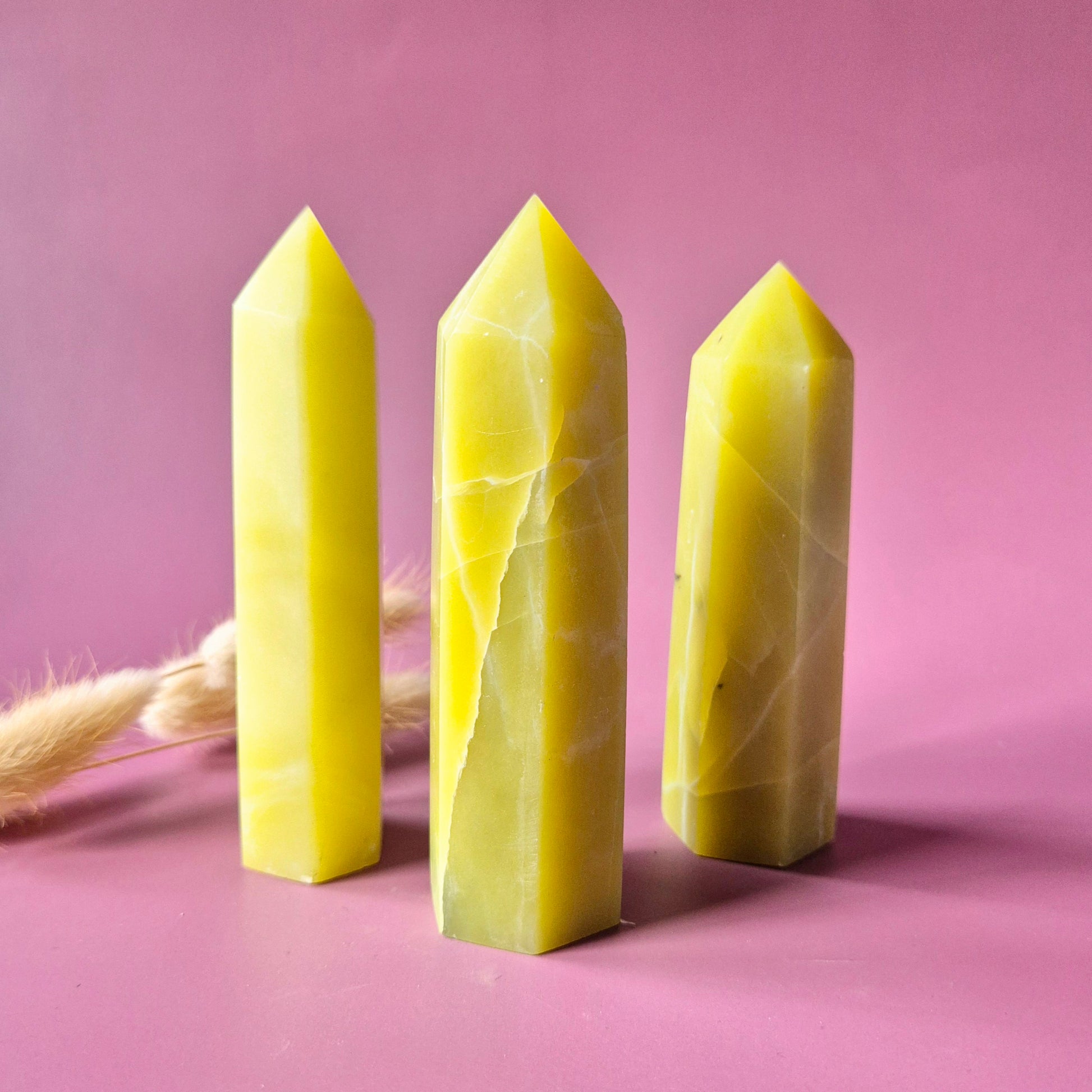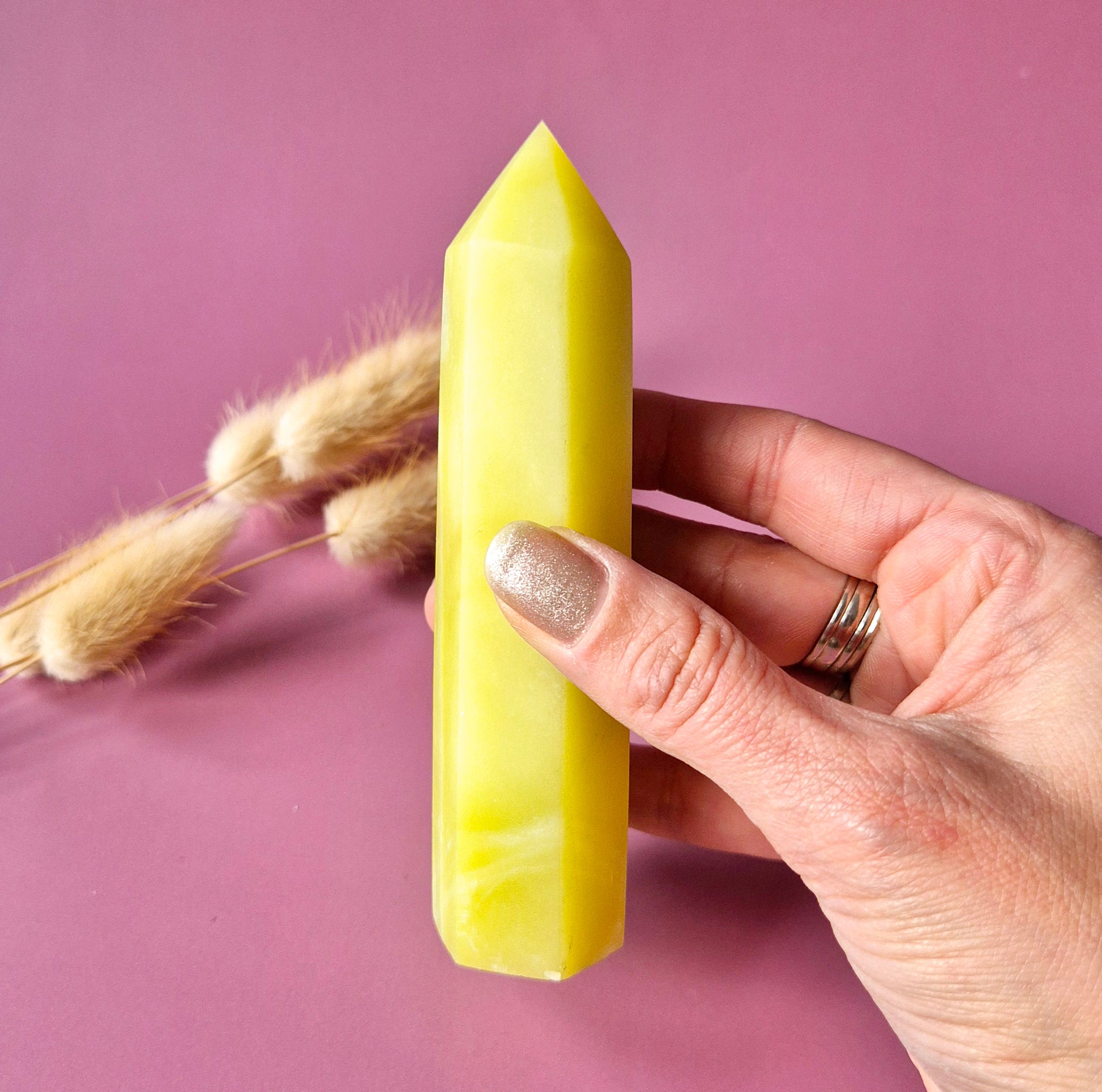Onze Serpentine torens (10–12 cm) zijn opvallende, helder gele edelsteenpunten met een zachte, zijdeachtige glans en natuurlijke aderpatronen. Serpentine is een traditionele beschermsteen met een krachtige, aardende energie. De levendige gele kleur geeft deze torens een uplifting uitstraling, perfect voor in huis, op je werkplek of in een healingruimte.