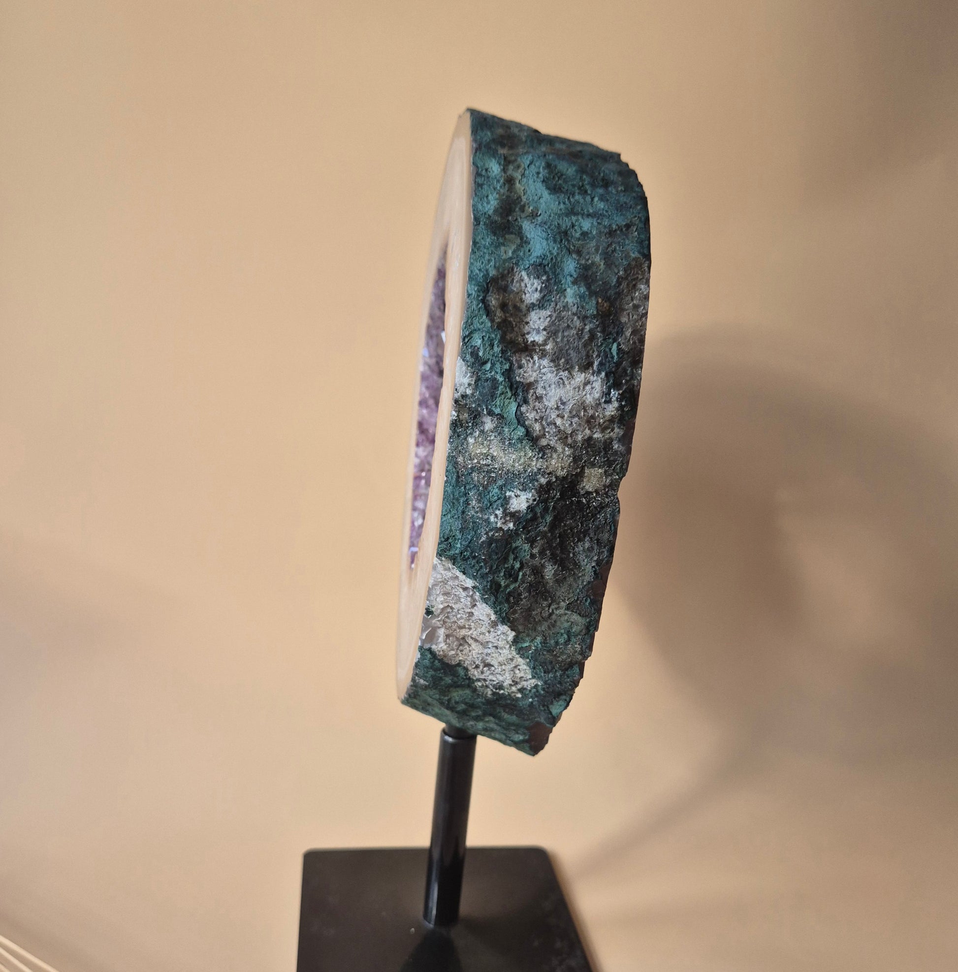 De metalen standaard wordt meegeleverd en tilt het geheel naar een hoogwaardig, gallery-waardig decorstuk dat in elke ruimte centraal staat. Door zijn zwaardere gewicht en dikkere rand is dit stuk niet alleen visueel krachtiger, maar ook energetisch aanwezig en uitzonderlijk zeldzaam.