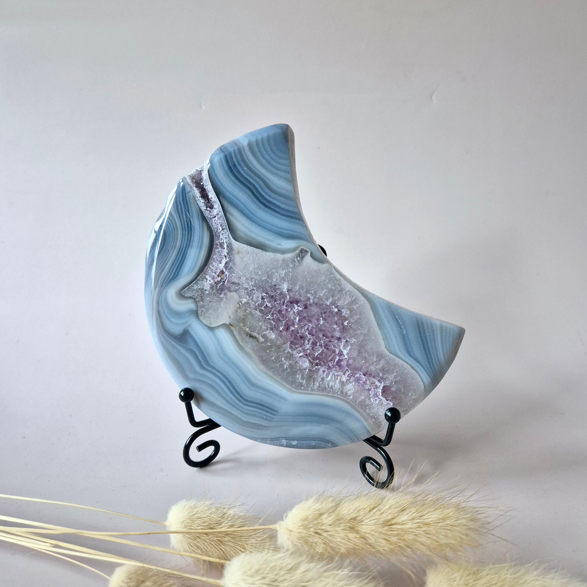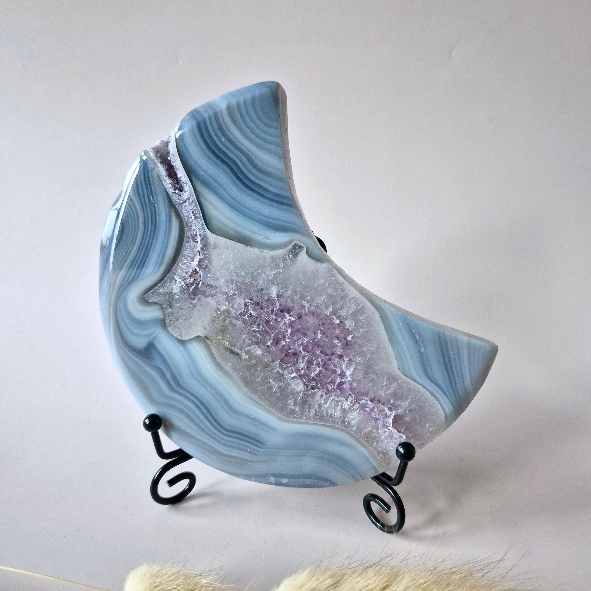 Grijze Agaat Maan met Druzy & Amethist Insluitingen – 13–15 cm (incl. metalen standaard) #4 286g
