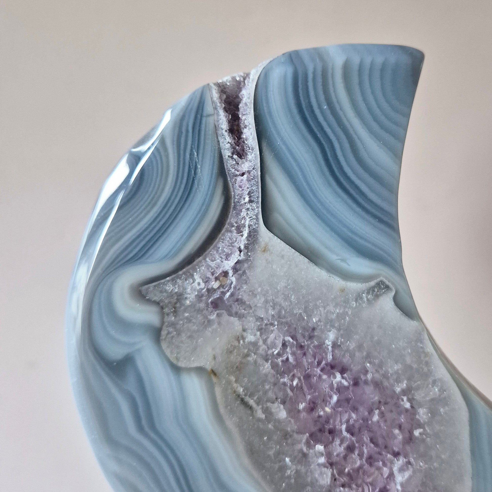 Deze handgeslepen maanvormige sculpturen van grijze agaat zijn ware blikvangers in elk interieur of altaar. De natuurlijke druzy kristallen schitteren subtiel in het licht en worden versterkt door prachtige amethist-insluitingen, wat elke maan een unieke uitstraling geeft. De edelsteen is gepolijst aan de buitenrand en toont een rauwe kristalstructuur in het midden – perfect in balans tussen verfijning en puur natuur.