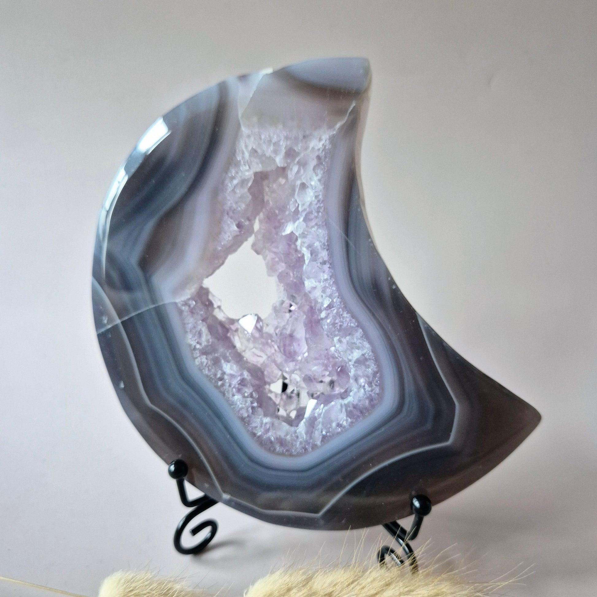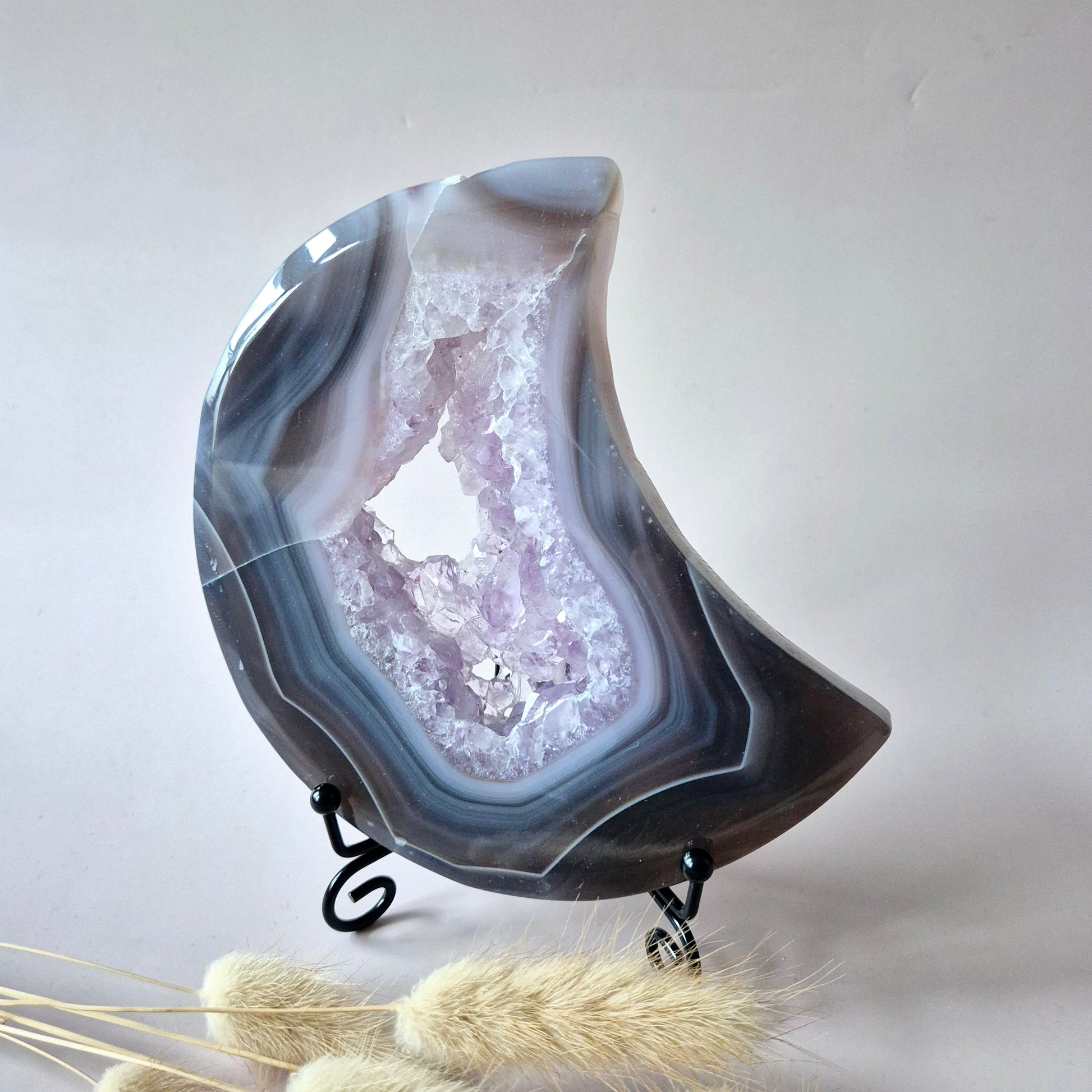 Grijze Agaat Maan met Druzy & Amethist Insluitingen – 13–15 cm (incl. metalen standaard) #6