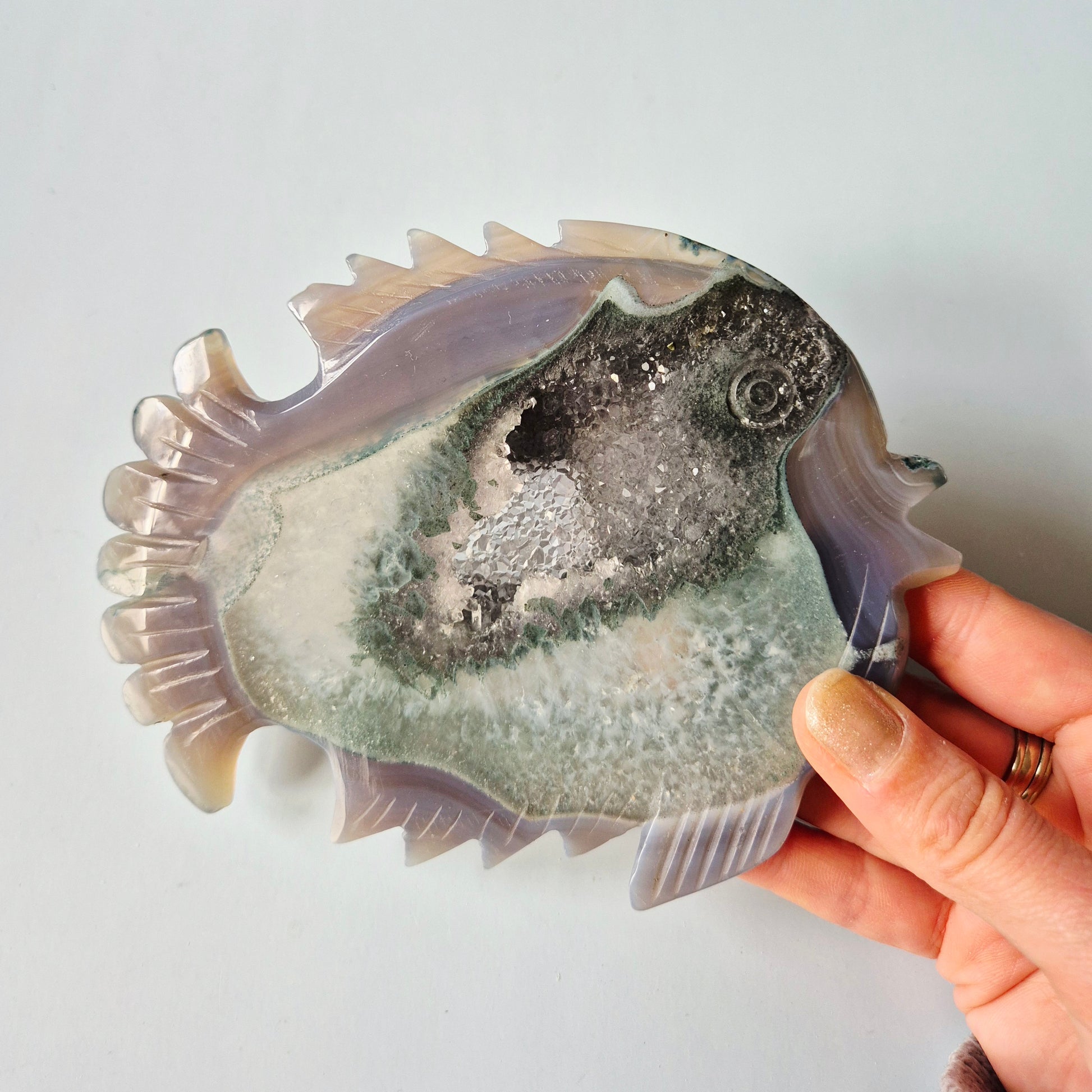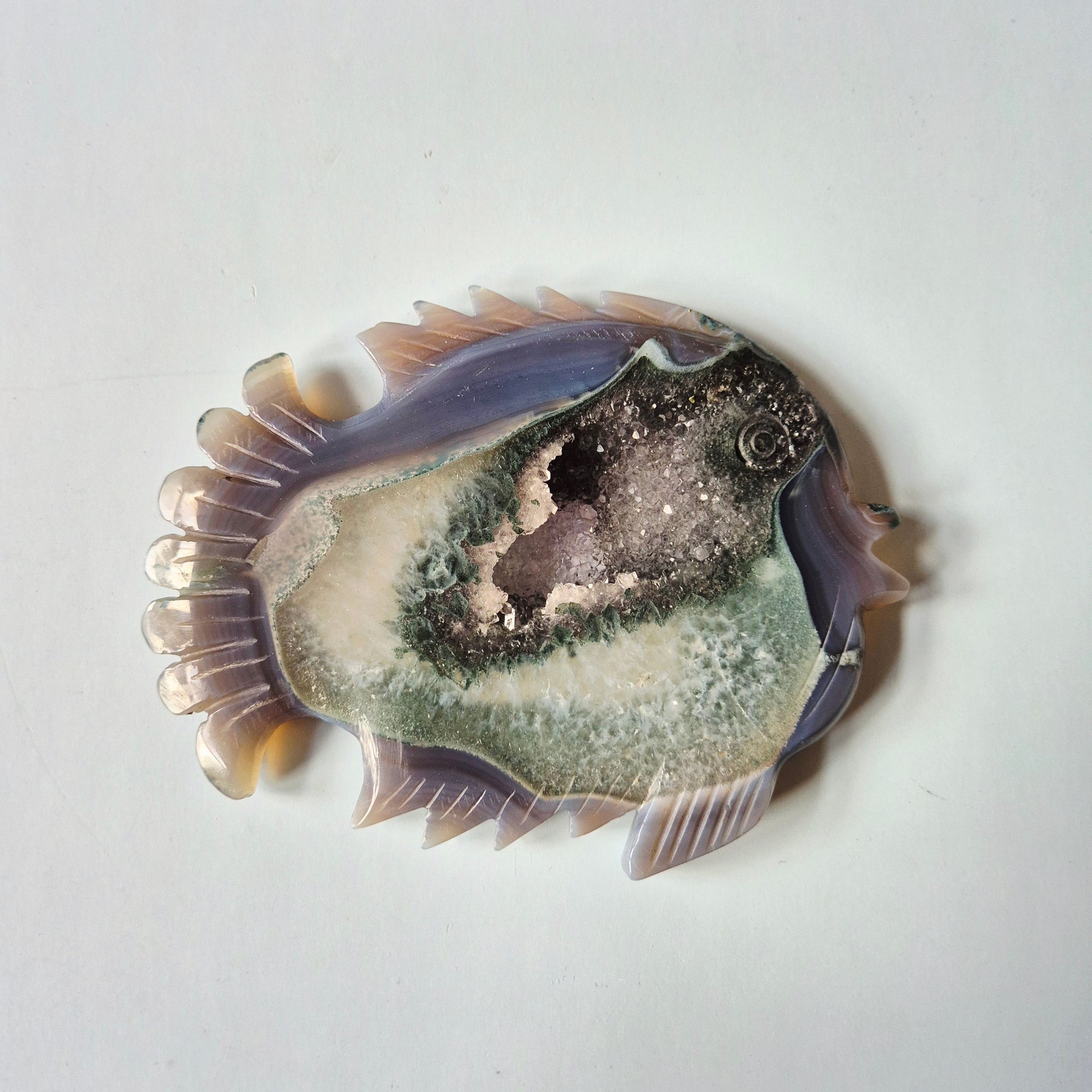 Deze unieke Grijze Druzy Agaat Vis carving is een handgesneden statement piece van 11,7 x 8,8 cm en 189 gram. De natuurlijke agaatbanden in grijs, zacht lila en mosgroen omlijsten een prachtige open druzy kristalkern, die subtiel fonkelt in het licht.