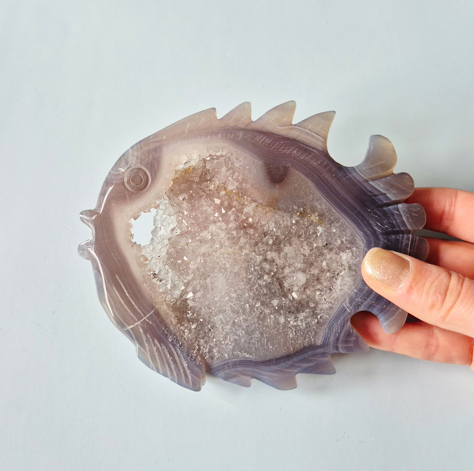 Deze unieke Grijze Druzy Agaat Vis carving is een handgesneden statement piece. De natuurlijke agaatbanden omlijsten een prachtige open druzy kristalkern, die subtiel fonkelt in het licht.