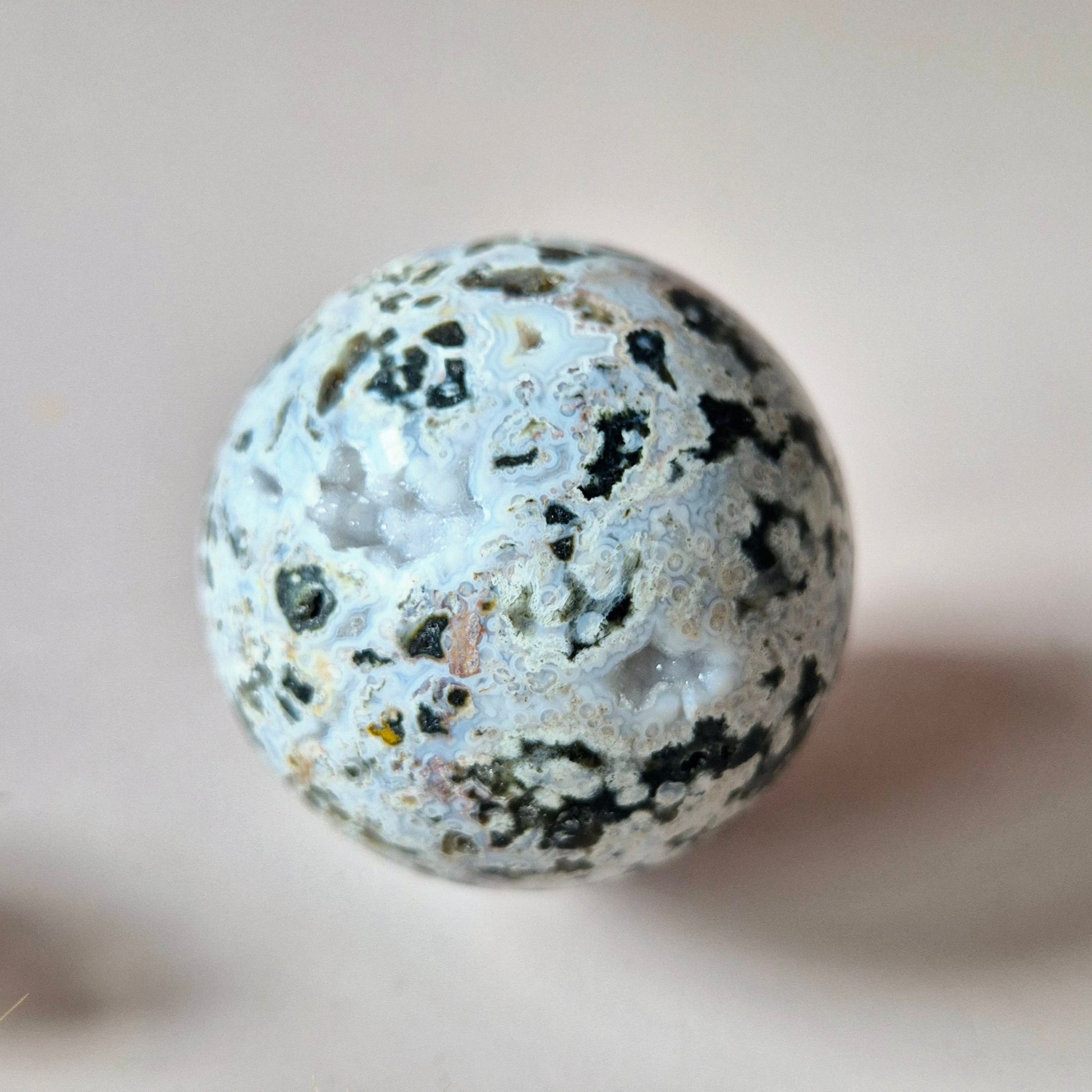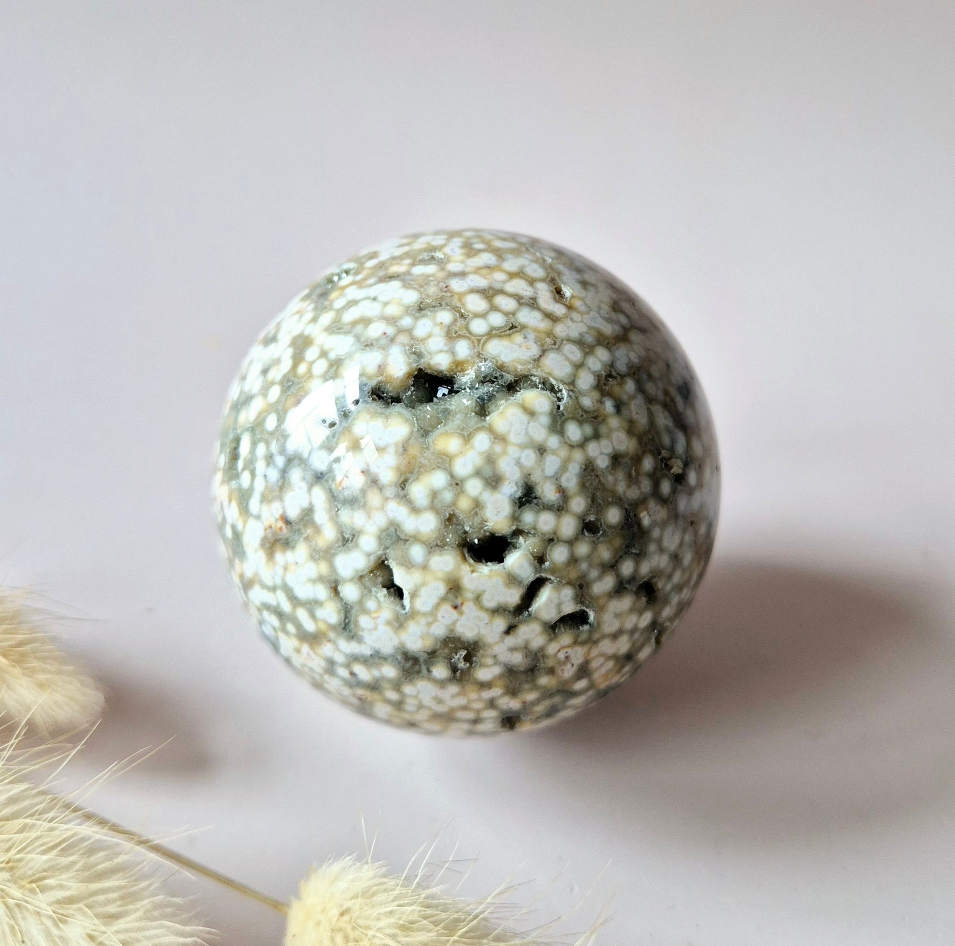 Voeg een oceaan van rust toe aan je collectie met deze premium Ocean Jasper bollen. Elk stuk is met zorg gepolijst en toont unieke patronen, van stipachtige patronen tot natuurlijke druzy holtes die schitteren in het licht. Deze bollen zijn van hoge kwaliteit en voelen zwaar en solide aan, met een doorsnede van 50–60 mm.
