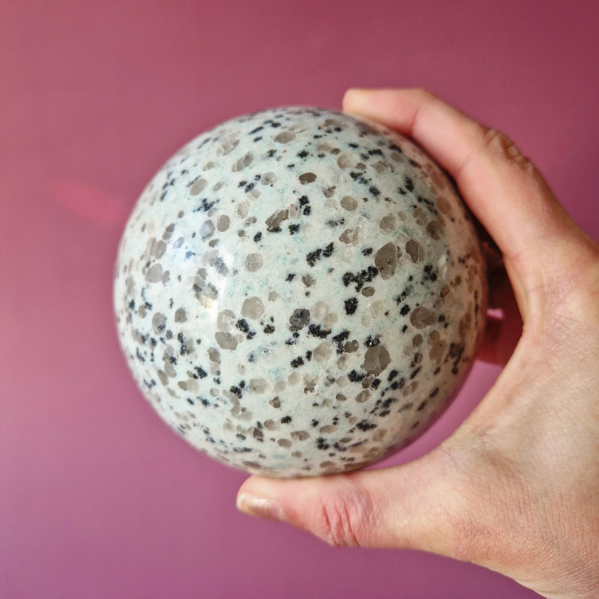 Deze extra grote Kiwi Jaspis bol van 100 mm en maar liefst 1455 gram is een krachtig én zacht statementstuk. De steen heeft een rustgevende mintgroene basis met natuurlijke grijze en zwarte spikkels, wat zorgt voor een kalme, aardse uitstraling die perfect past in zowel spirituele ruimtes als moderne interieurs.