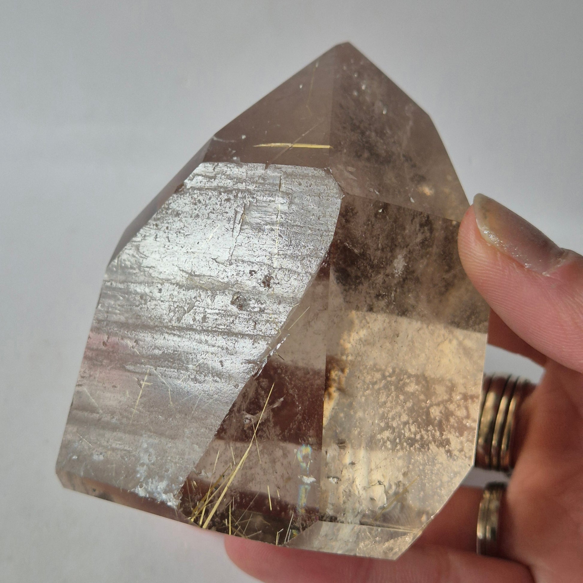 Deze zeldzame Lemurian Smoky Quartz met Golden Rutile uit Brazilië is een indrukwekkend en krachtig kristal van 401 gram. De steen heeft een zachte rokerige transparantie waarin fijne gouden rutielnaalden zichtbaar zijn die door het kristal lopen als delicate lichtdraden.