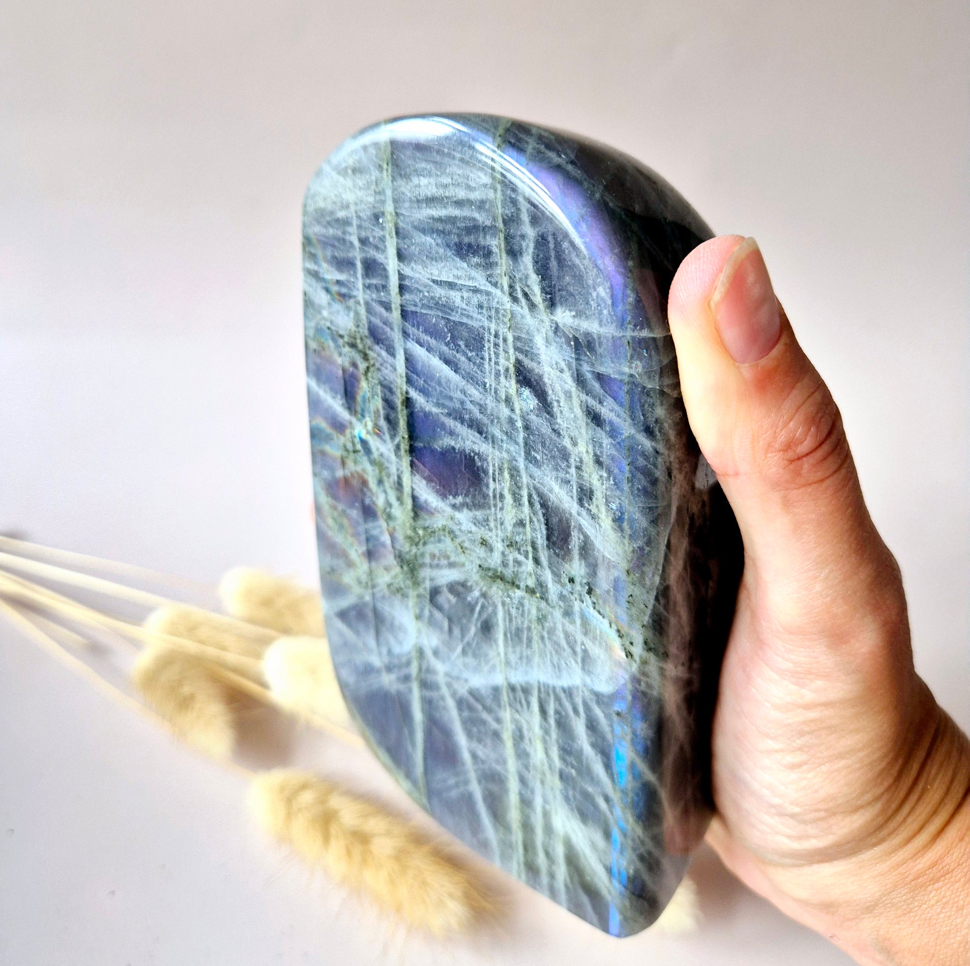 Ontdek de magie van deze unieke Labradoriet freeform van 880 gram met een adembenemende paarse flash. Labradoriet staat bekend als de steen van transformatie en bescherming, en deze zeldzame paarse variant straalt een bijzondere mystiek uit. Met een glad gepolijste afwerking en krachtige reflecties is dit stuk perfect voor op je altaar, interieur of kristallenverzameling.
