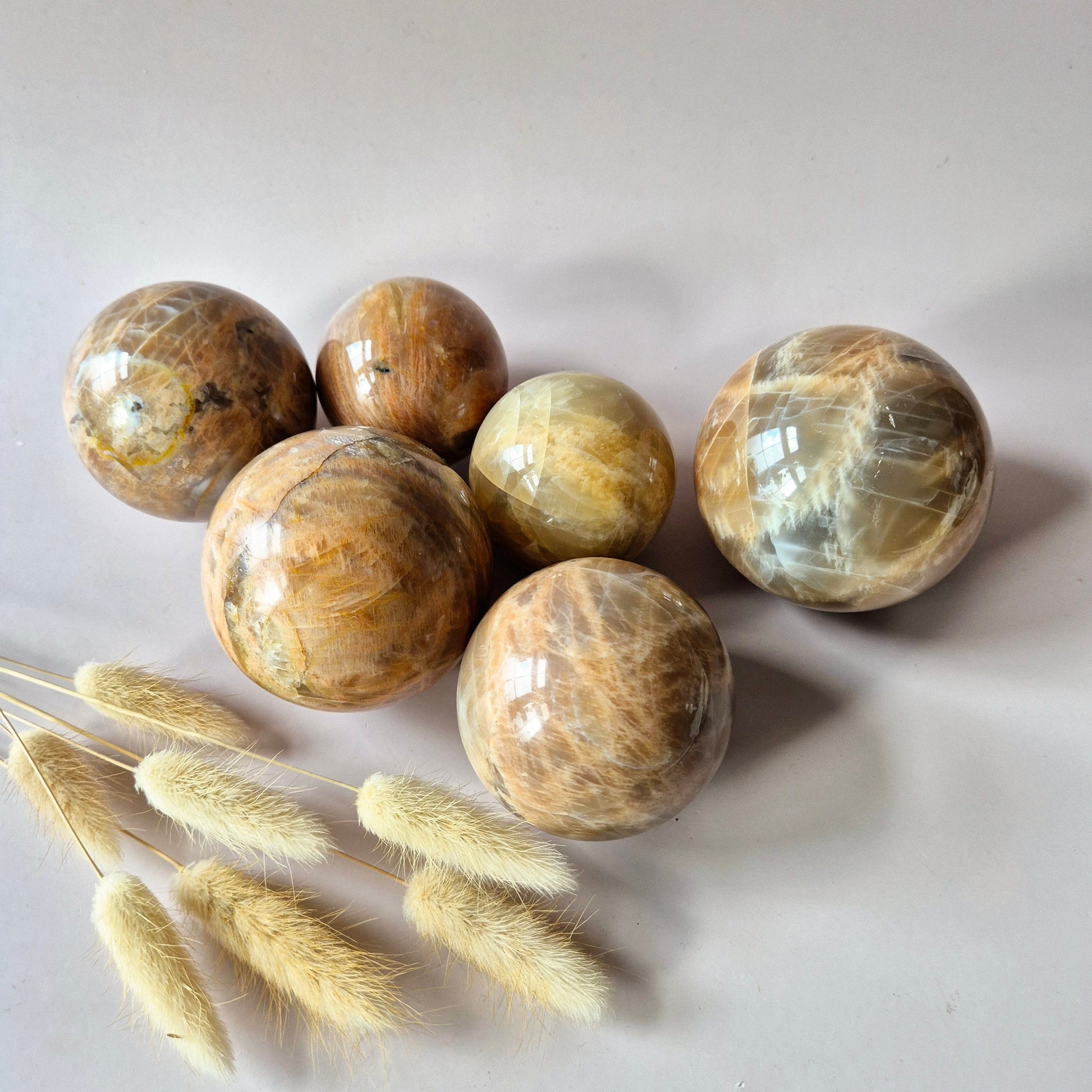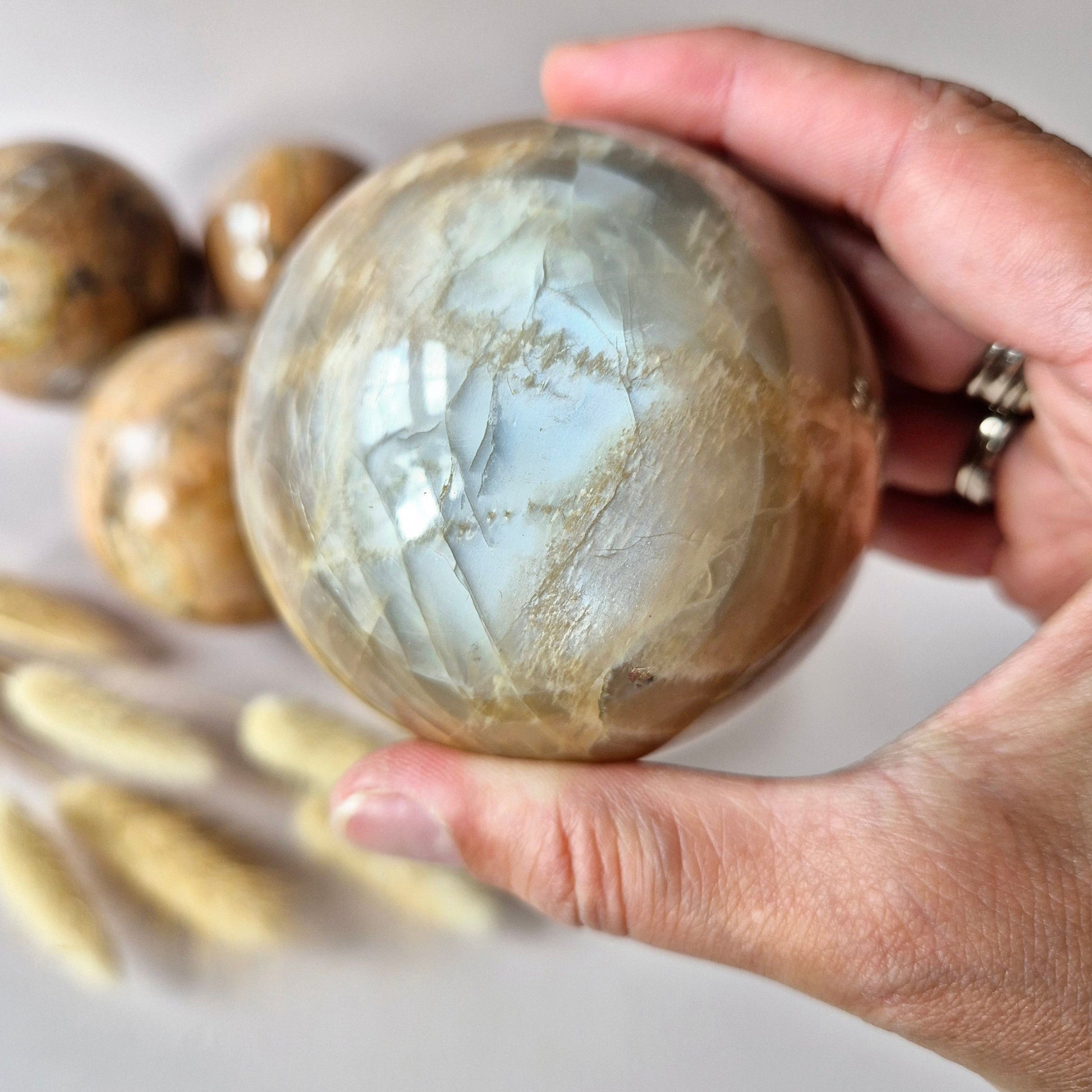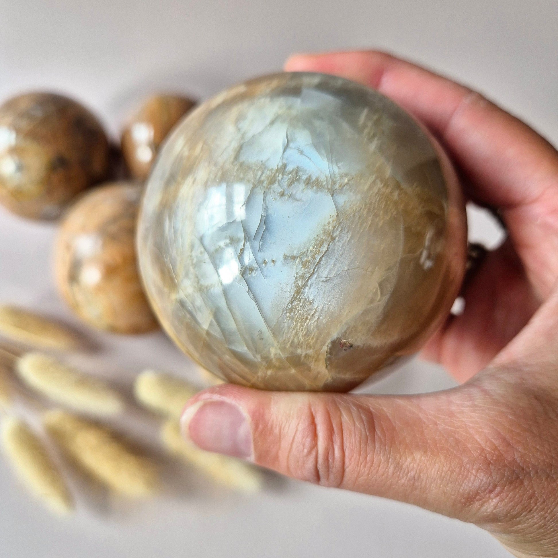 Deze Peach Moonstone bol straalt een zachte perzikgloed uit en laat een subtiele zilverachtige shimmer zien wanneer het licht erop valt. Moonstone staat bekend als steen van intuïtie en vrouwelijke energie. Perfect voor meditatie, healing of als decoratief statementstuk in huis.