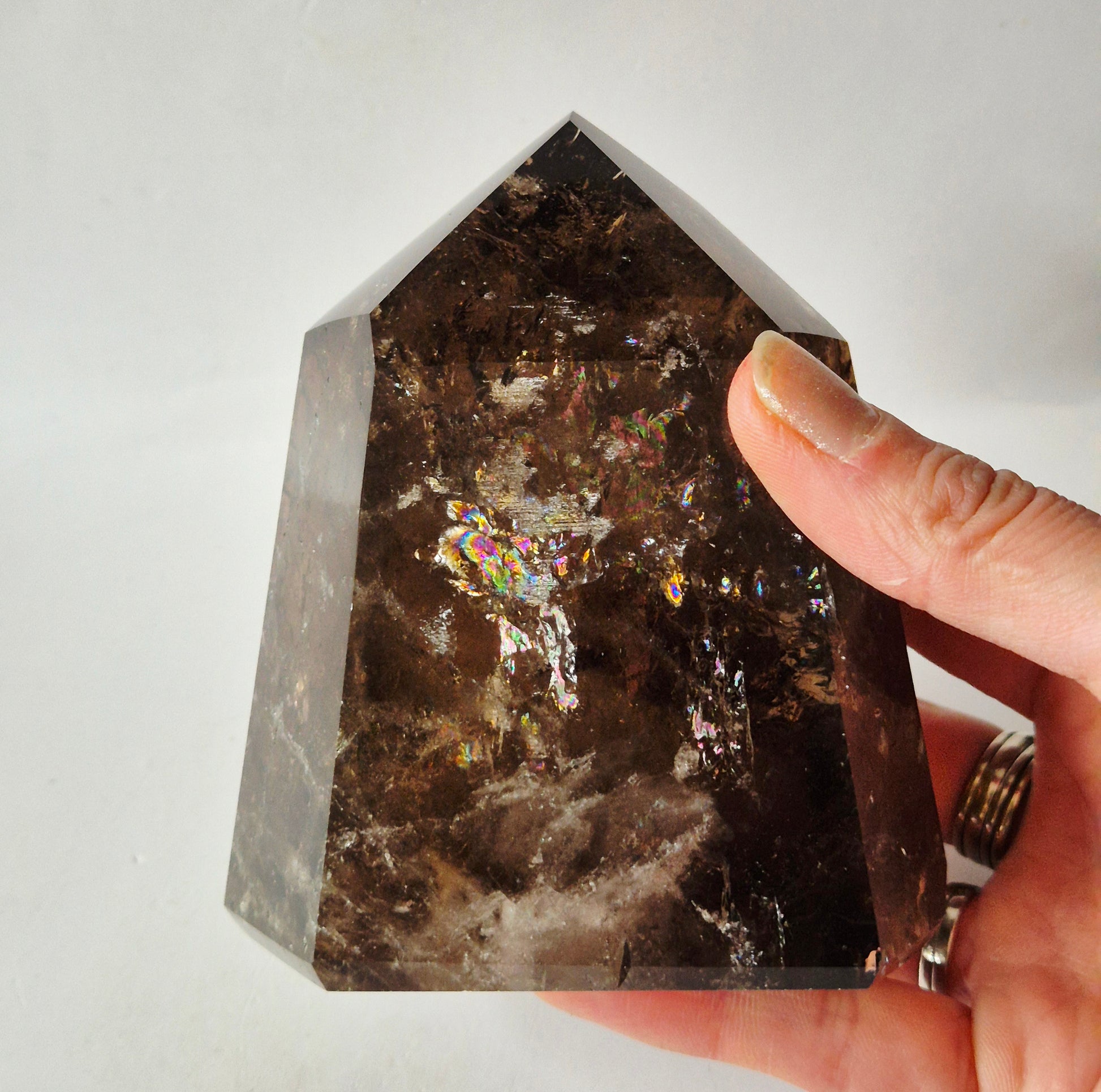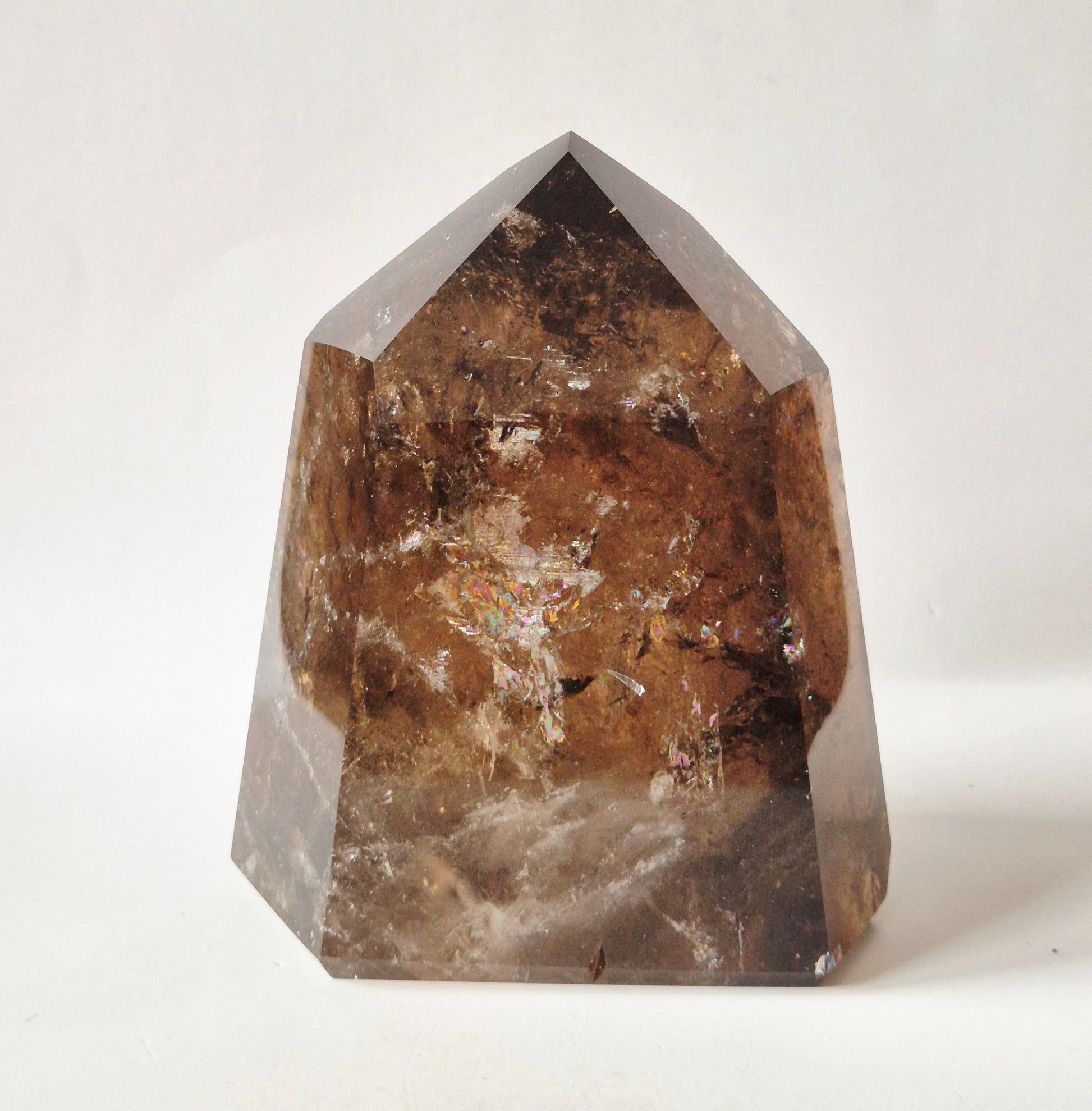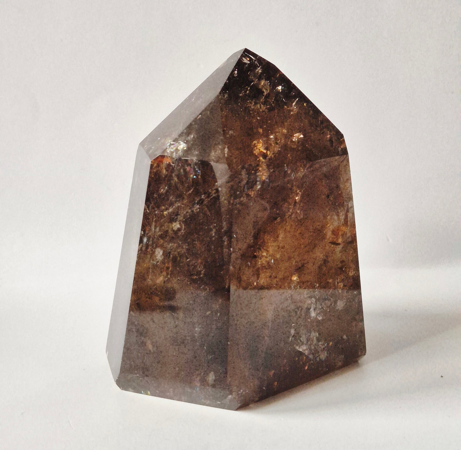 Deze indrukwekkende rookkwarts toren van 642 gram heeft een warme, diepe cognacbruine kleur met prachtige natuurlijke insluitsels en interne structuren die zichtbaar worden in het licht.