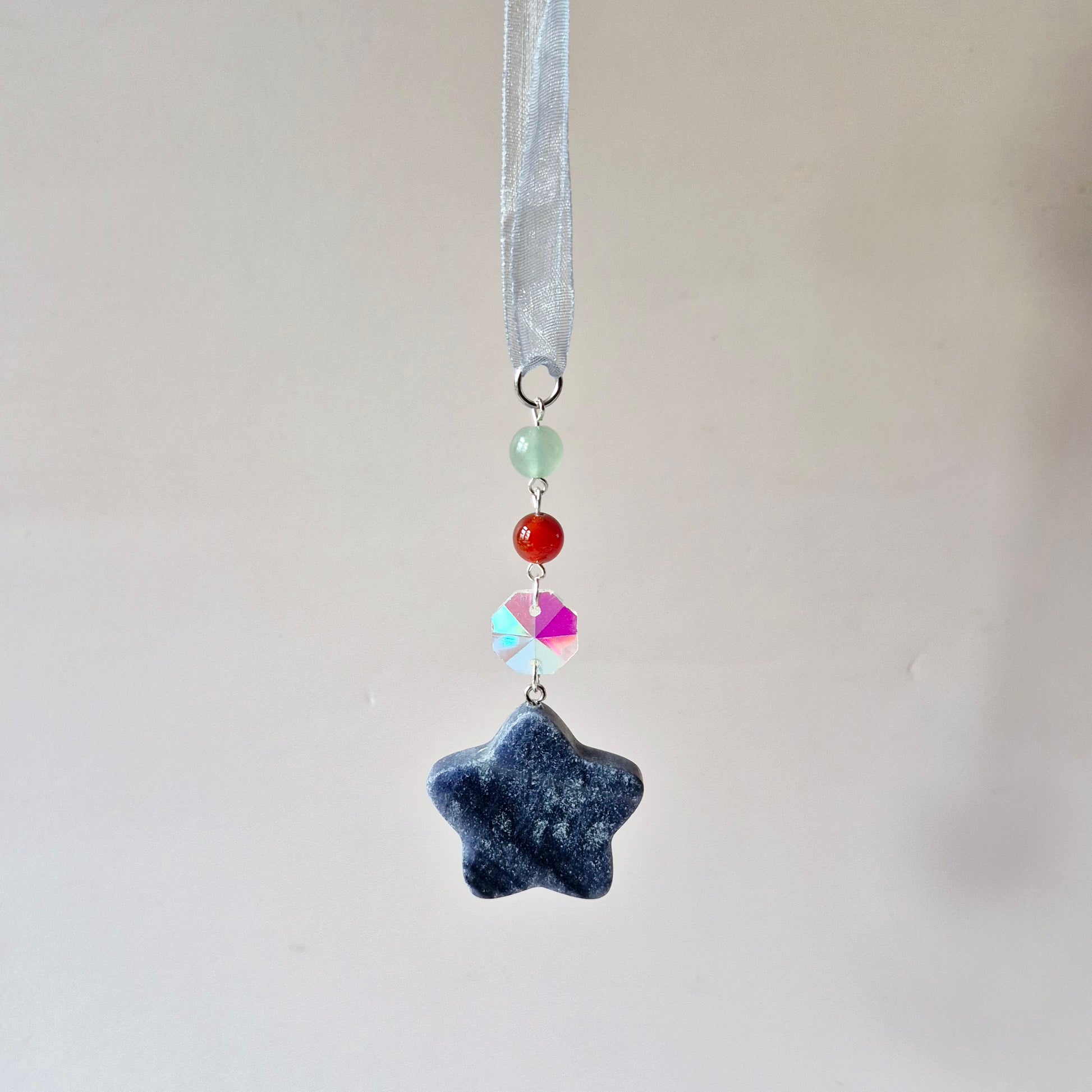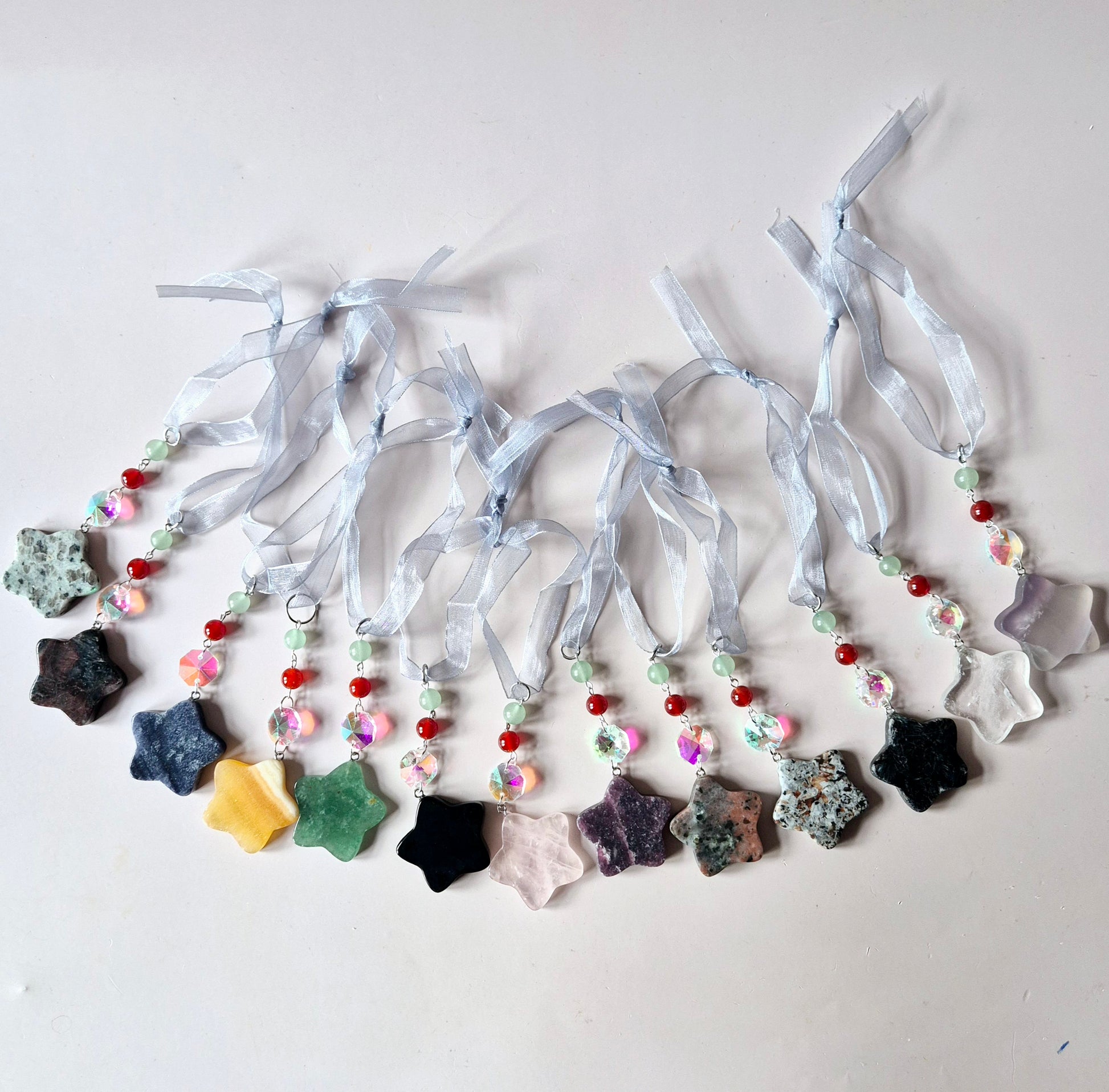 Breng een magische en sprankelende sfeer in huis met deze handgemaakte edelsteen kerststerren. Elke hanger is gemaakt van een natuursteen ster, gecombineerd met fonkelende kralen en een lint om gemakkelijk op te hangen in de kerstboom, bij het raam of als sfeervolle decoratie.